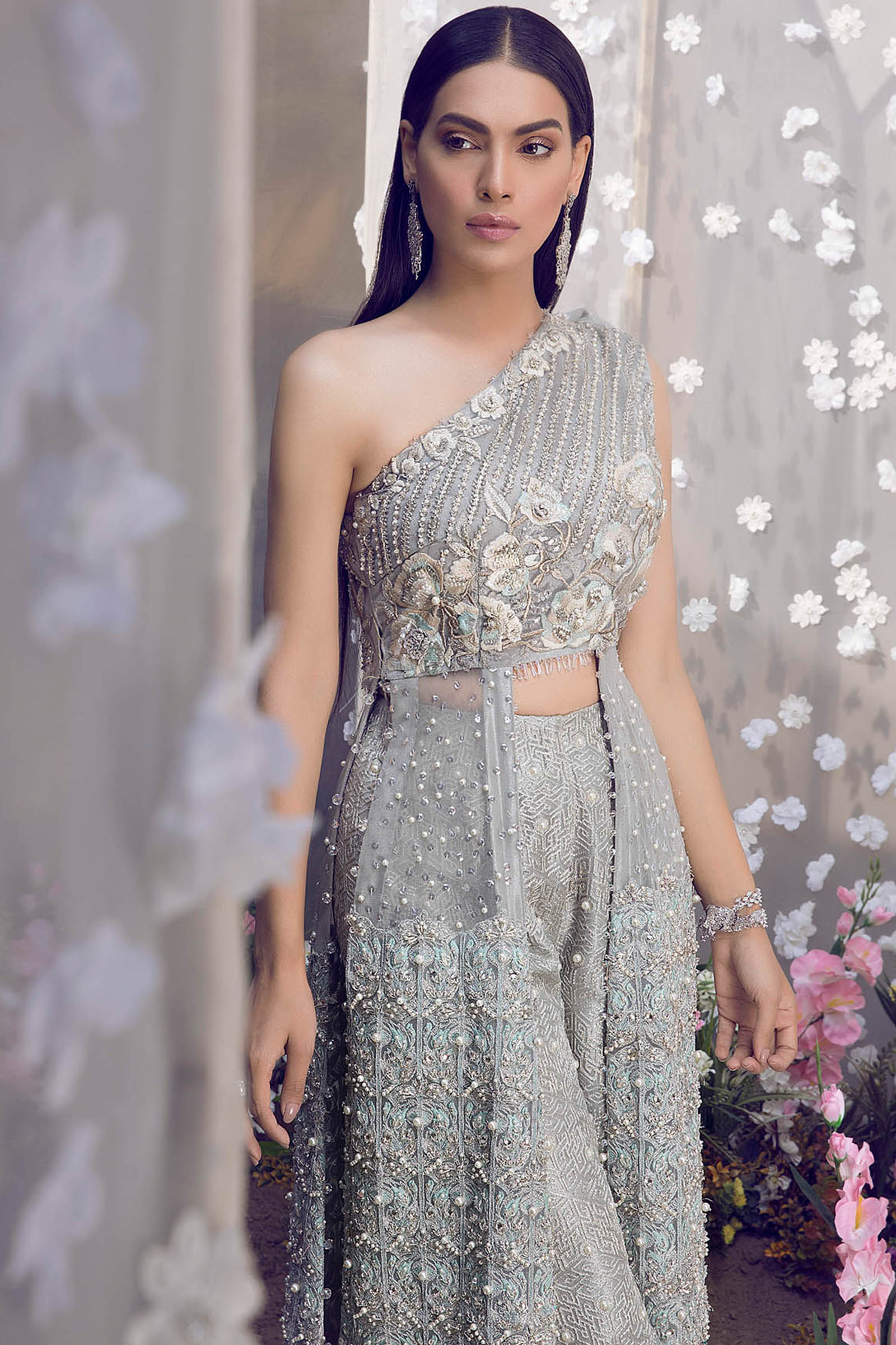 Aab-e-zar is a sheer opulence of artfully crafted floral embellishments and pearls with intricate trimmings.This ice blue beauty is a perfect attire to glam up your wedding game, which exudes nothing but timeless elegance and luxuriousness.