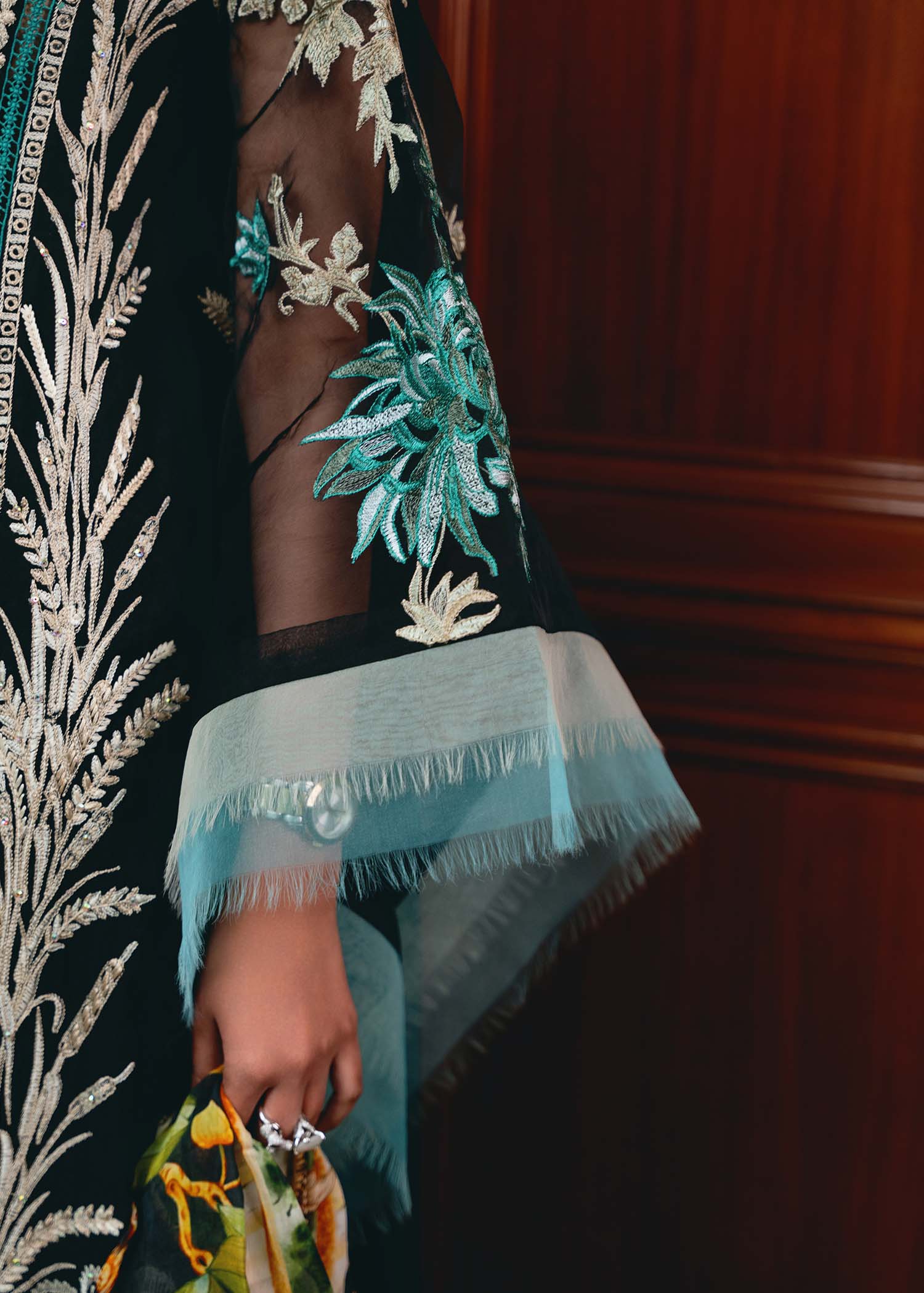 This exquisitely designed black ensemble masterfully created by Shiza hassan features rich floral adornment that is precisely designed, along with an elegantly embroidered and intricately detailed neckline. The sleeves are adorned with embroidery and organza detailing in true SH Couture Fashion masterfully paired with alluring viscose pants and a silk digital print dupatta with block printed palo to create a perfect look.