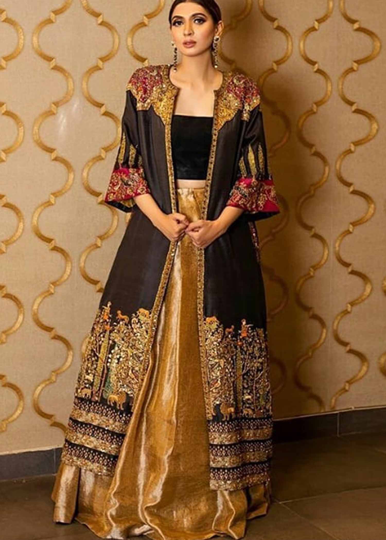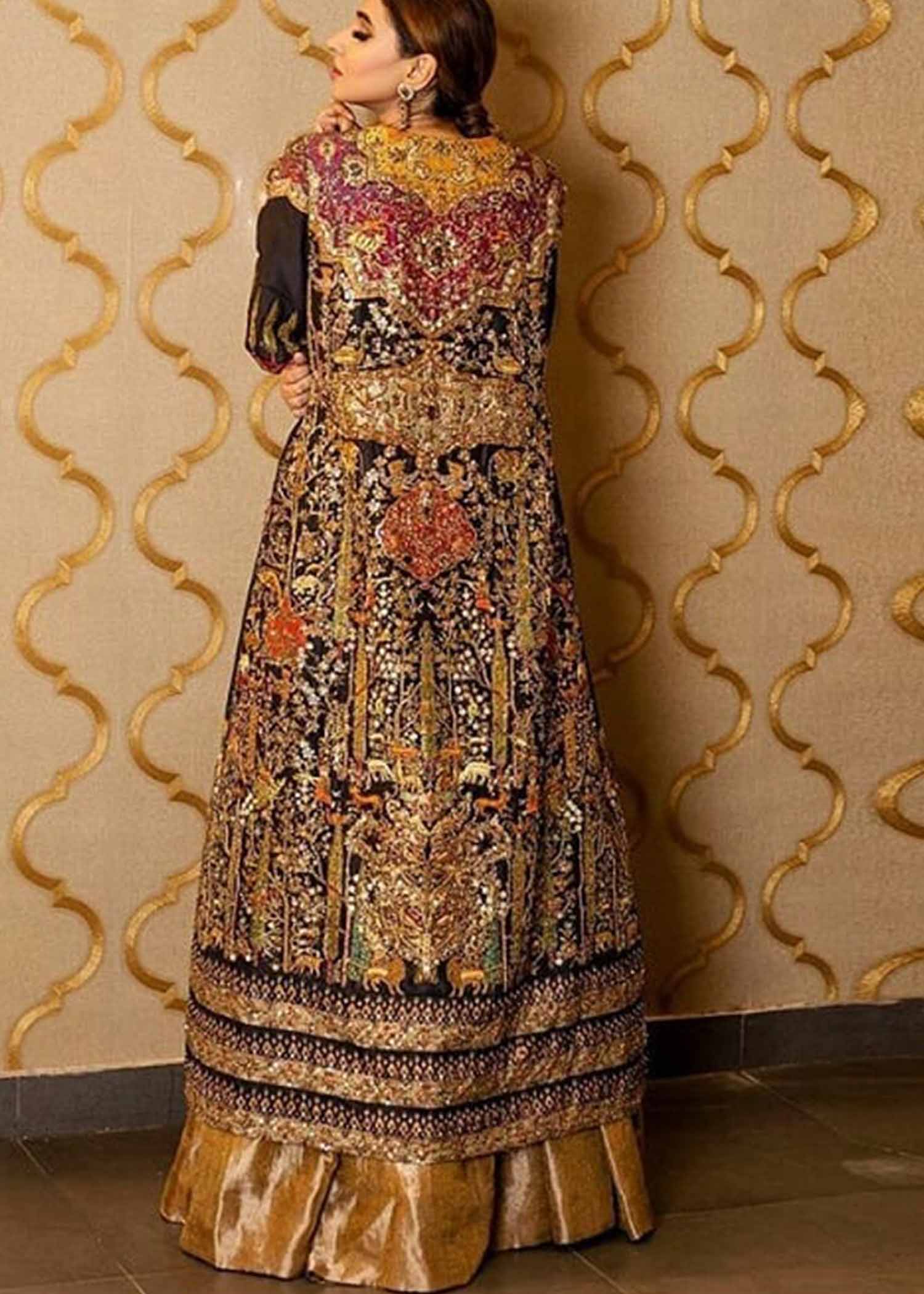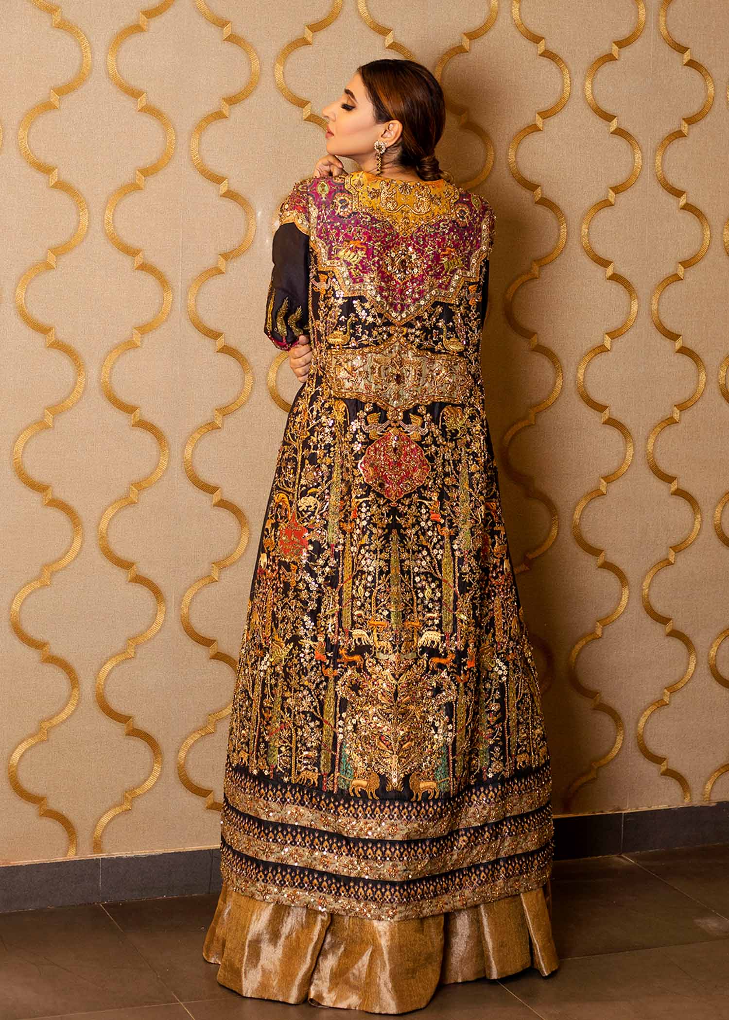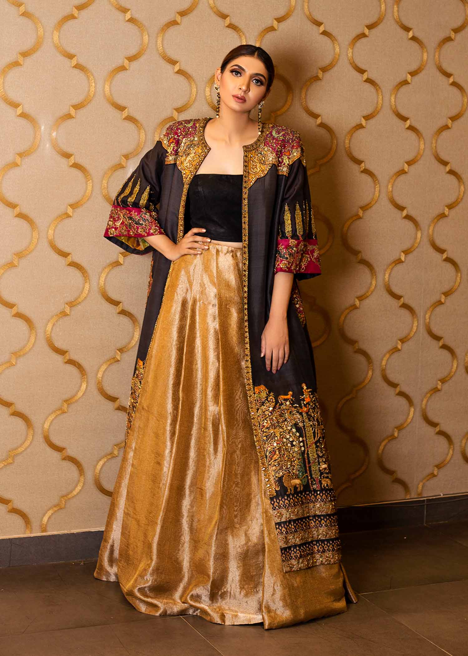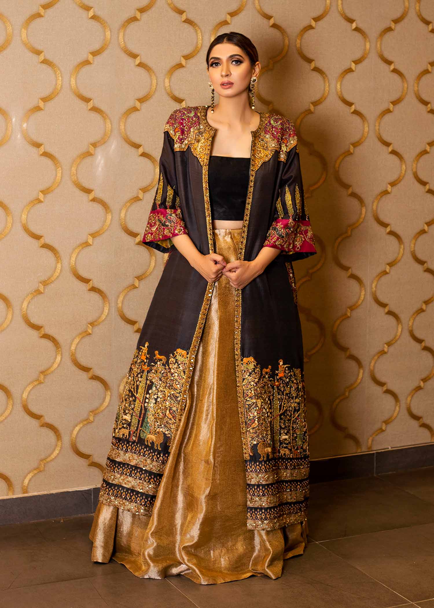 Indulge In Persian Shikargah Prints With Shiza Hassan's Black Shikargah Ensemble From Our Signature Print Collection. Pure Raw Silk Jacket, A Velvet Blouse And The Exquisite Jamawar Lehnga -The Epitomeof Sophistication And Style .