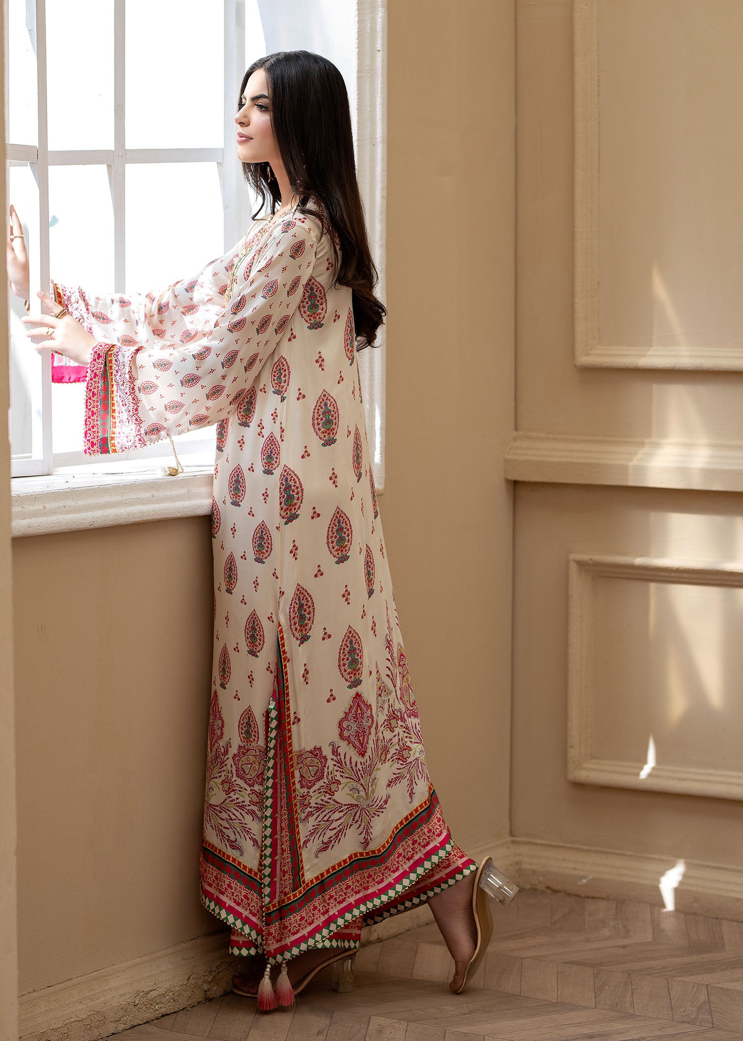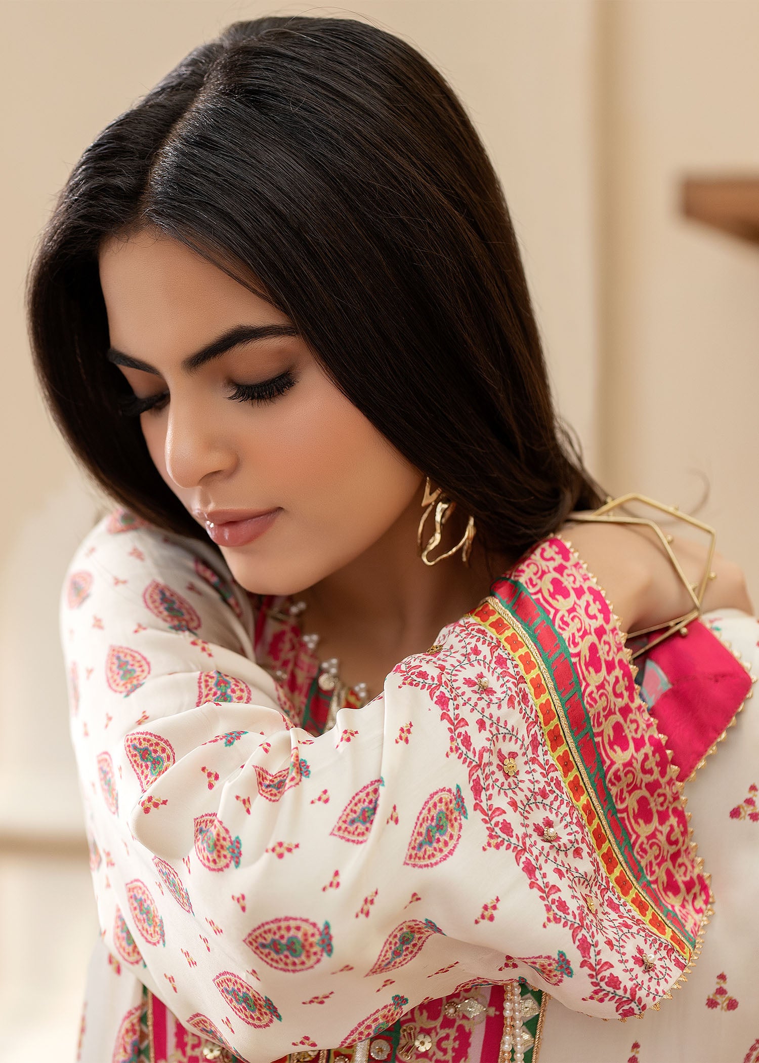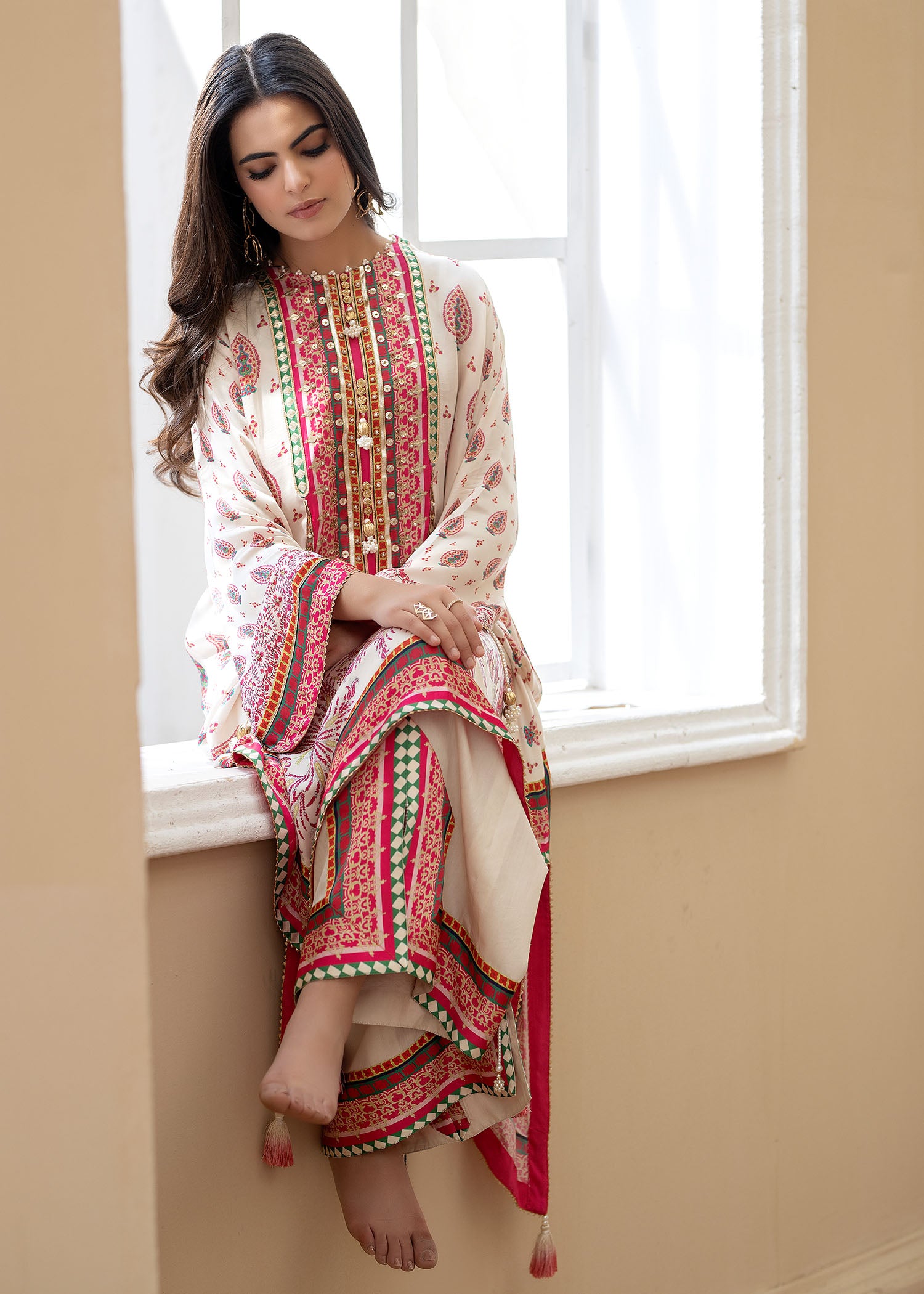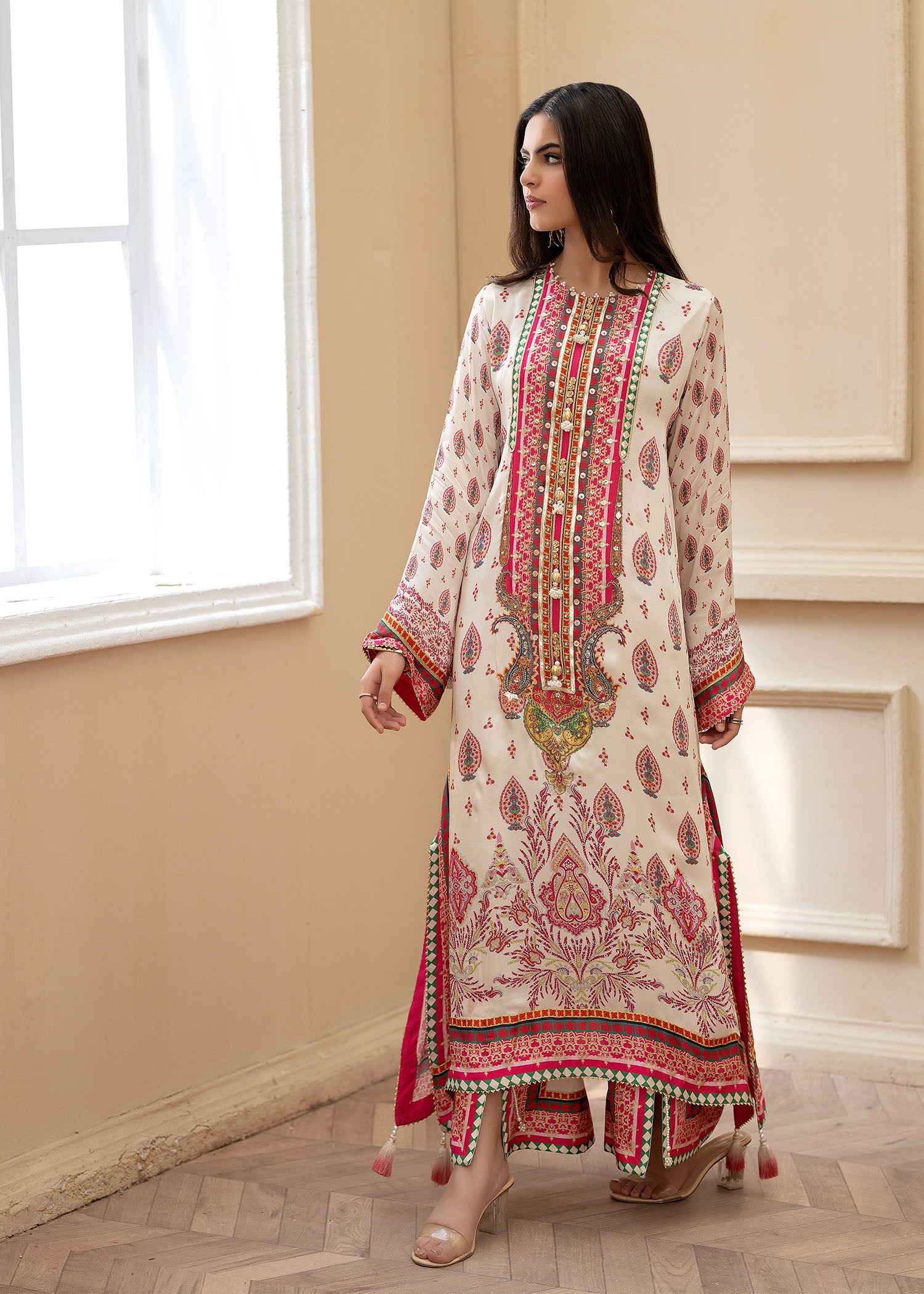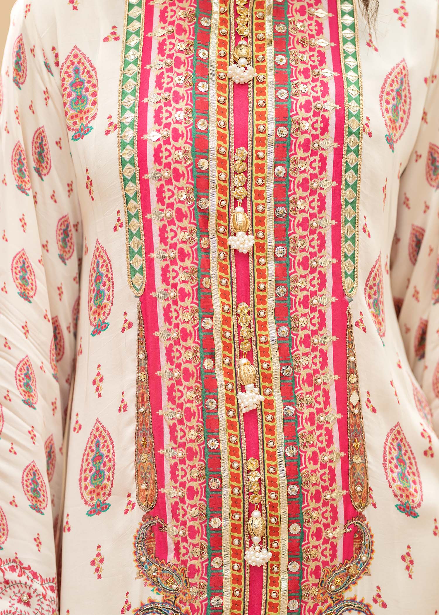Discover elevated, refined prints created in-house with immaculate tailoring and steal the show this festive season! A canvas of lovely ivory pure satin silk is artfully illustrated with a gorgeous shocking pink print. The relaxed, much loved silhouette has a universally flattering neckline, adorned with delicate hand-made floral motifs, pearls and sequins. Finish the look with our viscose coordinated pants (as pictured)