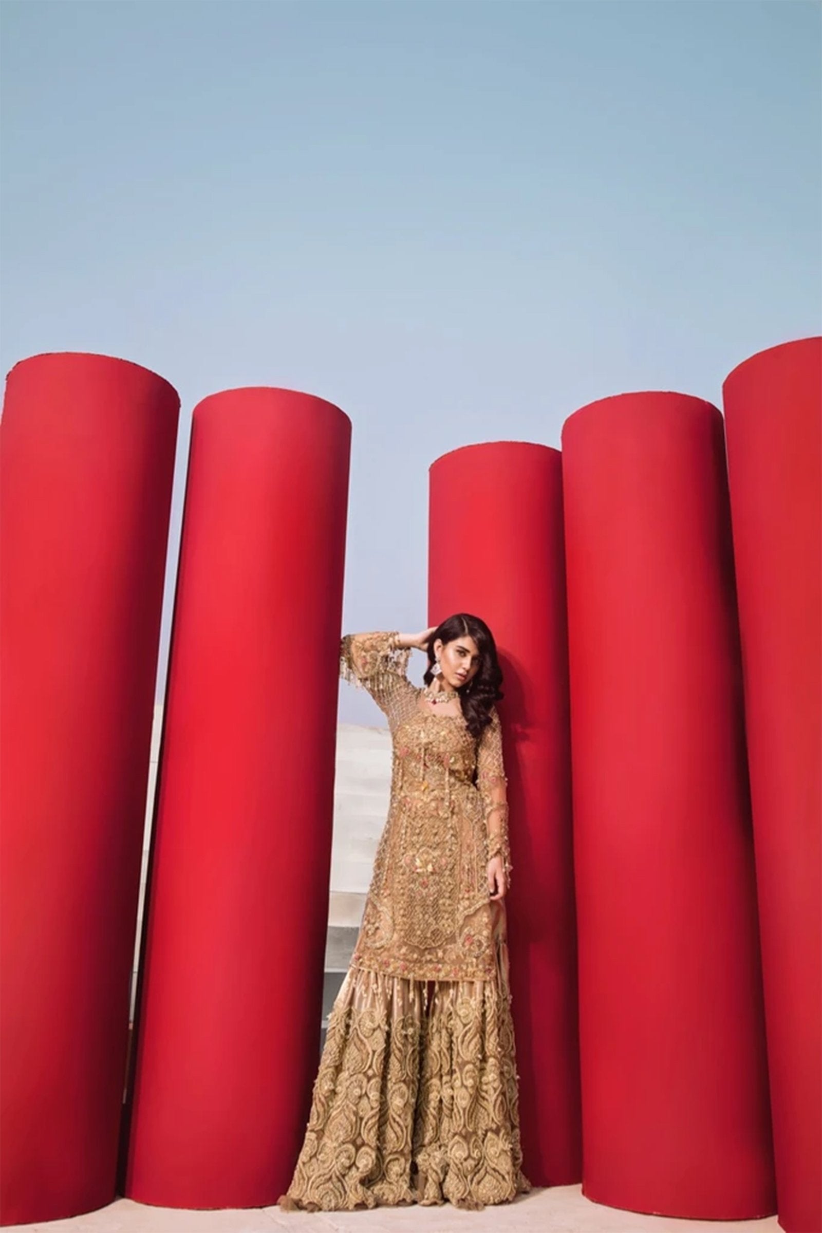 Blush enchantress is a long straight shirt with a gharara in pink and champagne hues. With a jewelled neckline, the shirt is with full handwork, our signature Swarovski, zardozi, dabka, naqshi, pearls and 3D jewel embellishments. Sleeves are straight with an inner side slit featuring all hand work. Gharara is embroidered in gold with intricate pearl work Dupatta is a lama with net and border with fully handcrafted delicate artistry.