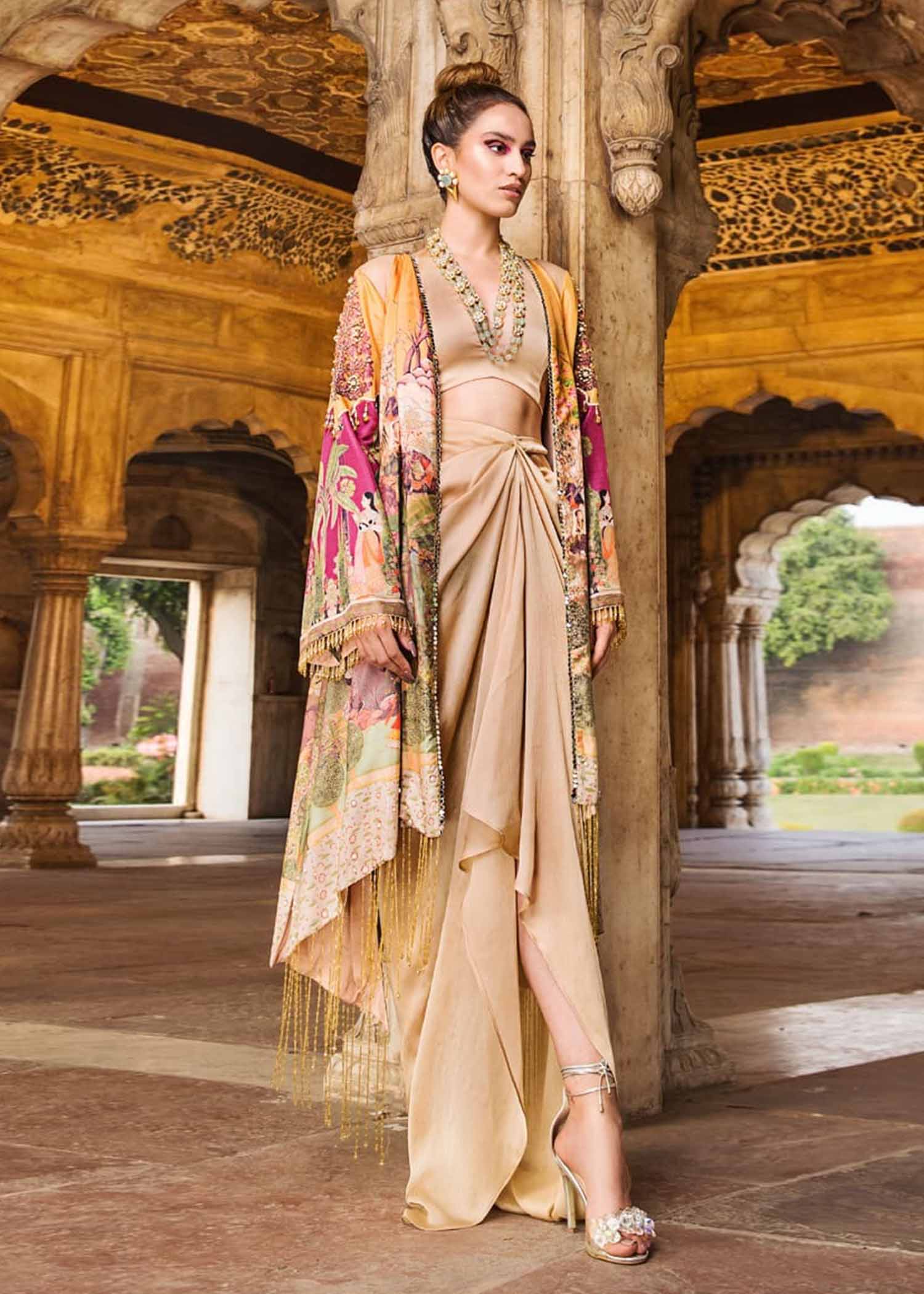 Pure Raw Silk Jacket With Persian Shikargah Prints, Embellished With Intricate Zardozi, Flows Perfectly With Silk Drapped Pants And A Gorgeous Choli Top.