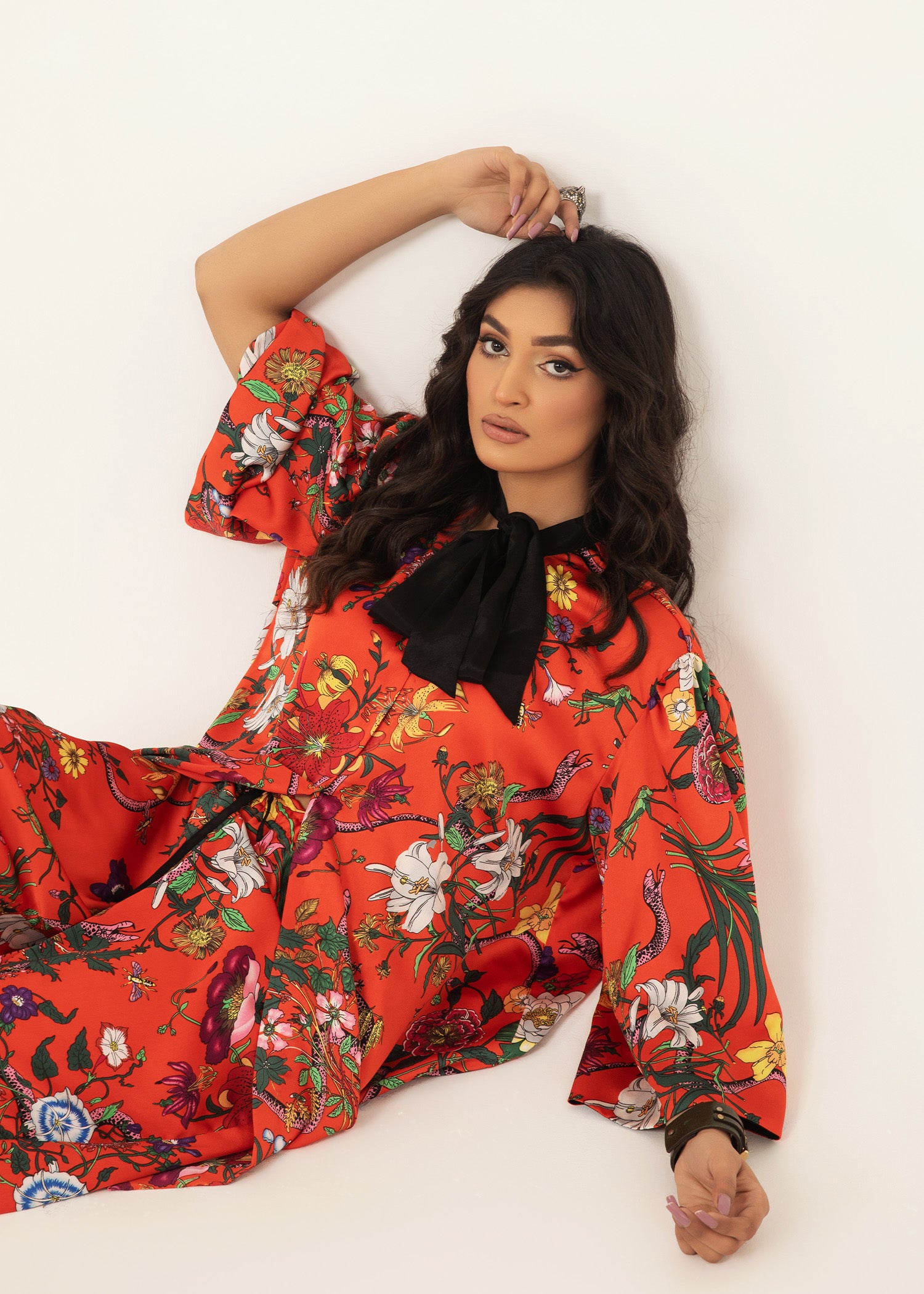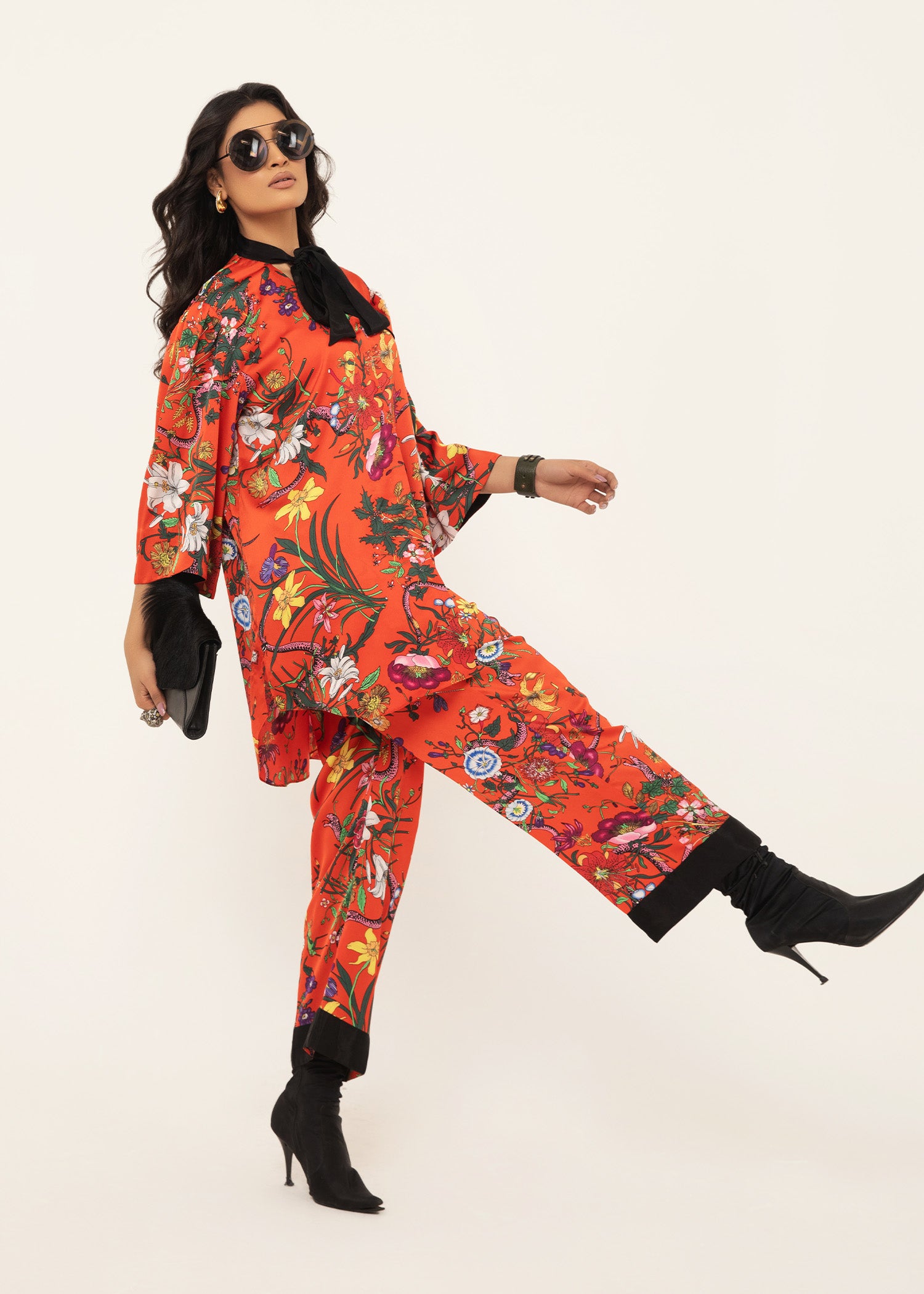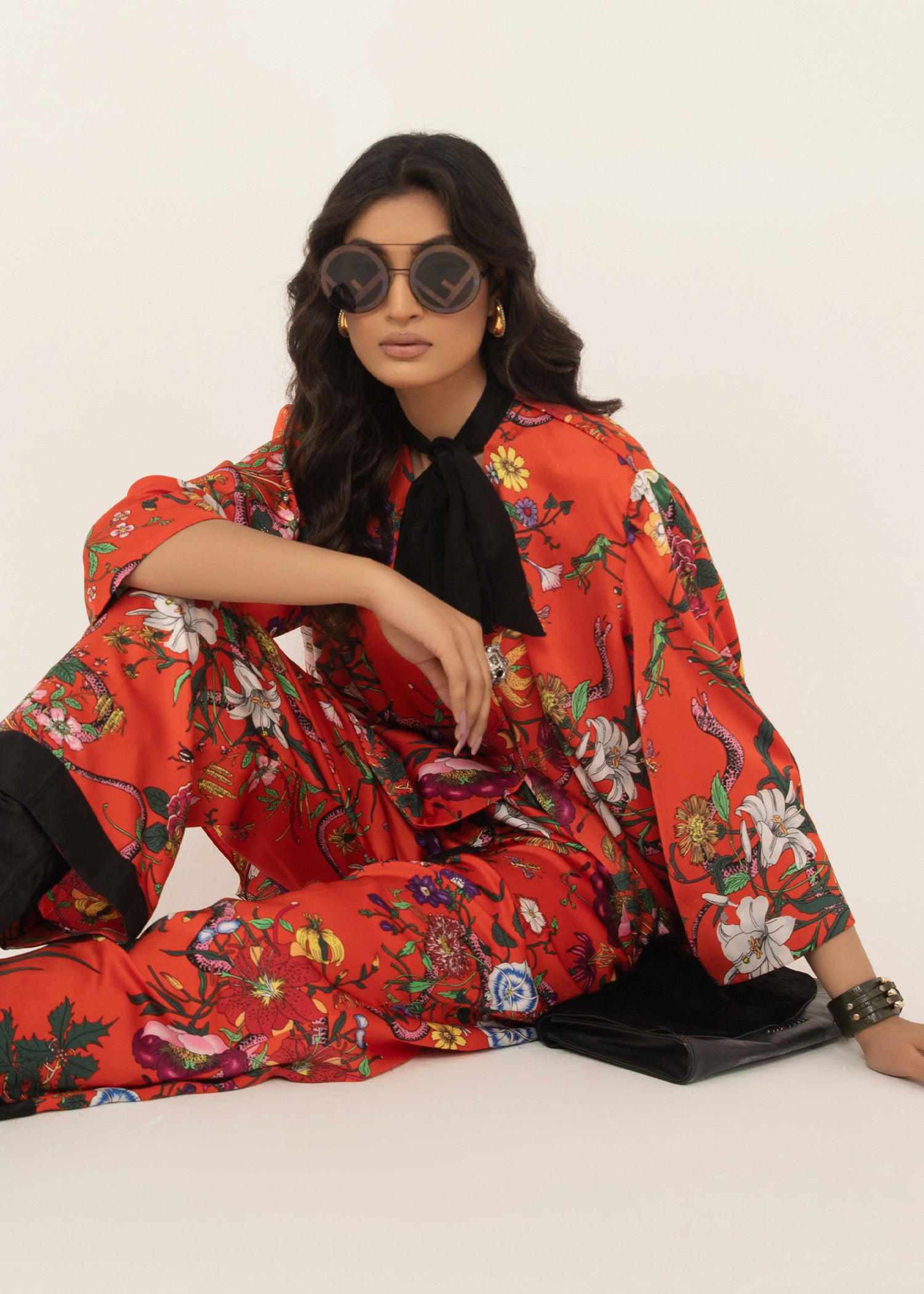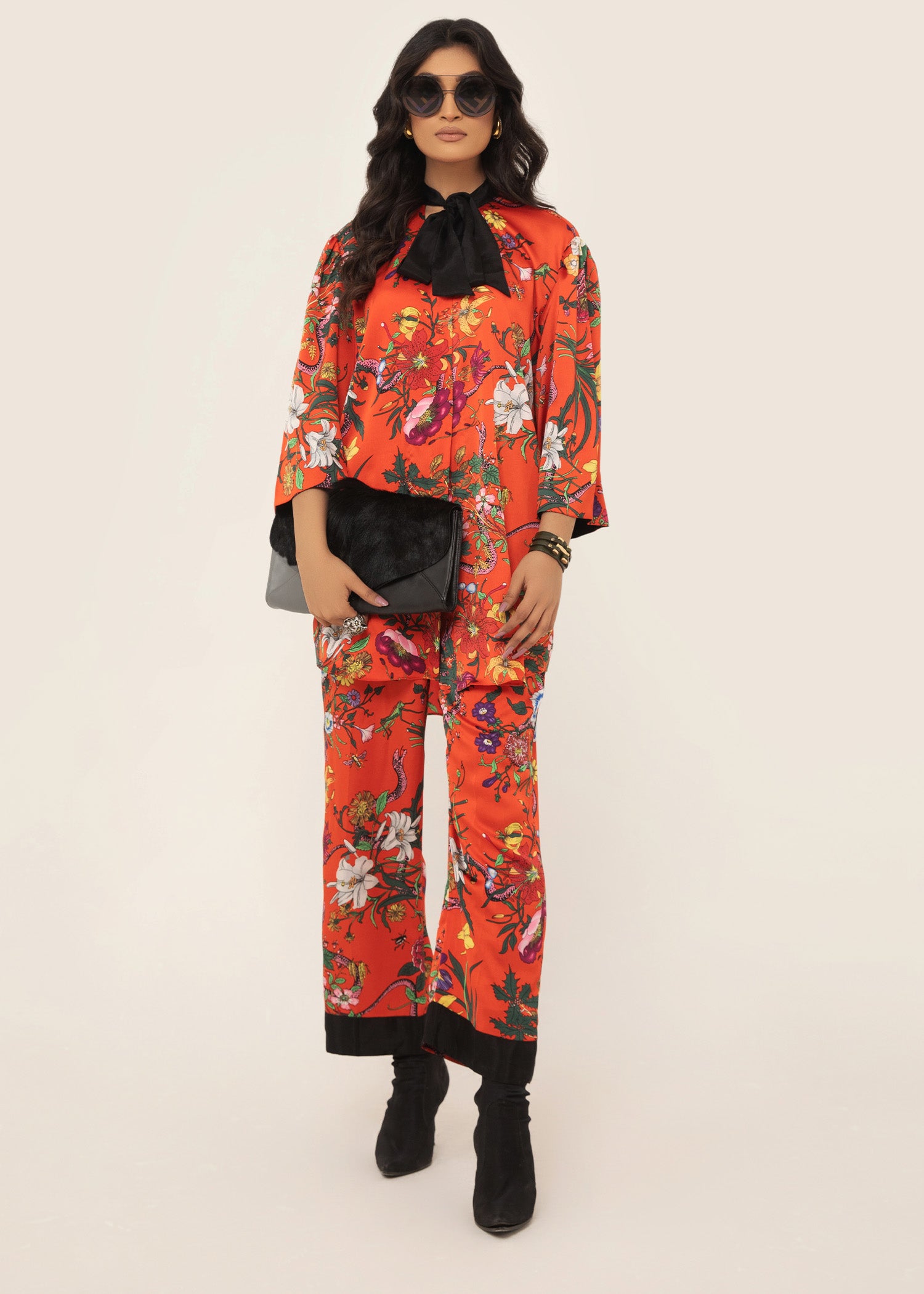 Printed short shirt paired with cuolottes crafted in premium rod silk .