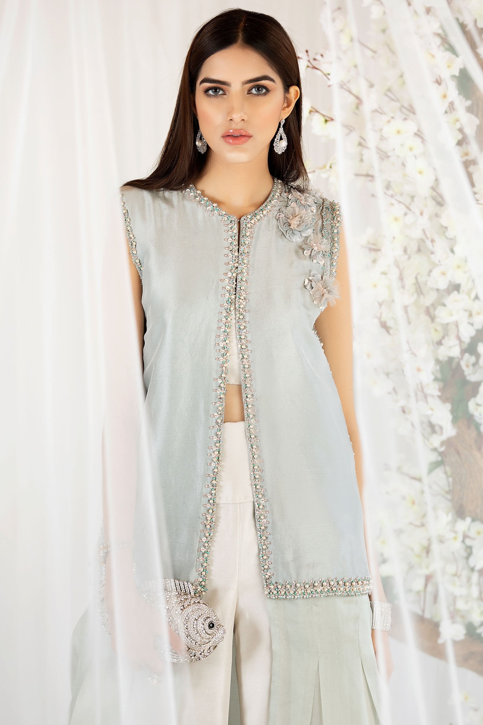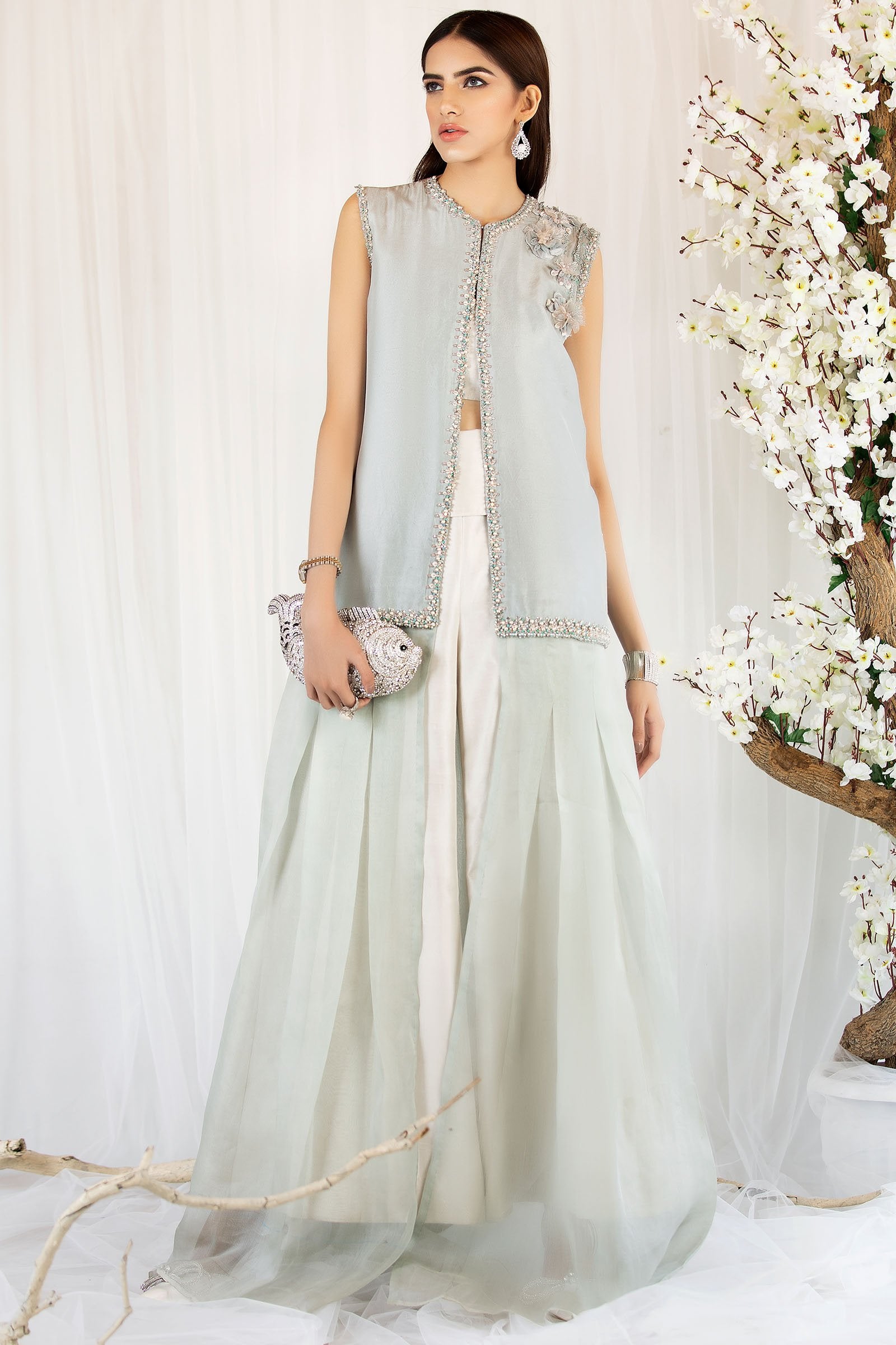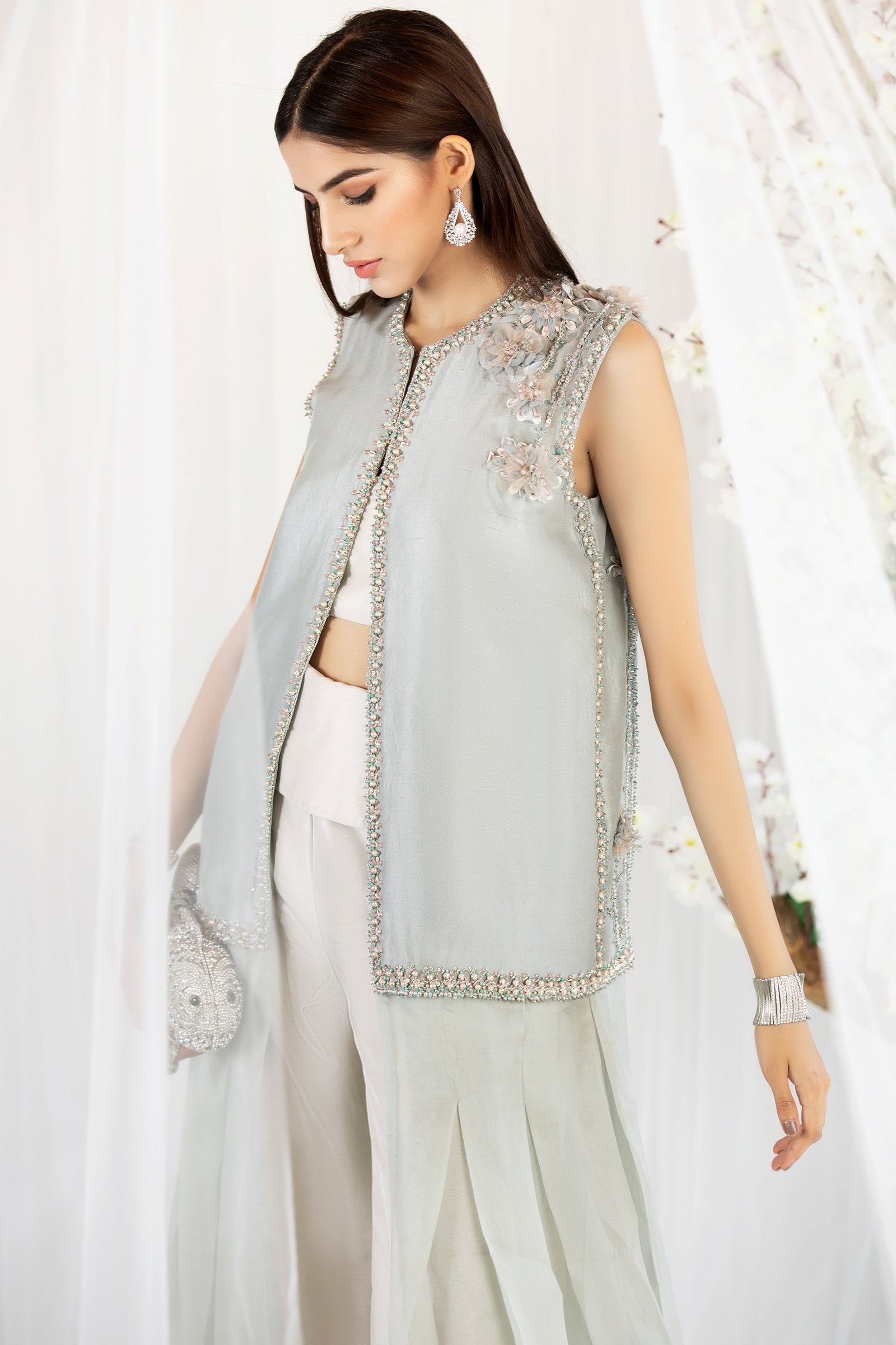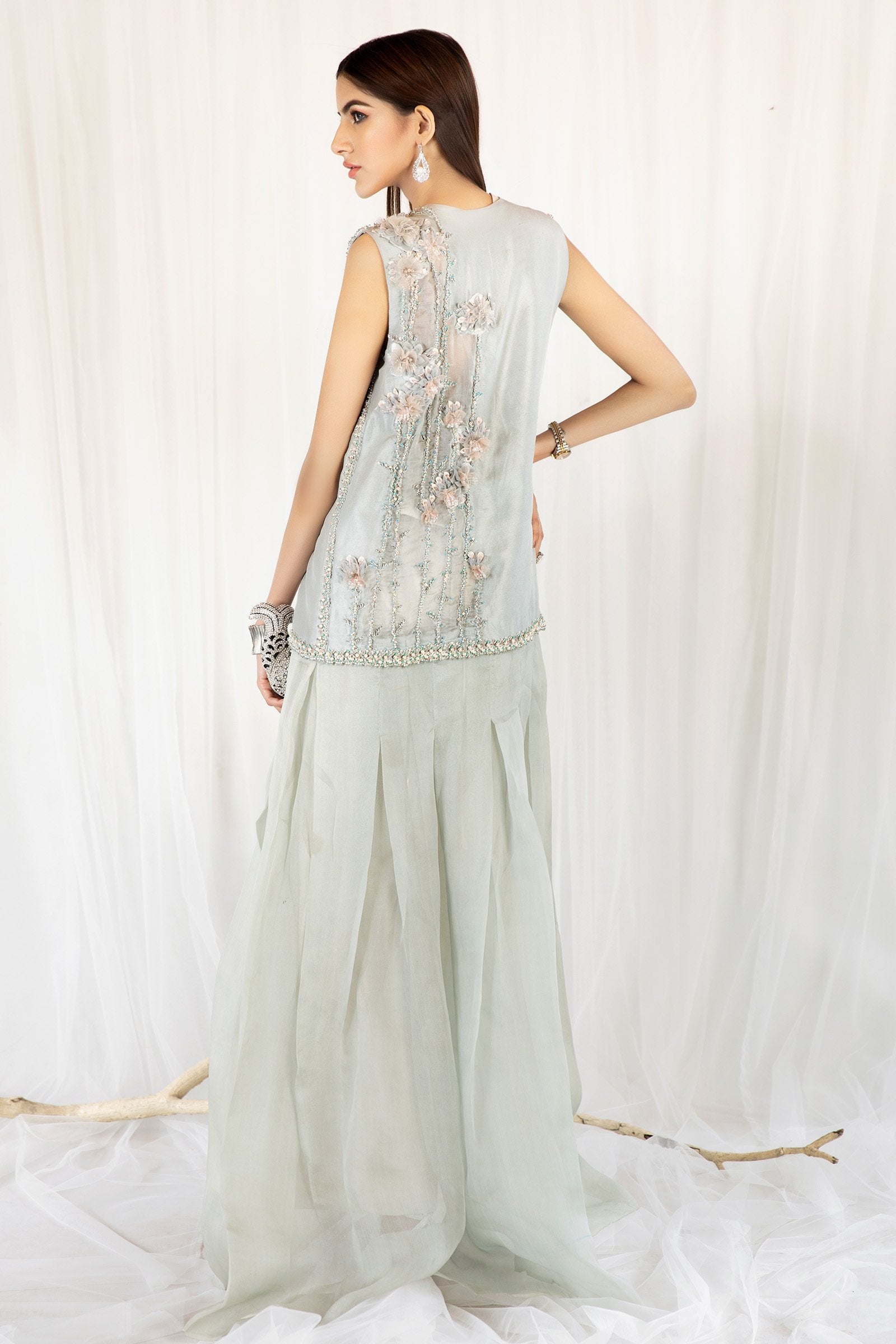 Ice blue is floor length gown infused with organza and raw silk front open design. Hand embroided with sequins and pearls on finishings and neckline. 3D floral motifs embellished on front and back. Paired with rawsilk pants in ivory.
