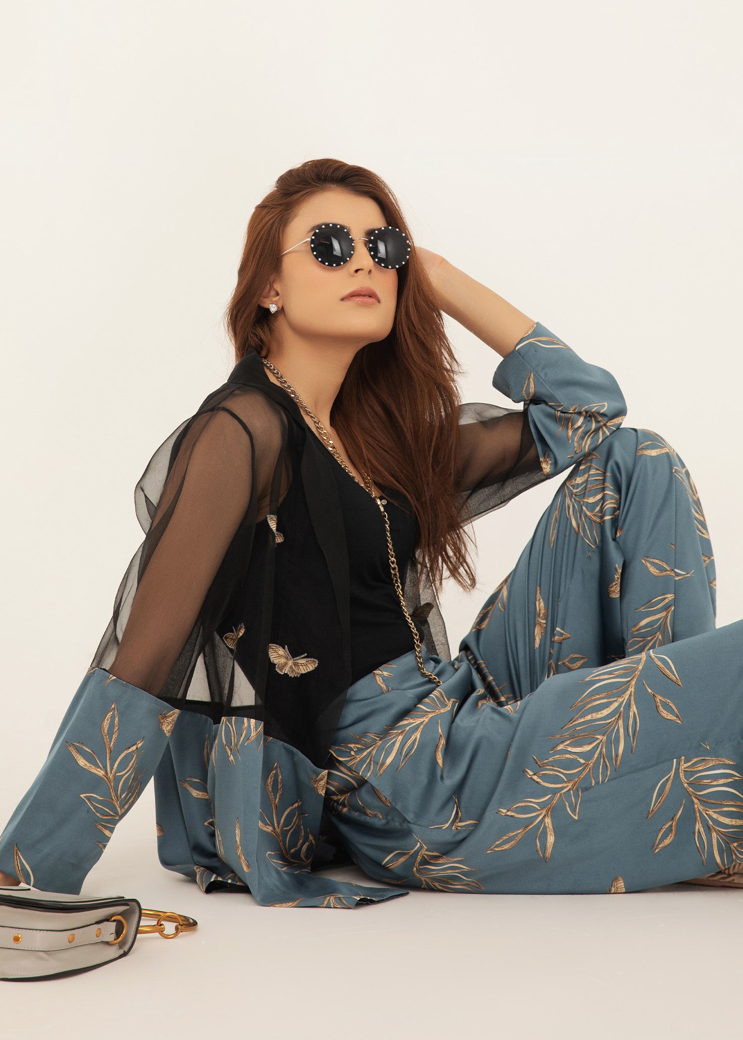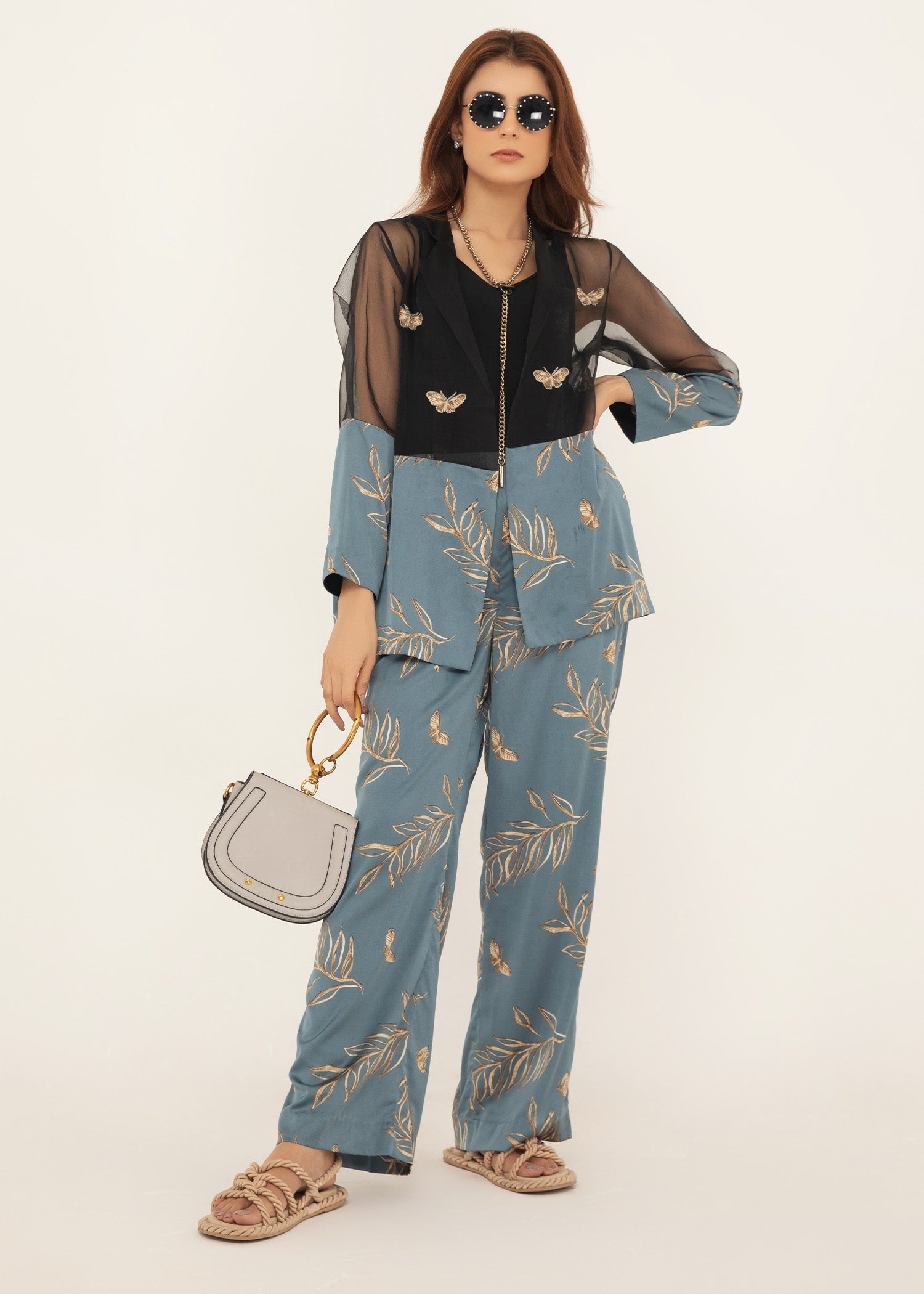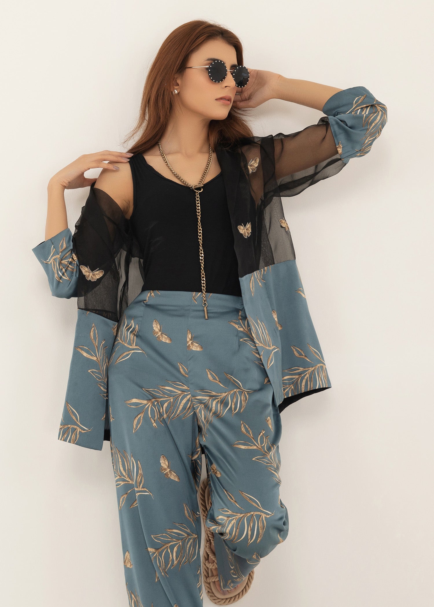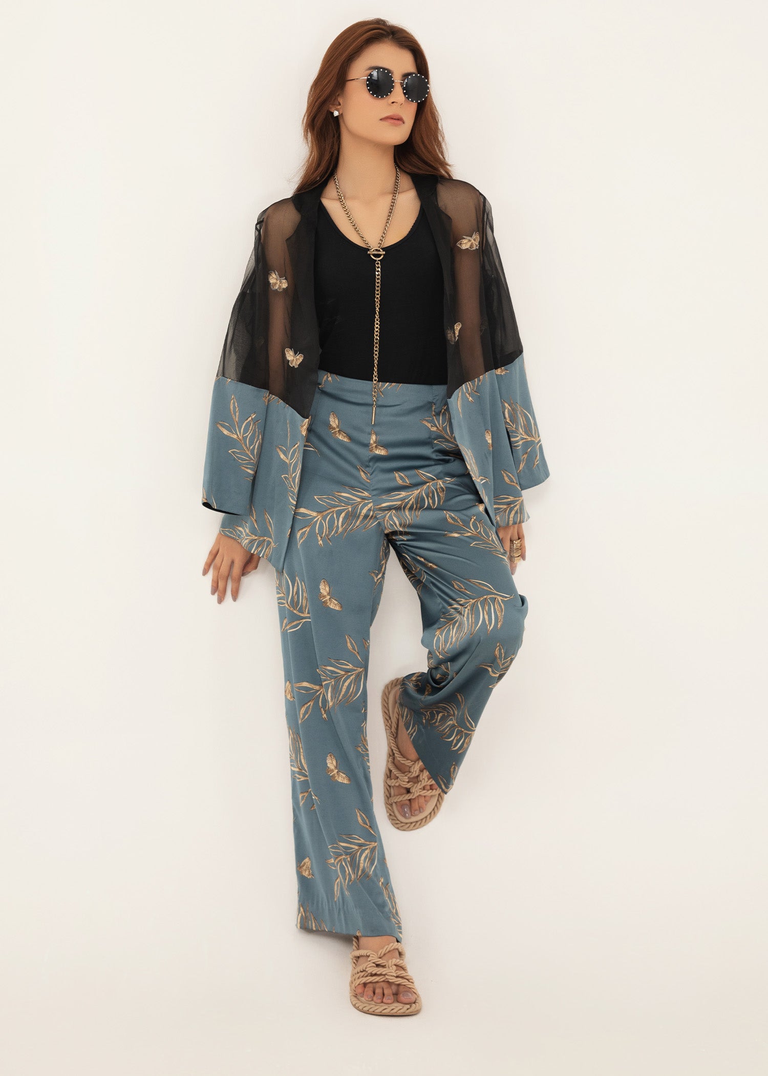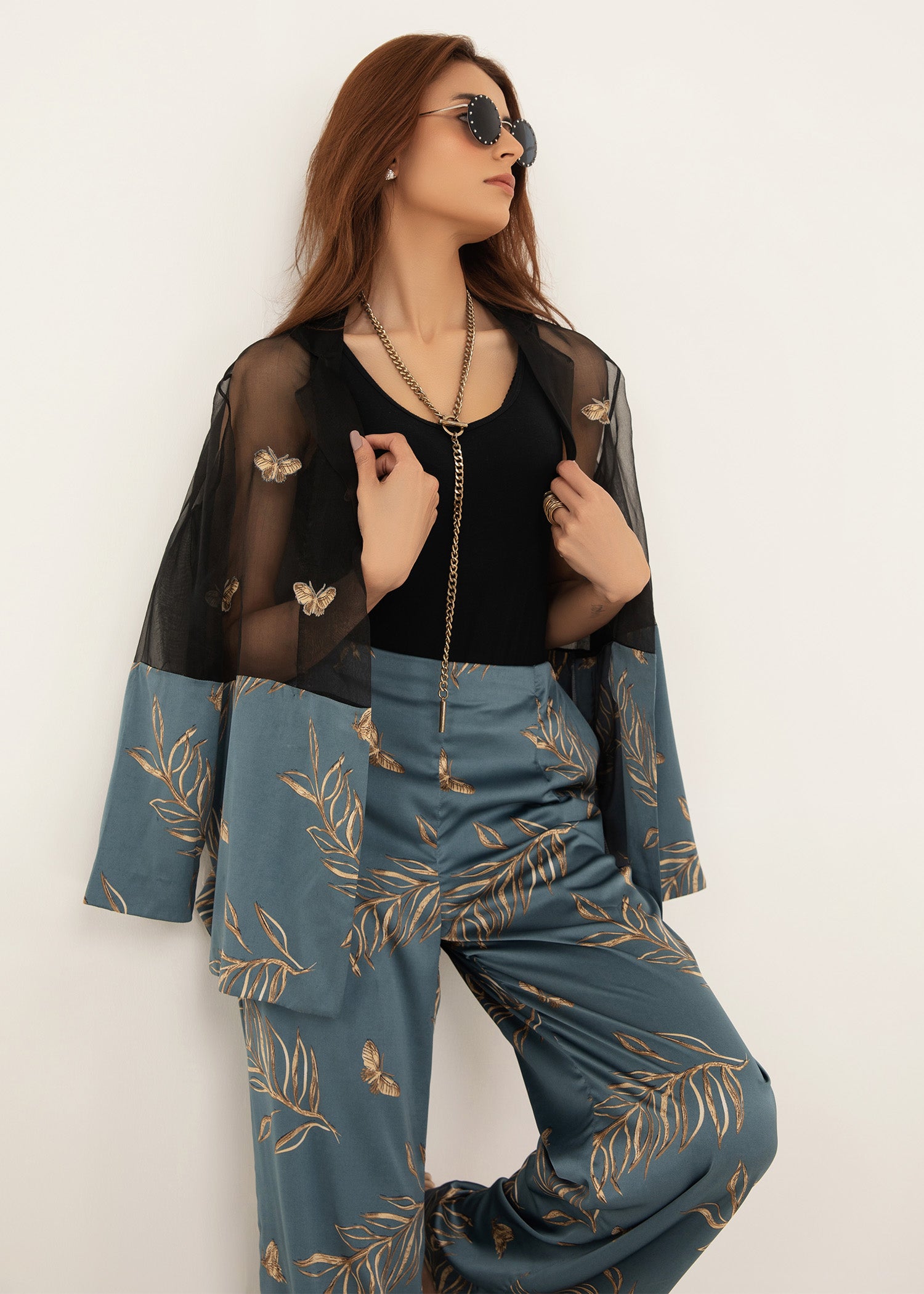 Printed open jacket is paired with a blended silk cuolotte , full sleeves with organza patching .