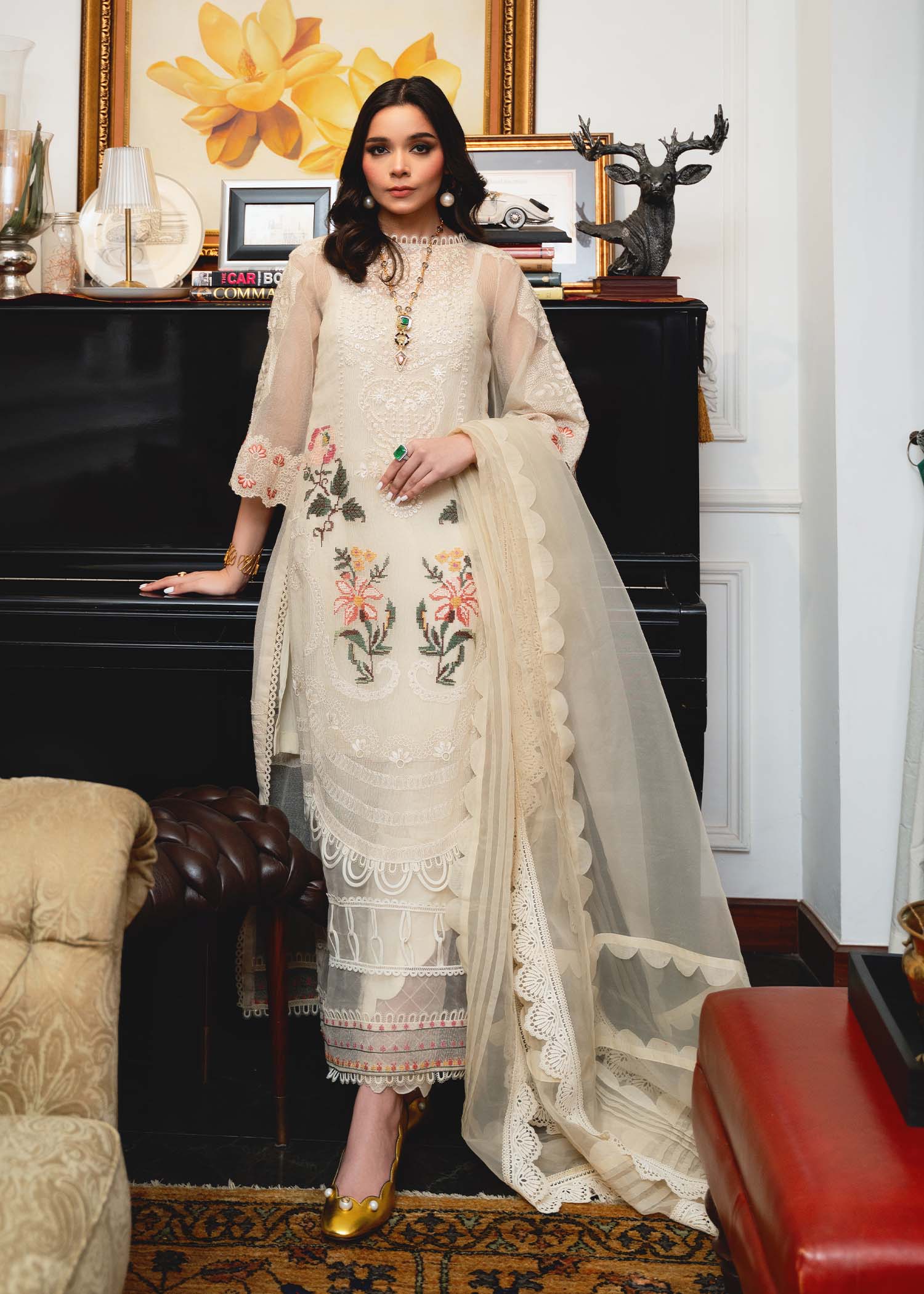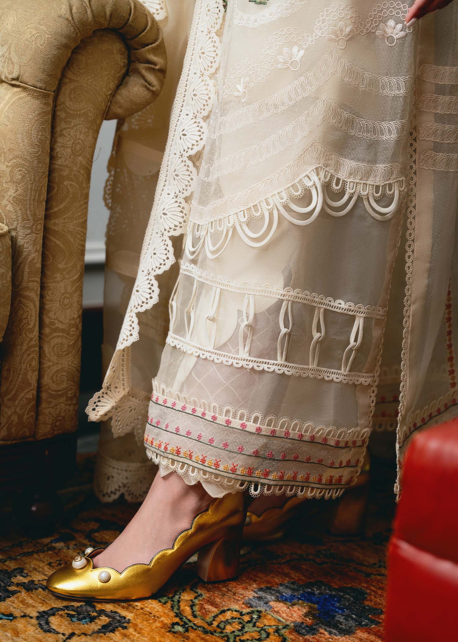 For this fascinating ensemble, luxurious and intricate mixture of abstract floral embroidery merges flawlessly on a lavish exquisite ivory canvas. The finely delineated work around neckline contribute to the ensemble’s beauty. Shiza hassan finalized the look with stunning straight pants and a magnificent organza dupatta with intricate pleated finishes and lace to perfectly accentuate the true SH style.