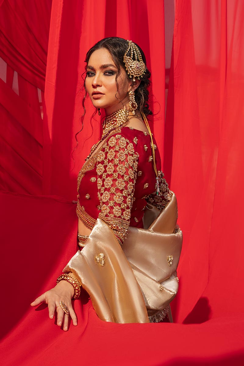 Our signature bridal is carefully crafted into a beautiful variation of angrakha into a choli, having a broad neck which features delicate hand embellished motifs and borders worn on top of a luscious lehnga that is doused in signature Shiza Hassan patterns of illustrious paislies. The set comes with a beautiful organza hand embaished dupatta that is accentuated with heavily embellished borders and a tissue shawl with minimal chan booti and gotta finish.