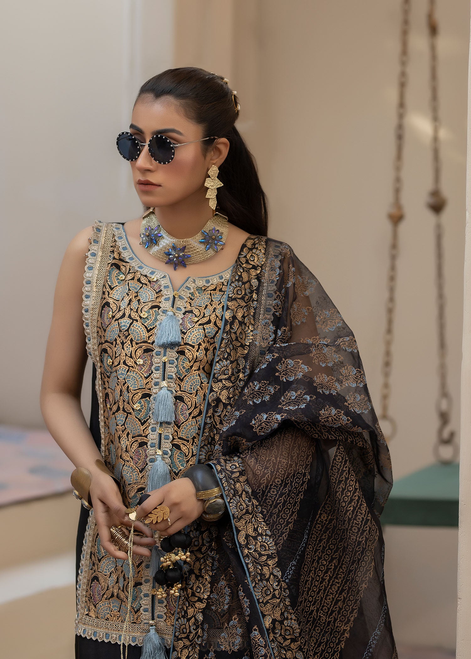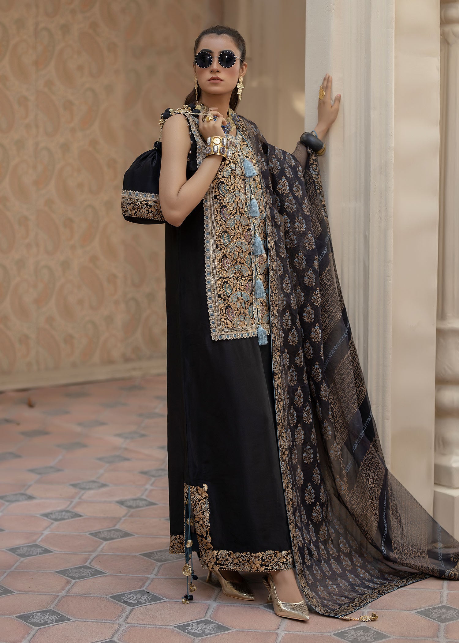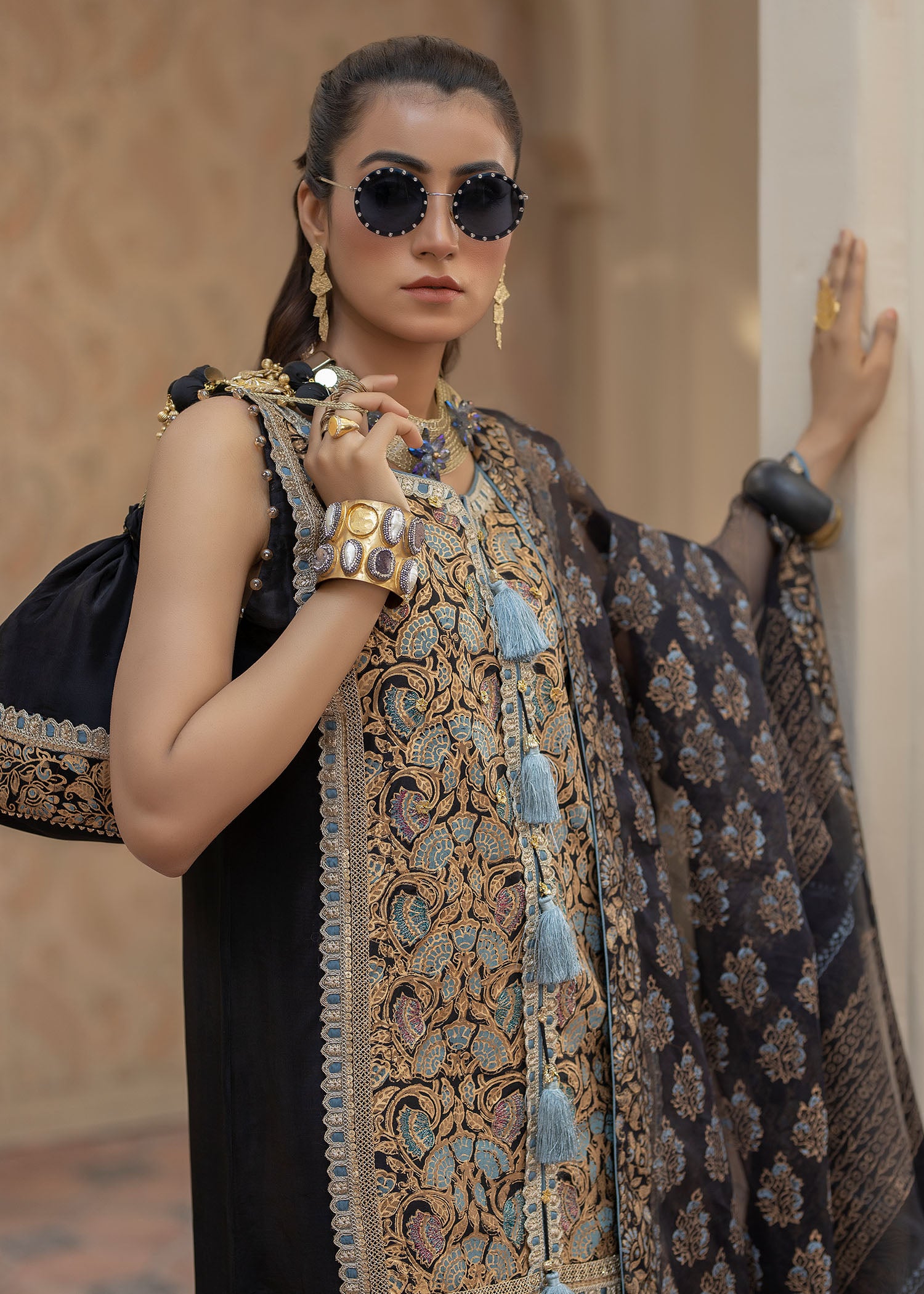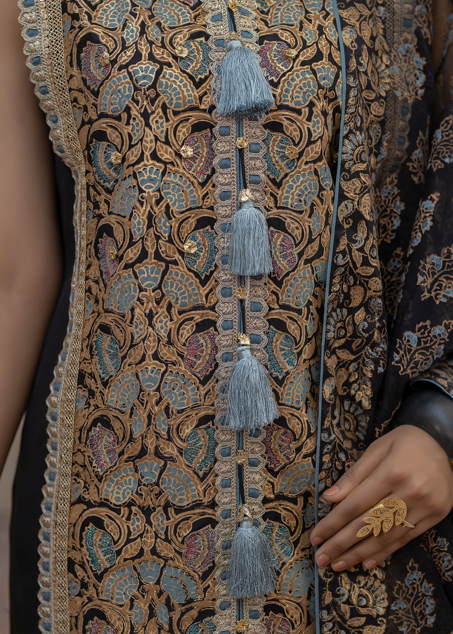 A relaxed silhouette, tailored from sumptuous pure tusser silk, in the colour of all seasons, black with pops of ice blue and gold are added to make a lasting impact.An array of signature SH details, consisting embroidery and hand worked neckline add a subtle sparkle to your look.Delicate and intricate silk threadwork in coordinating hues along the fron neckline, makes this an inevitable show stopper.The gorgeous pure organza dupatta with gorgeous color blocking and an aubergine border with glimmering gold block print adds a graceful flair to your outfit.