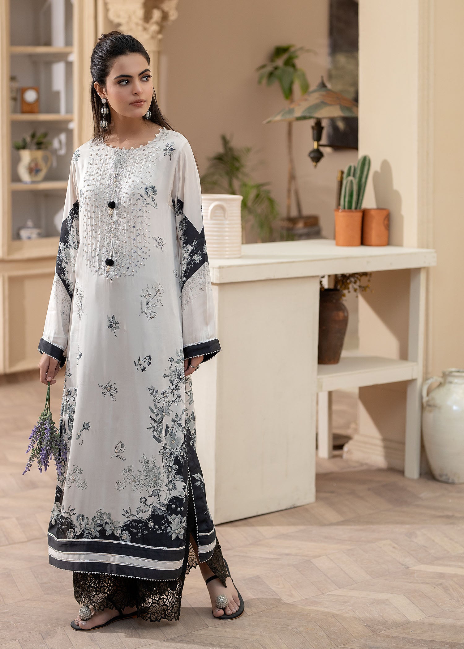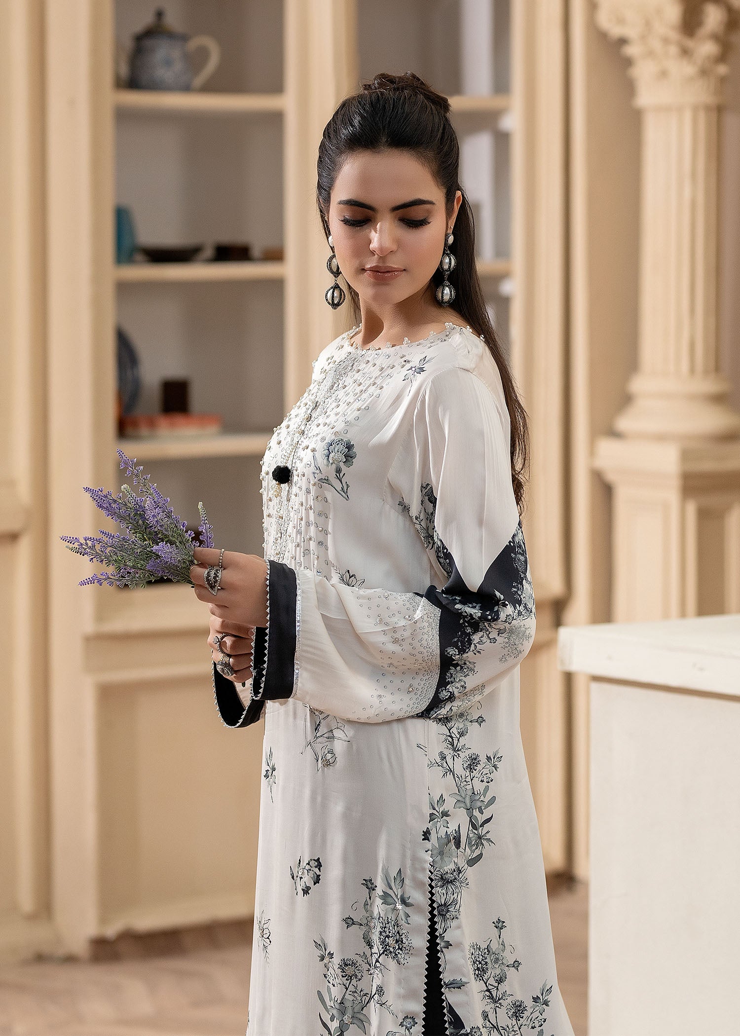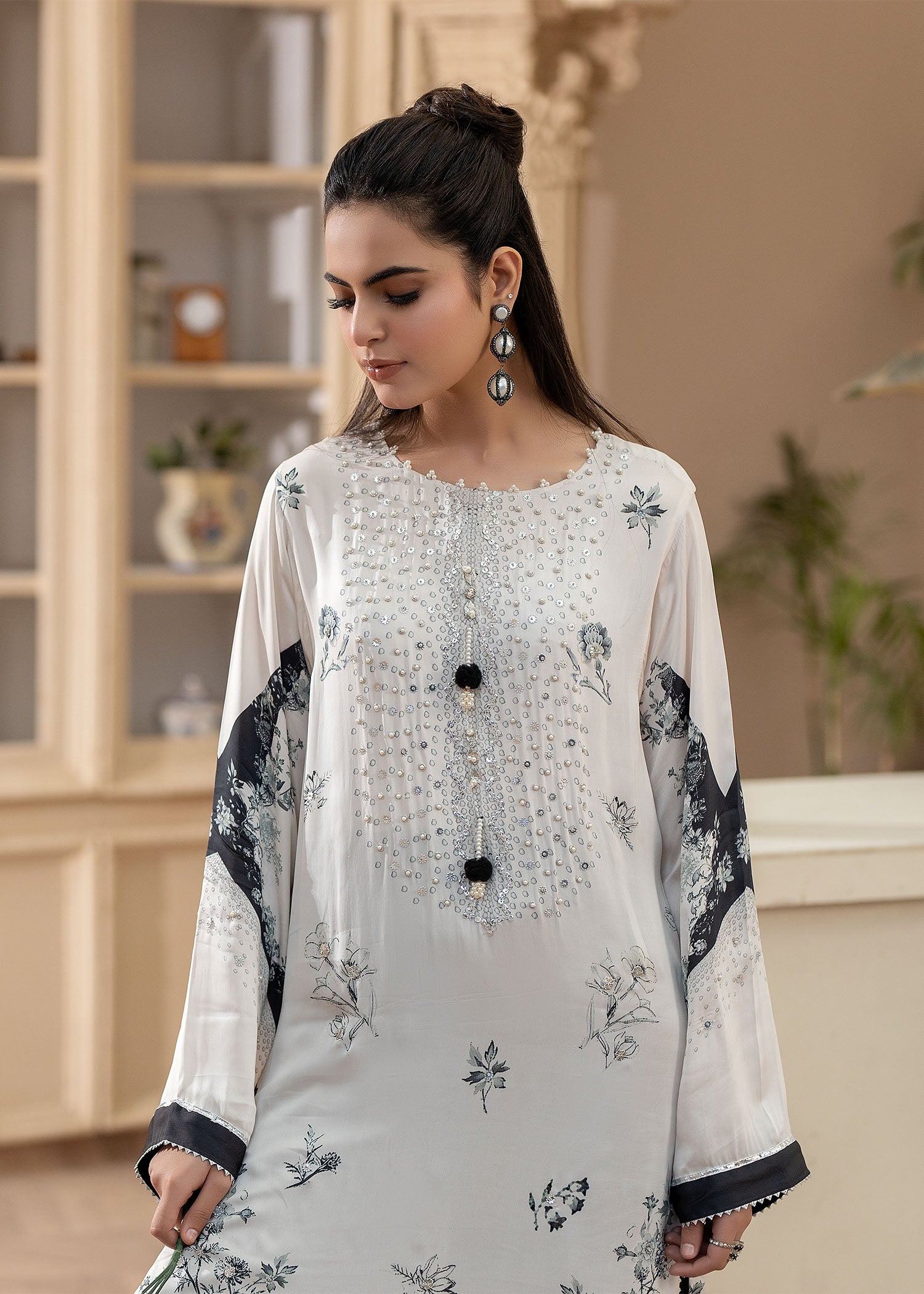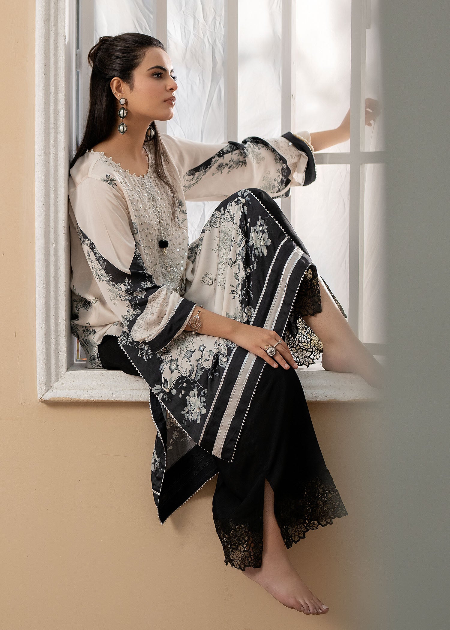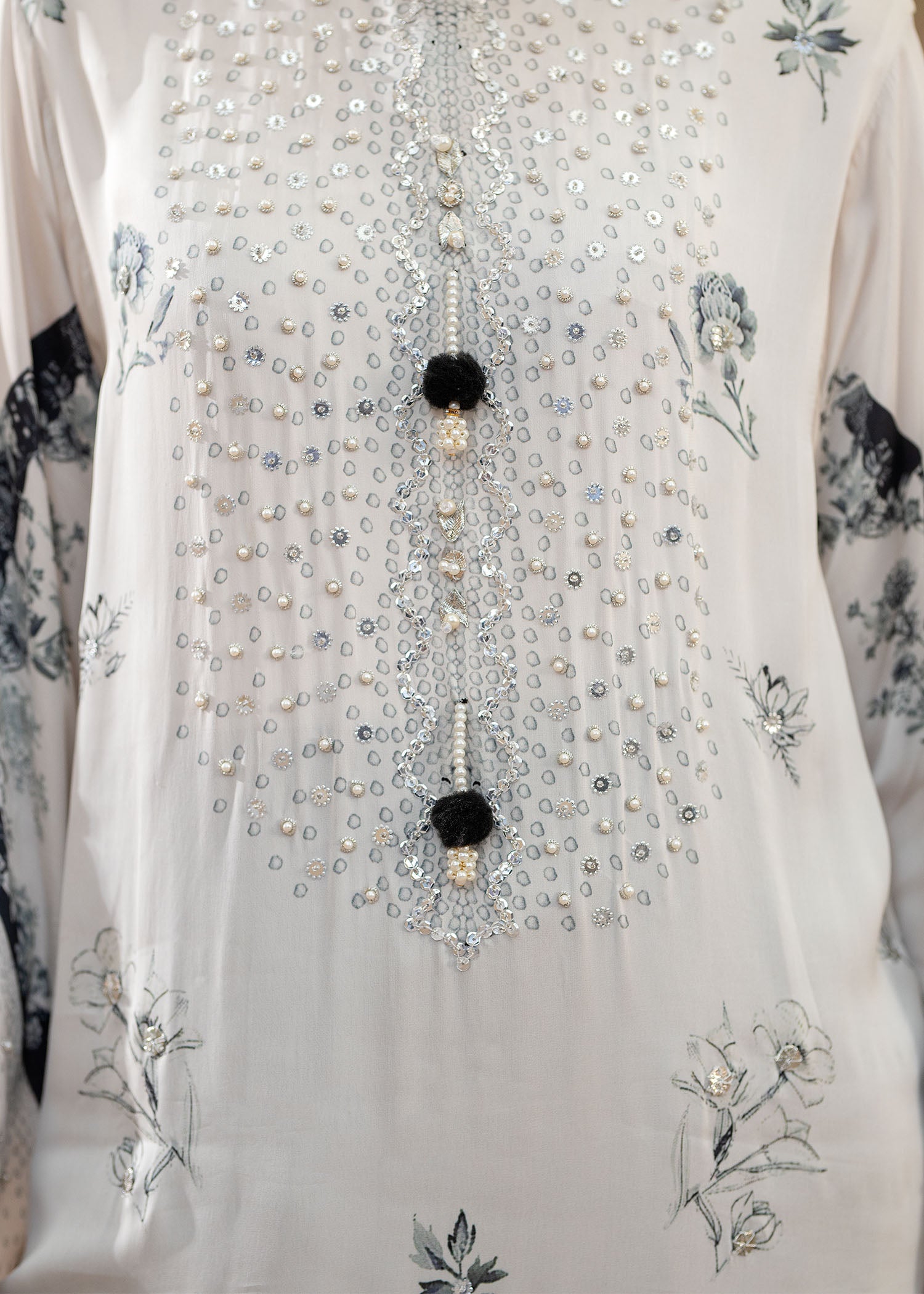 Classic black is given a fresh and glamourous treatment in the Maala ensemble. A deep onyx hue, with eye catching print is further enhanced with intricate hand work all along the neckline. The relaxed, much loved silhouette is universally flattering and paired with a viscose trouser with cutwork hem.