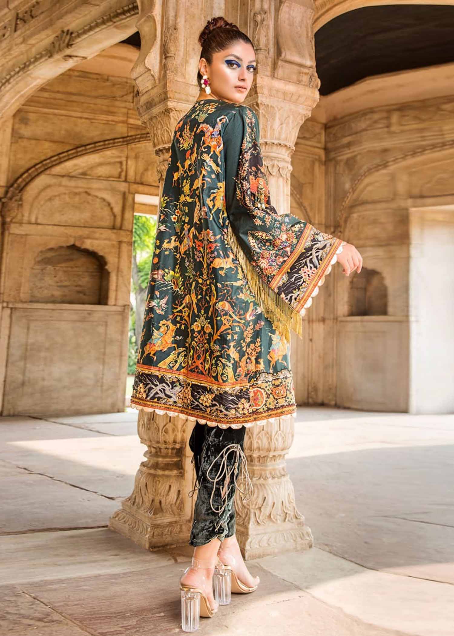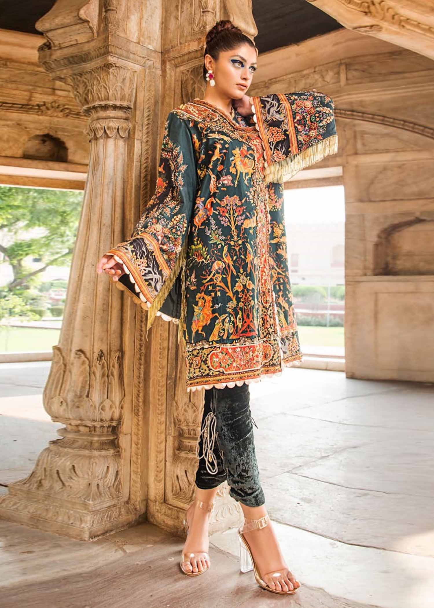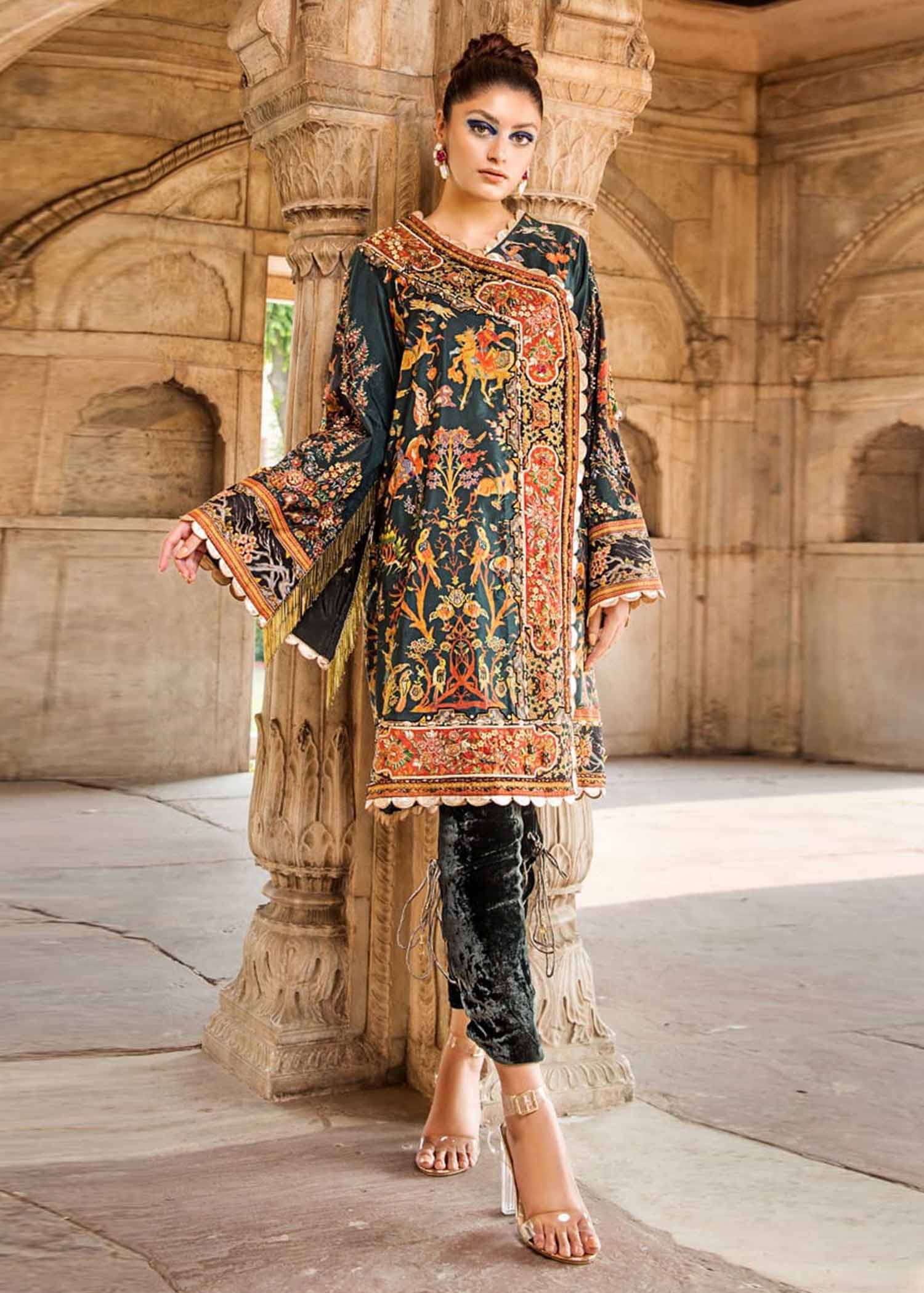 This Angrakha Shirt Is Enlivened With Trendy Sleeves , A Fusion Of Art And Class Which Is Further Enriched With Shikargah Prints And Embellishments.This Illuminated Ensemble Is A Classic Silhouette Paired With Velvet Pants To Creat An Enchanting Look.