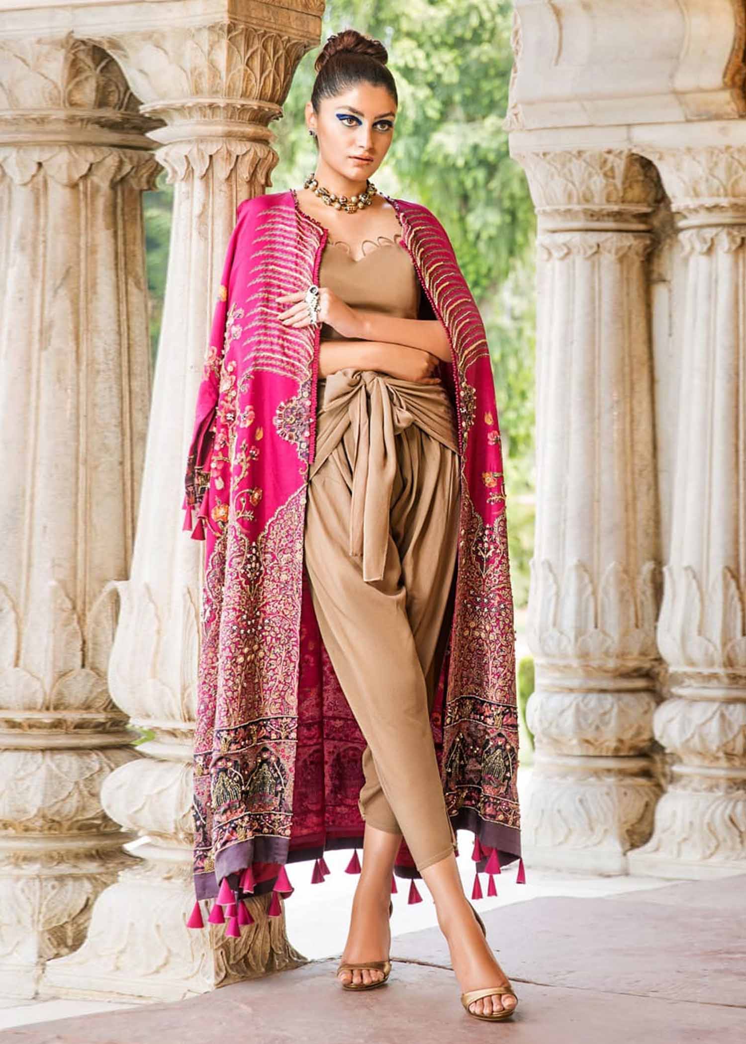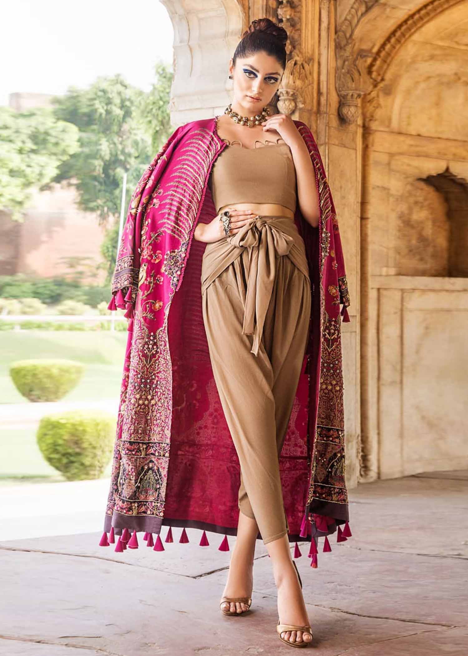 This Exclusive Craftmanship Is Crafted With Pure Raw Silk ,Adding Details With Persian Shikargah Prints And Embelishment. Paired With Elegant Pants And Gorgeous Top To Complete This Look