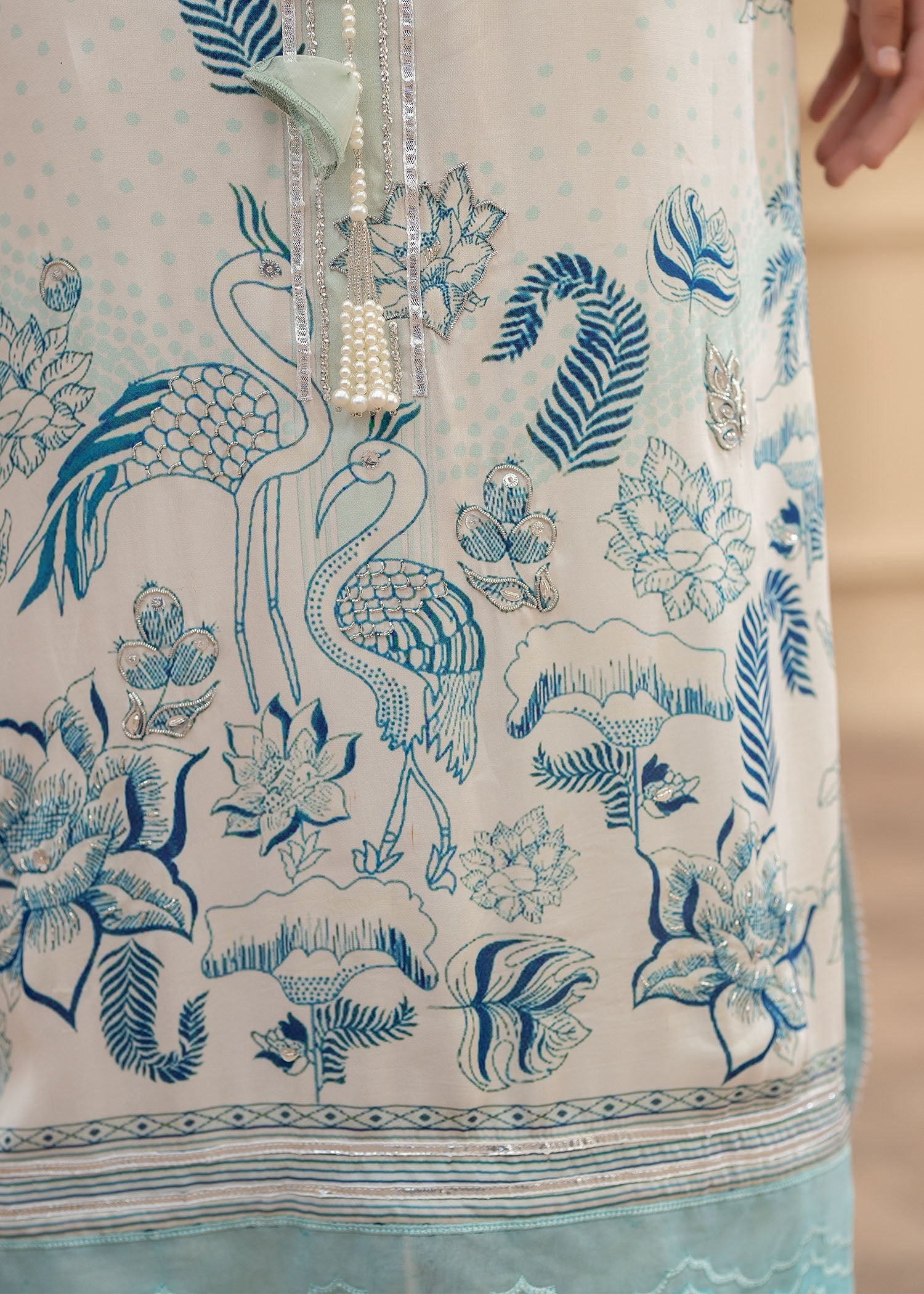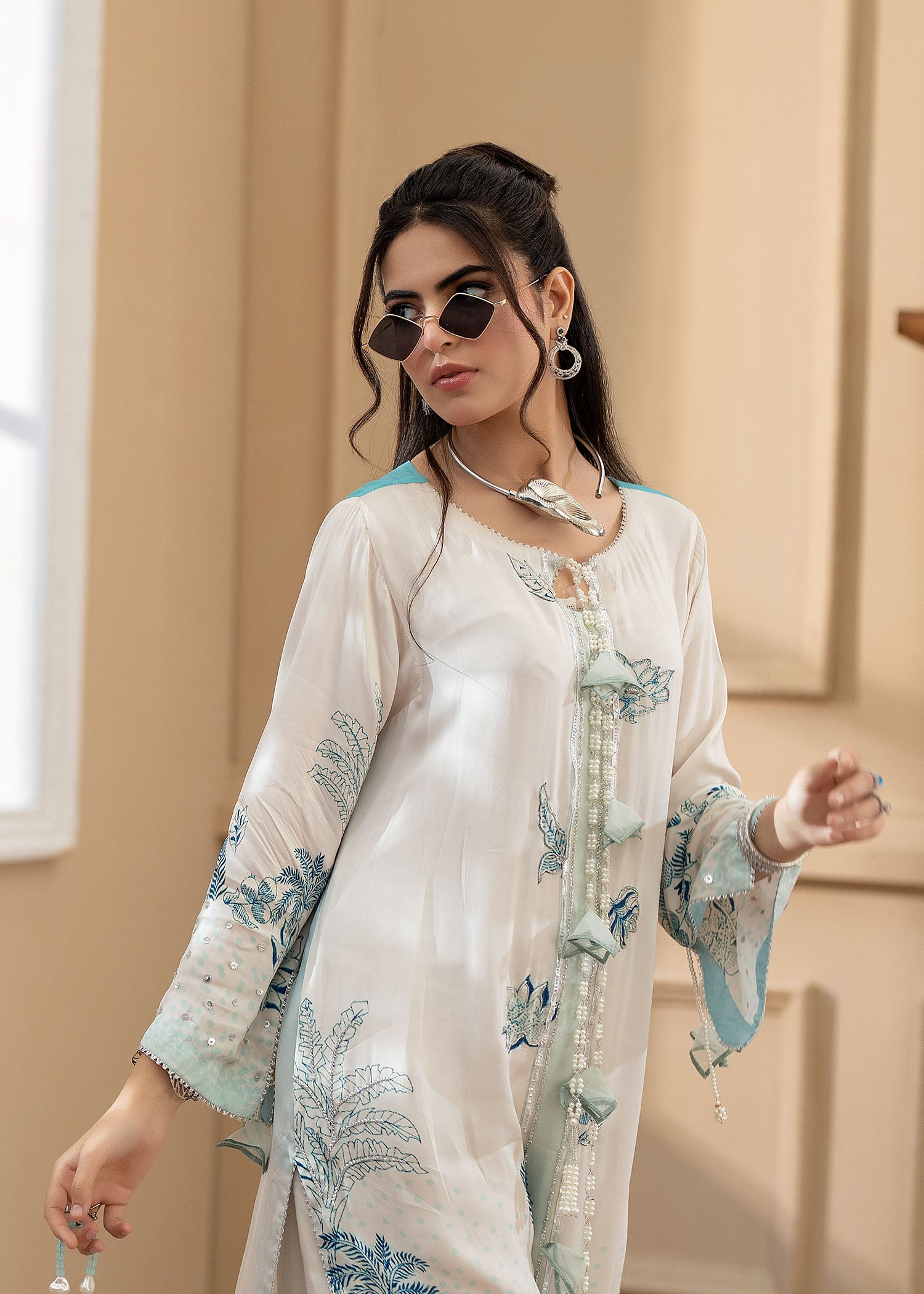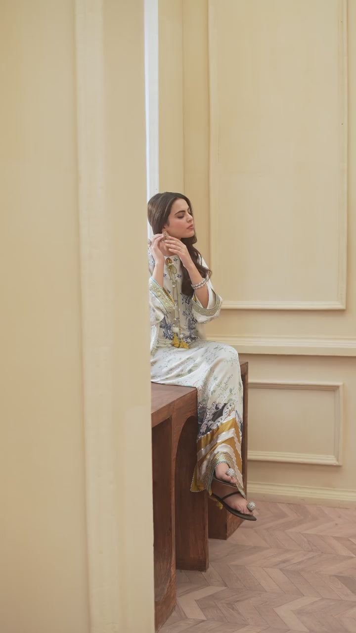 Cut from sumptuous pure satin silk, the shirt is printed with whimsical florals that bloom daintily all over the shirt, making this an absolute must have. The relaxed, much loved silhouette has a universally flattering neckline, adorned with delicate hand-made floral motifs, pearls and sequins, adds an easy timeless elegance. The sleeves are finished with stunning handwork and print. The graceful, relaxed fit shirt is paired with a viscose cutwork pants as pictured .