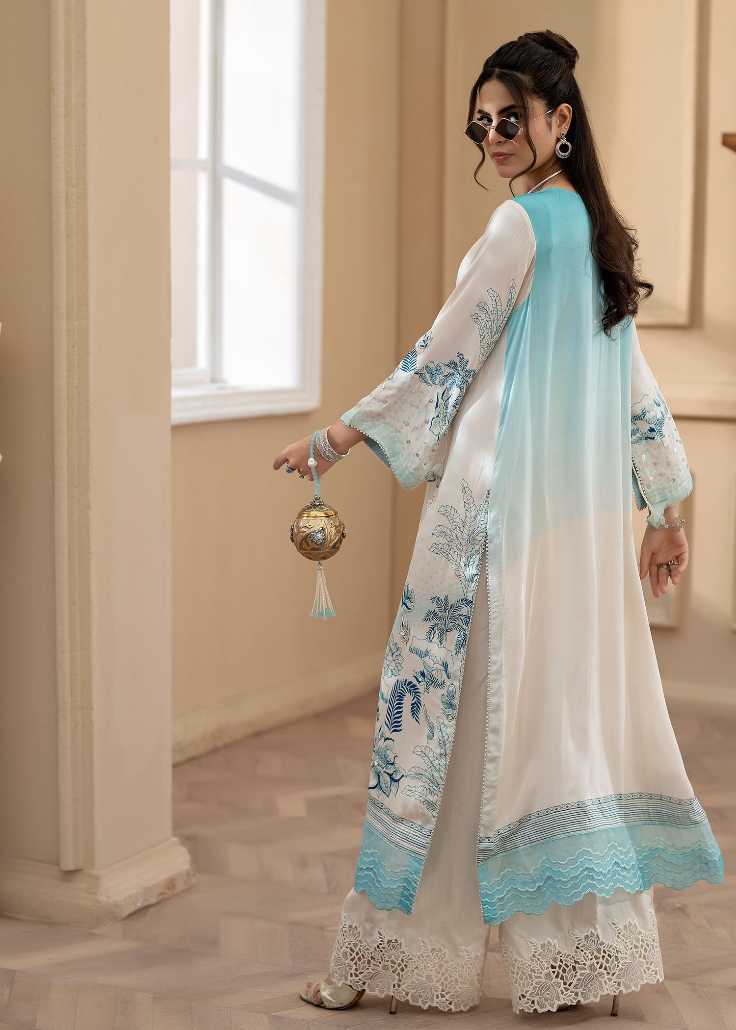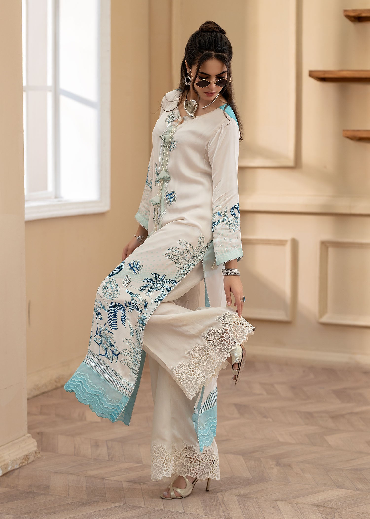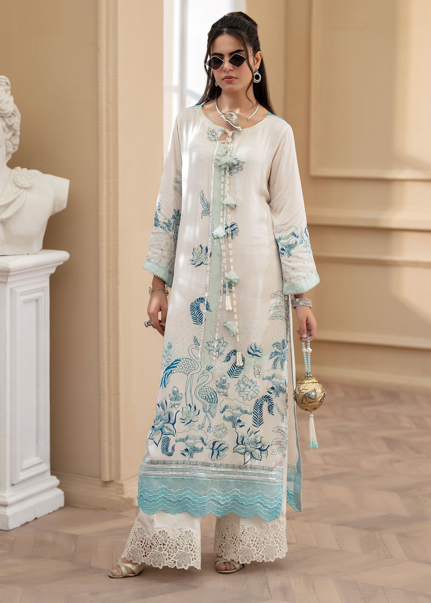 Cut from sumptuous pure satin silk, the shirt is printed with whimsical florals that bloom daintily all over the shirt, making this an absolute must have. The relaxed, much loved silhouette has a universally flattering neckline, adorned with delicate hand-made floral motifs, pearls and sequins, adds an easy timeless elegance. The sleeves are finished with stunning handwork and print. The graceful, relaxed fit shirt is paired with a viscose cutwork pants as pictured .