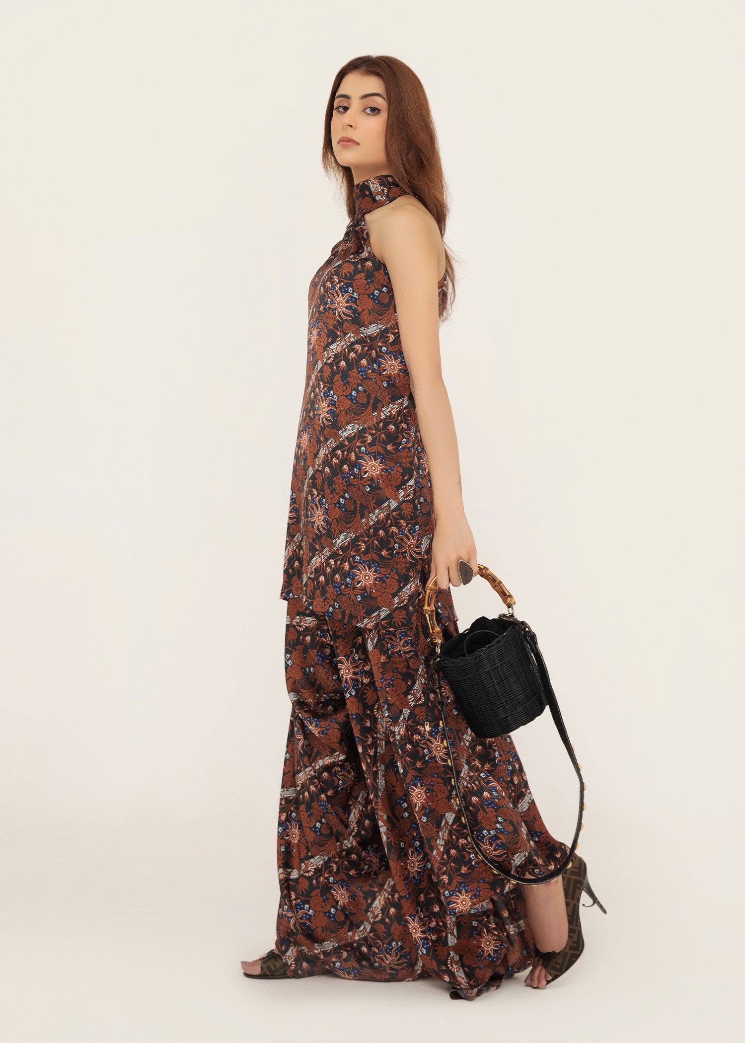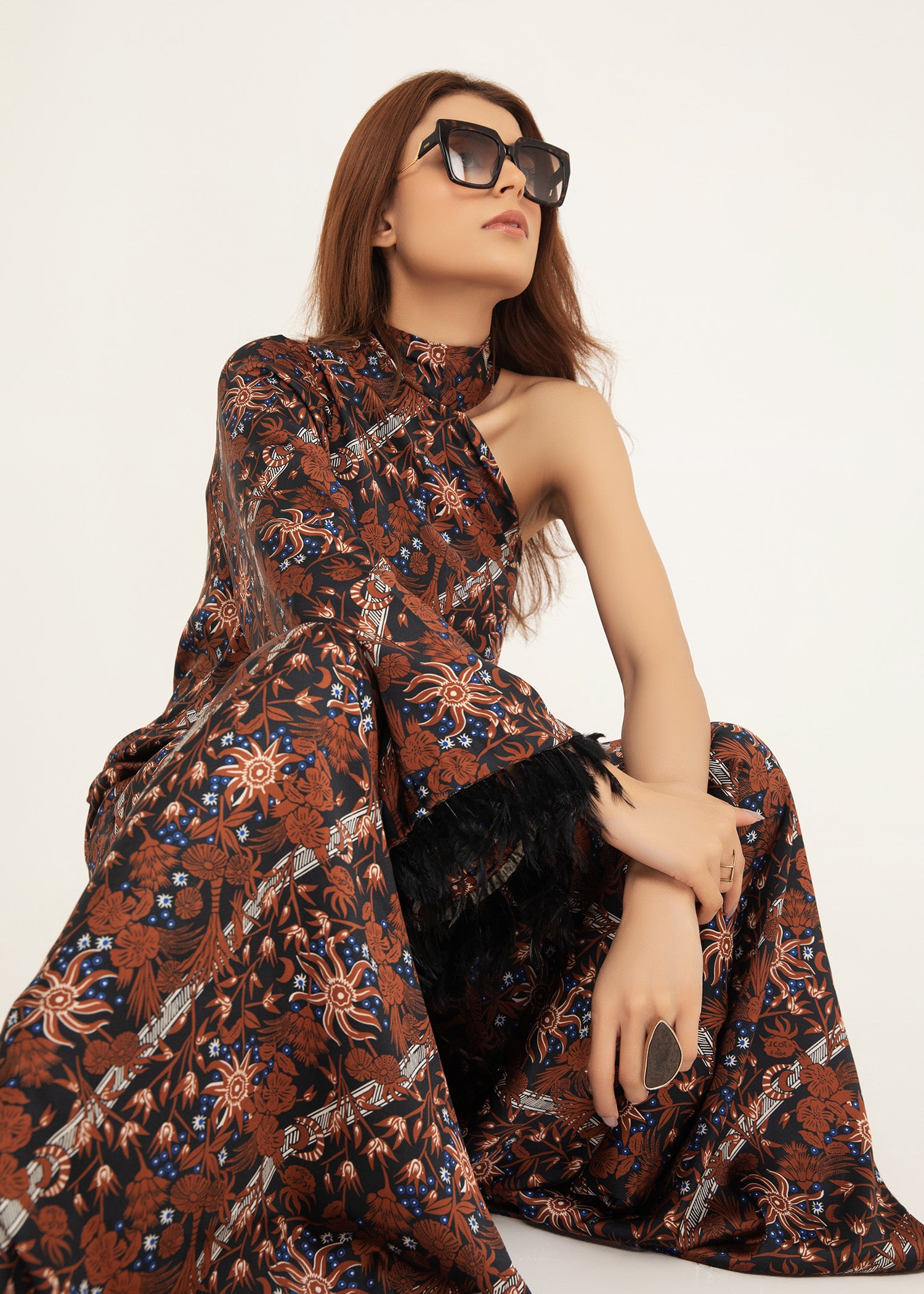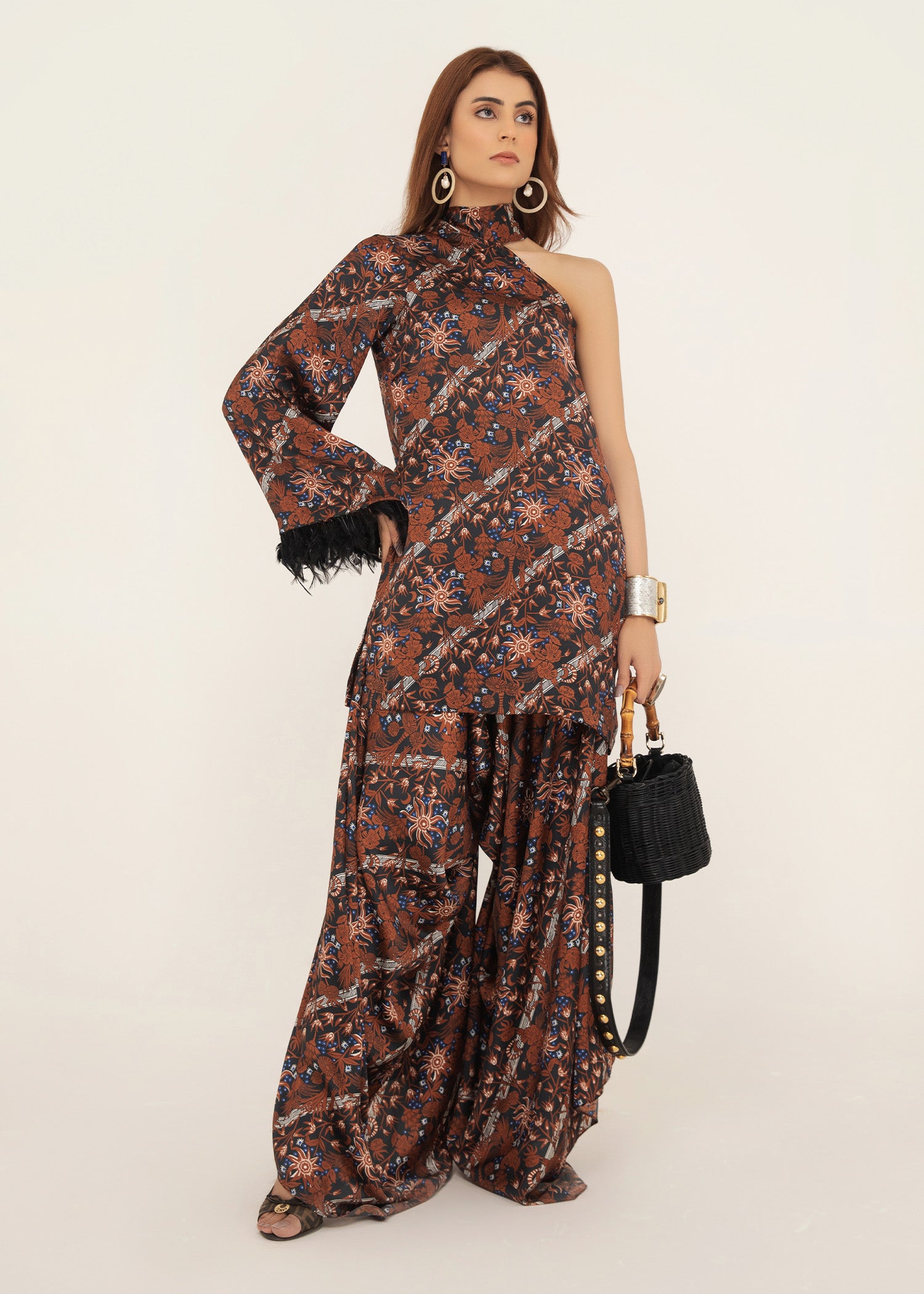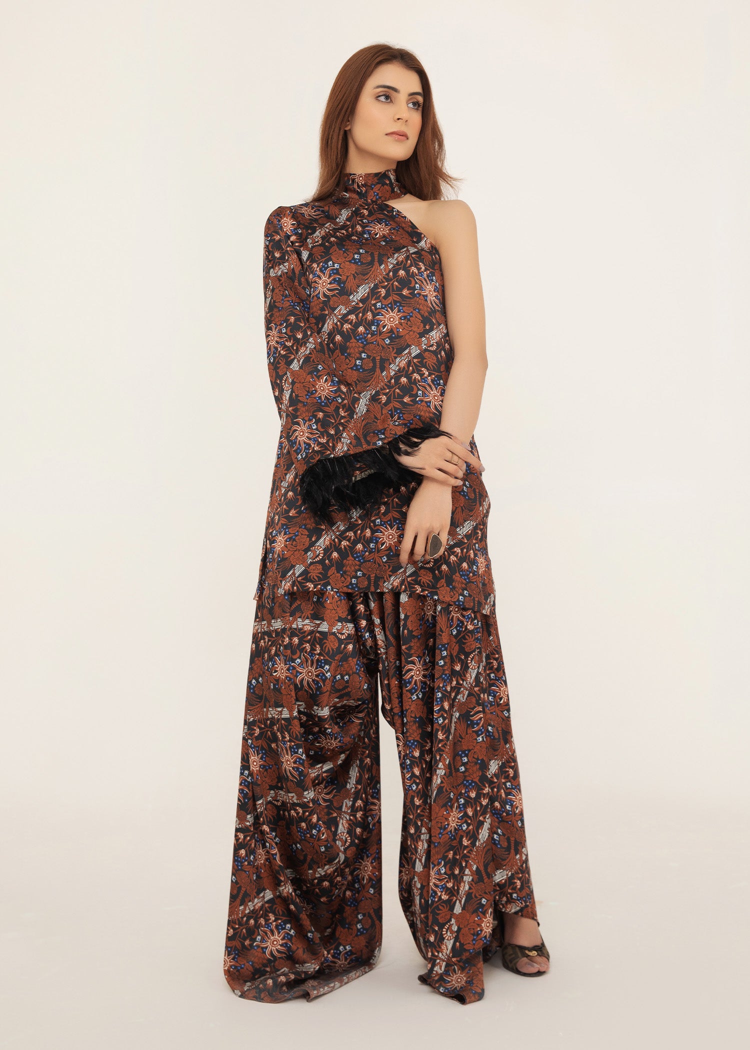 This ensemble is crafted in digital printed blended silk , one arm top is paired with drape pants to complete this look.
