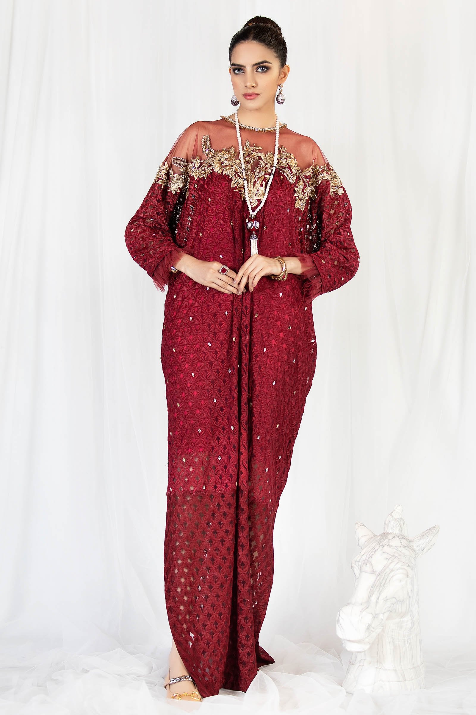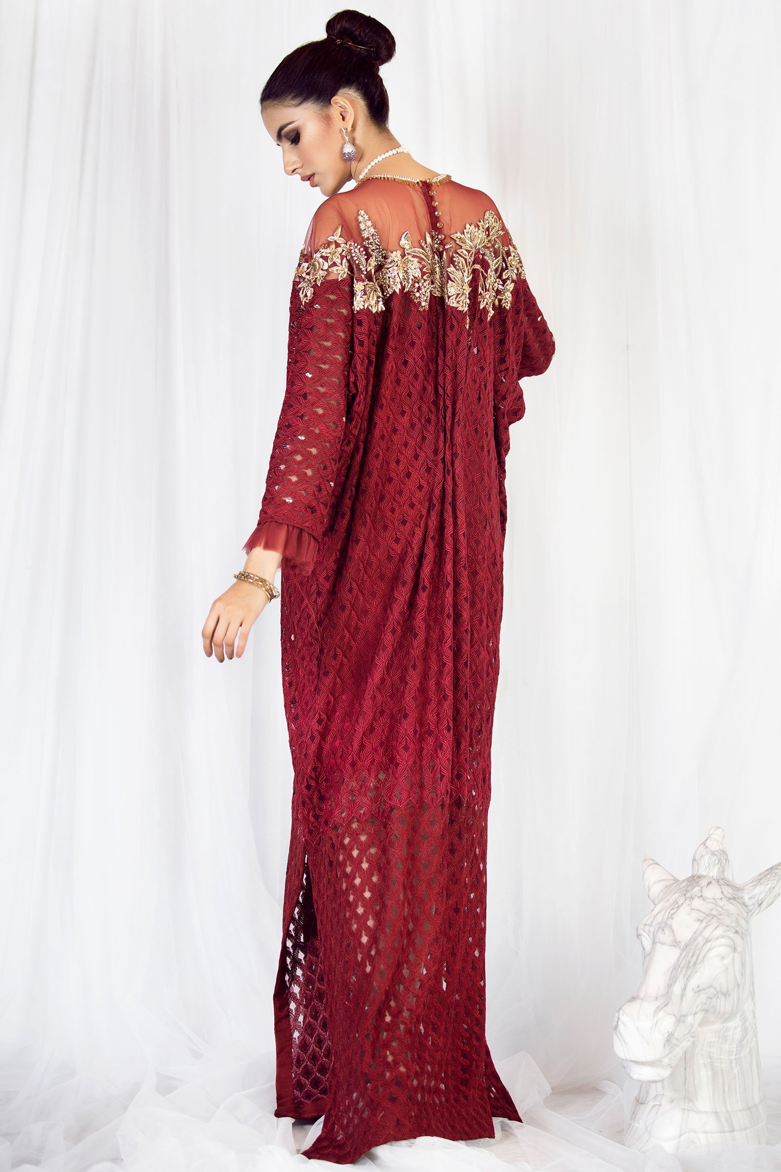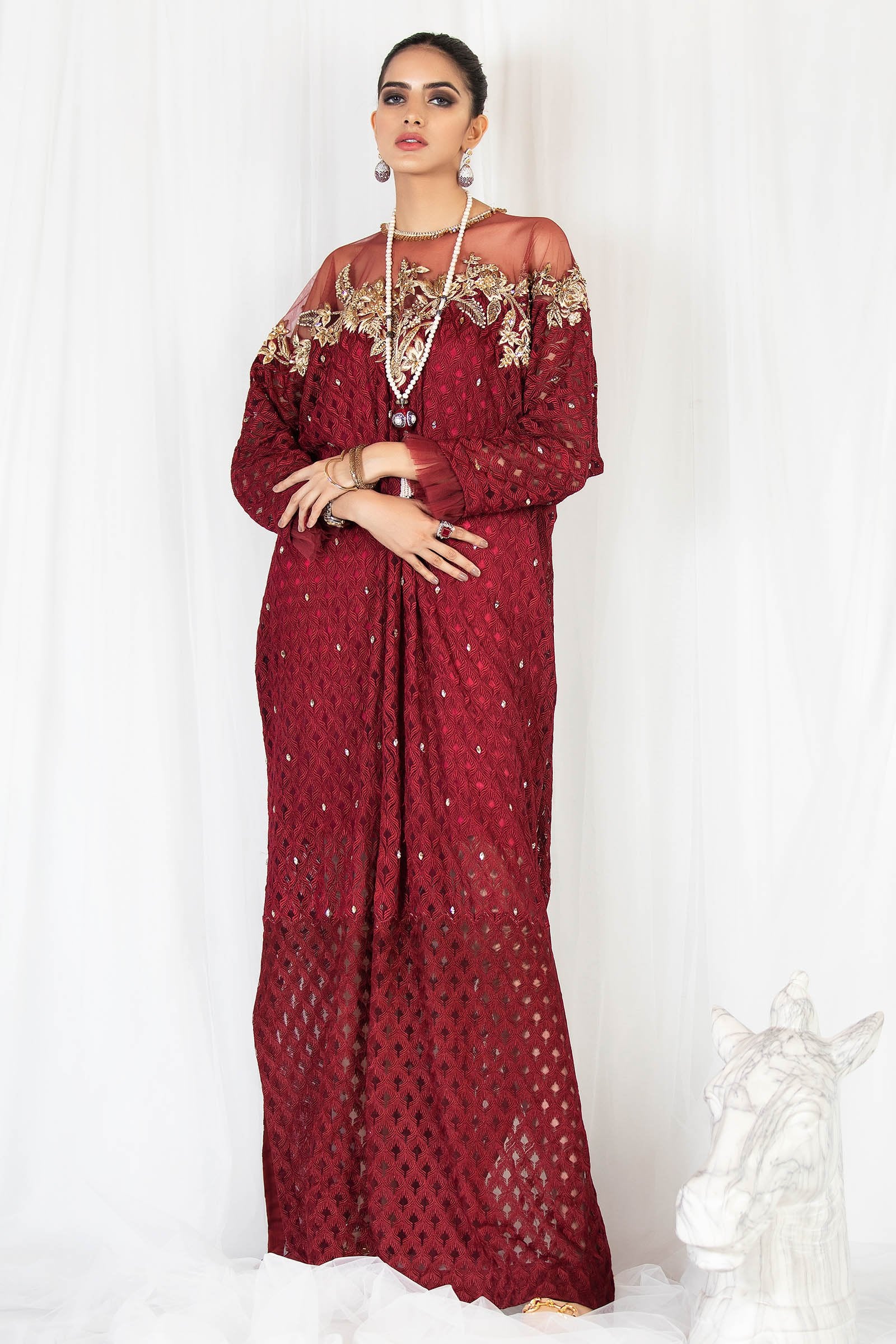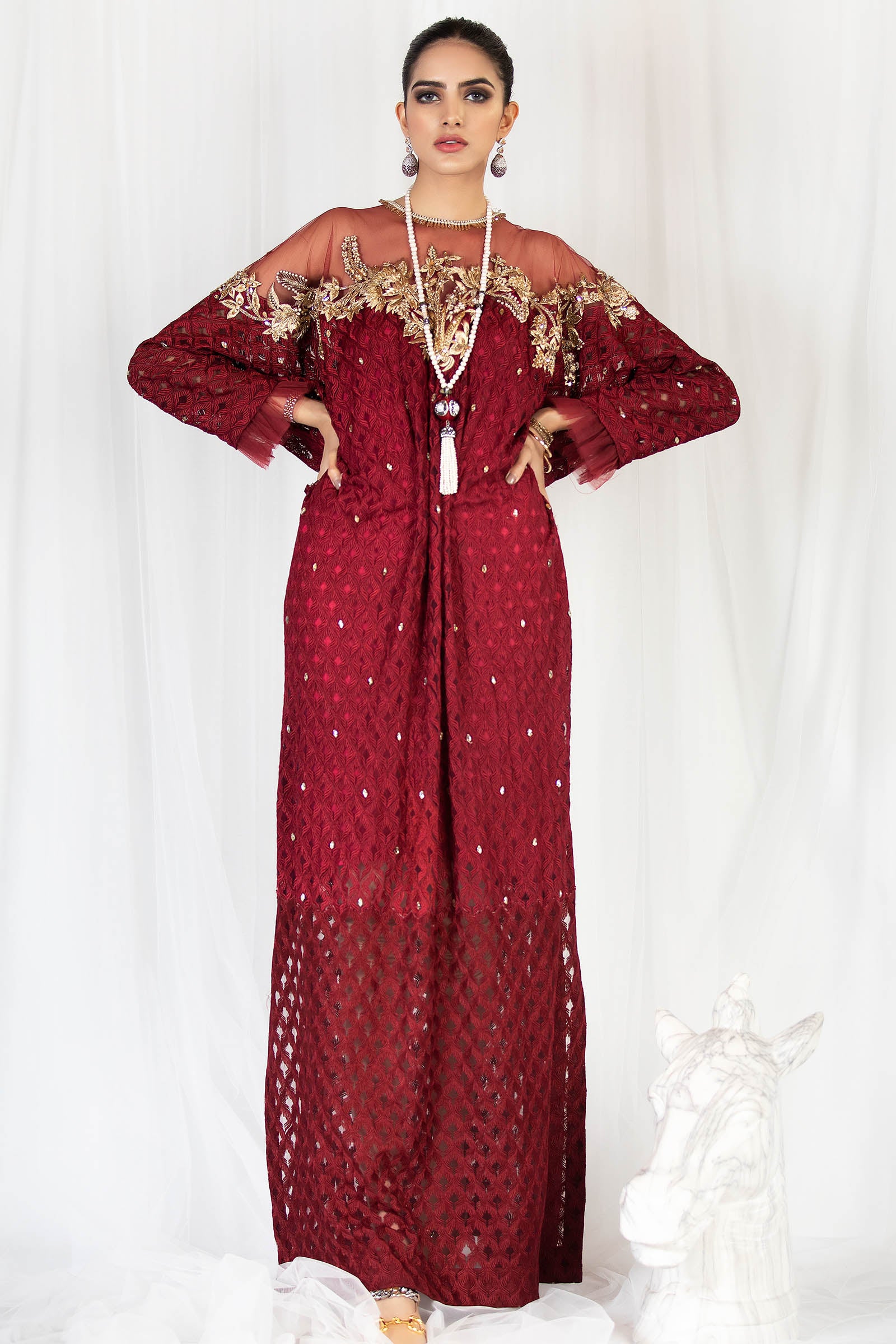 Embroidered net fabric with crystal spray on the front and embroidered neckline.