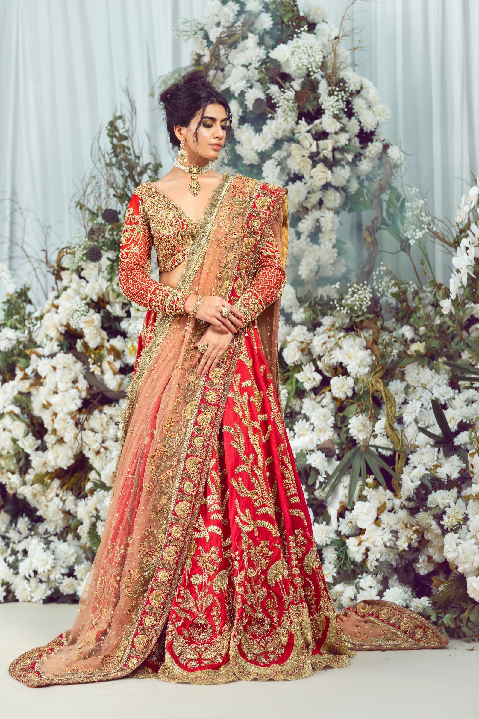 The beautiful scarlet lehnga having pasileys on it with materails such as dabka, kora and naqshi paired with a heart shaped classic choli with all antique embelishments and a contrast peach net dupatta with red borders to compliment the enrtire look of a bride.