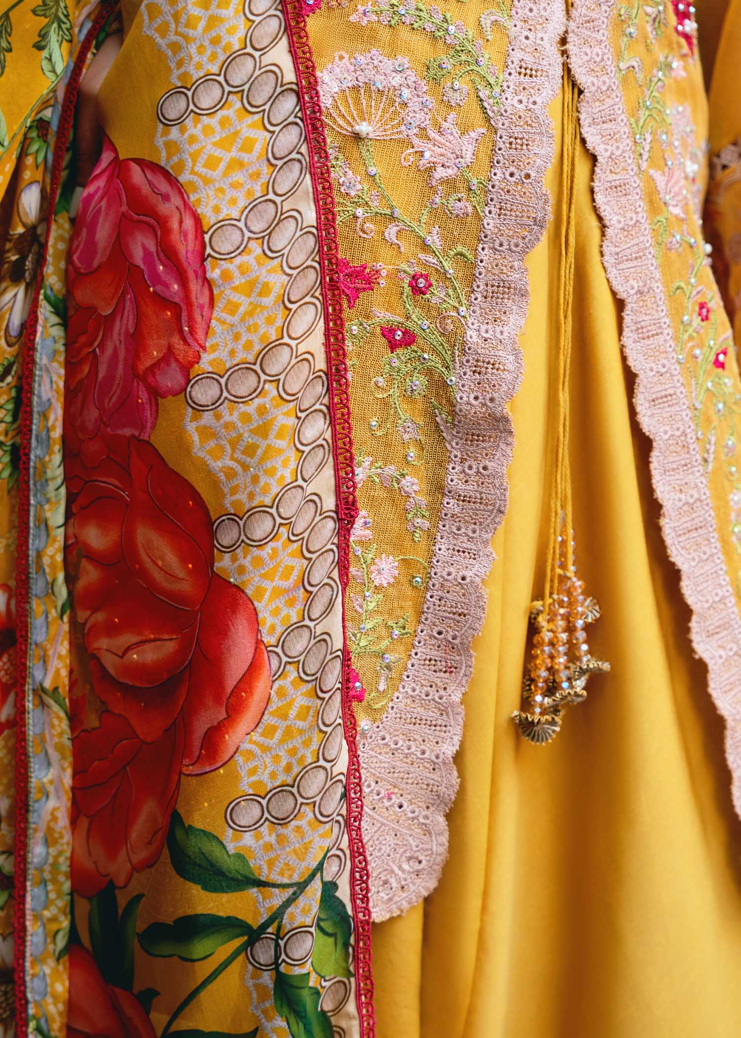This design truly encapsulate dandelions being touched by a warm summer breeze Reclassify elegance with our emerging creation ‘MAEVE' adorned with gorgeous floral embroideries embellished with pearls and stones . The dress is complimented by an open embriodered jacket with stylish sleeves as a sensual addition to its beauty. Along with a gorgeoues silk digital printed dupatta and voulmed viscouse bottoms to complement this gorgeous SH look!
