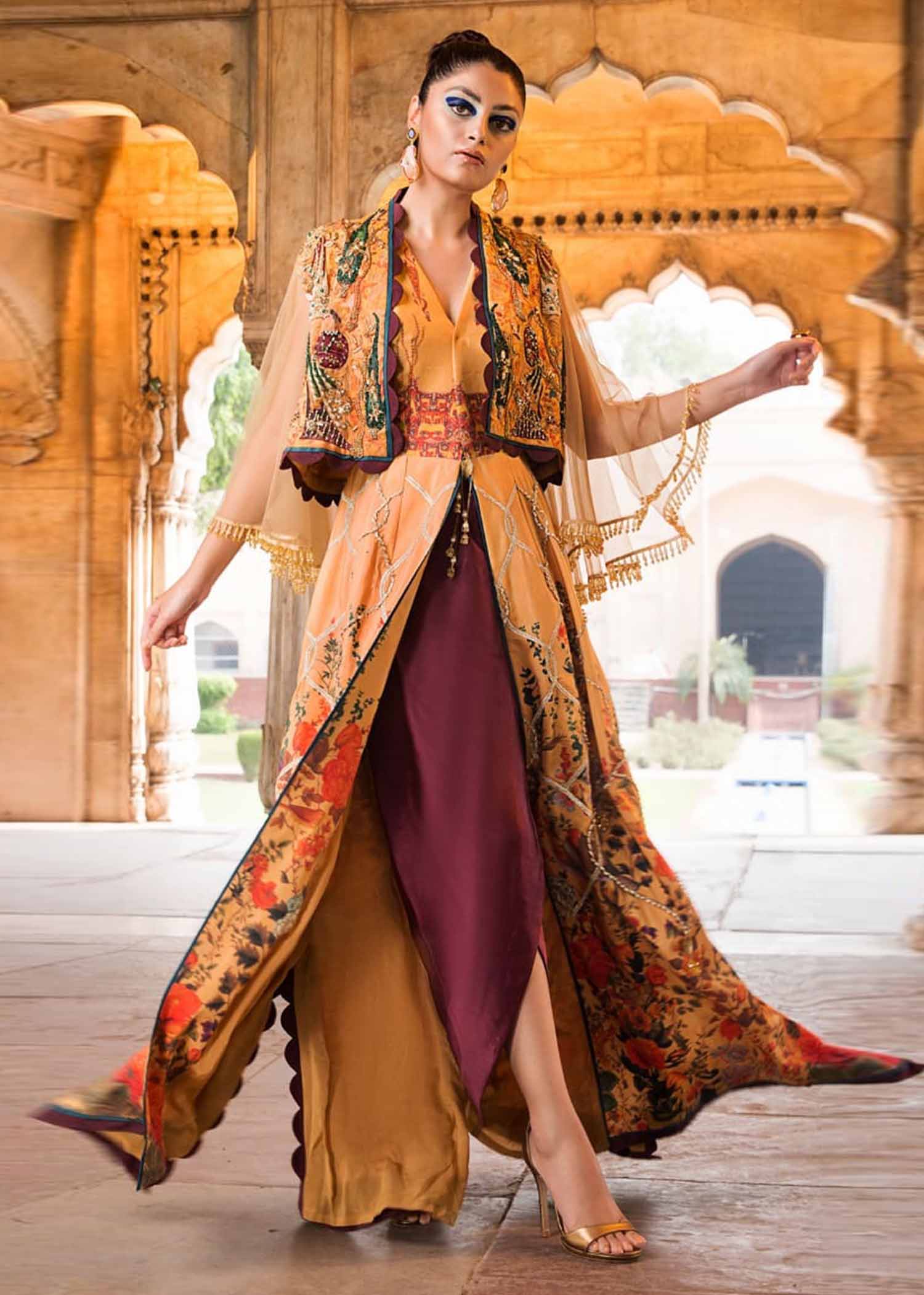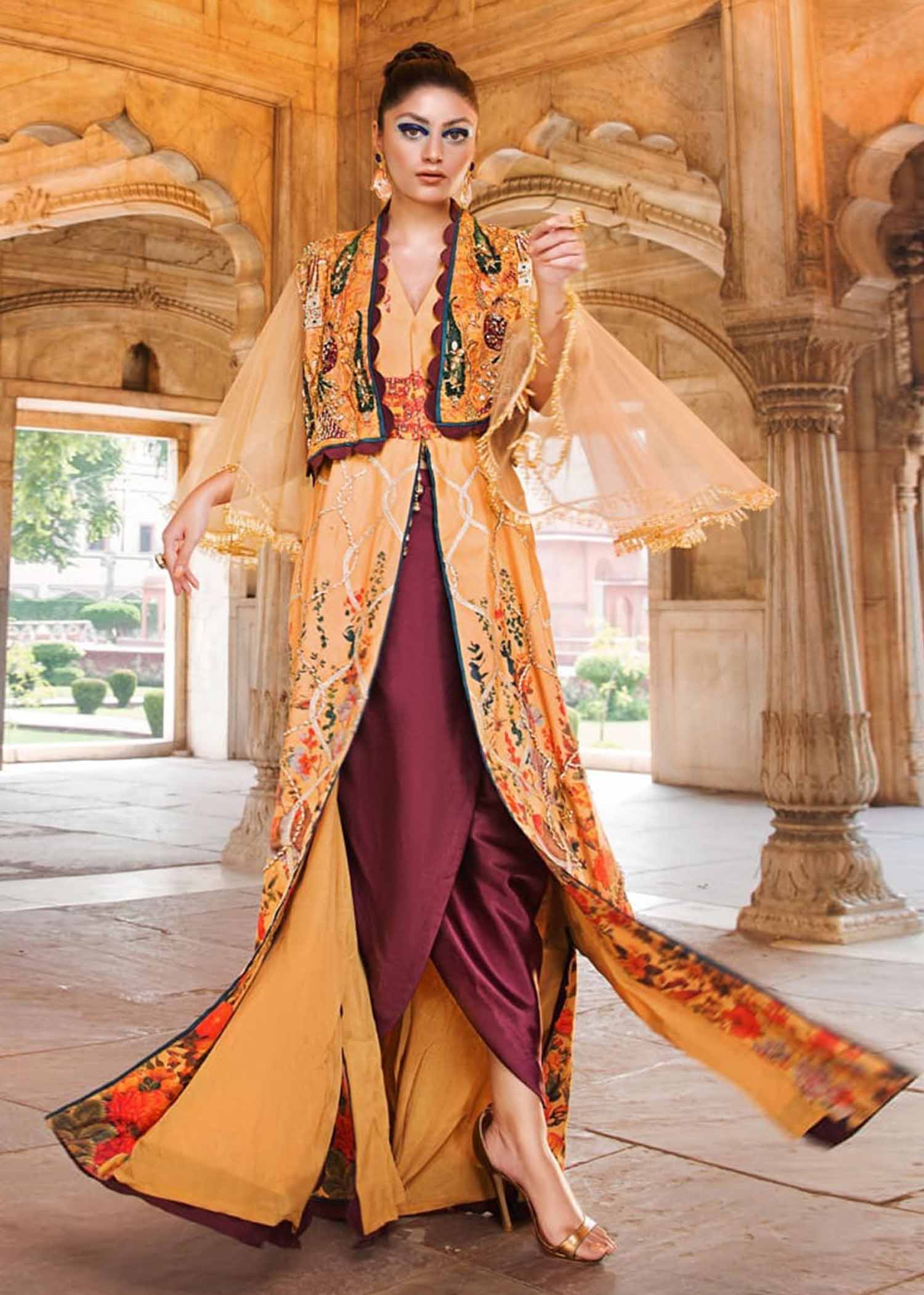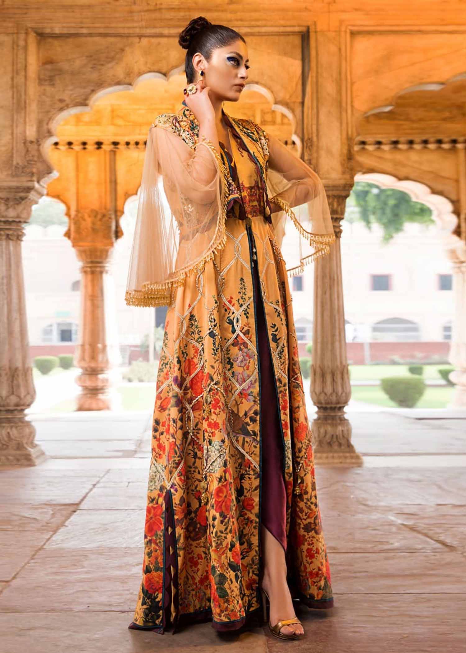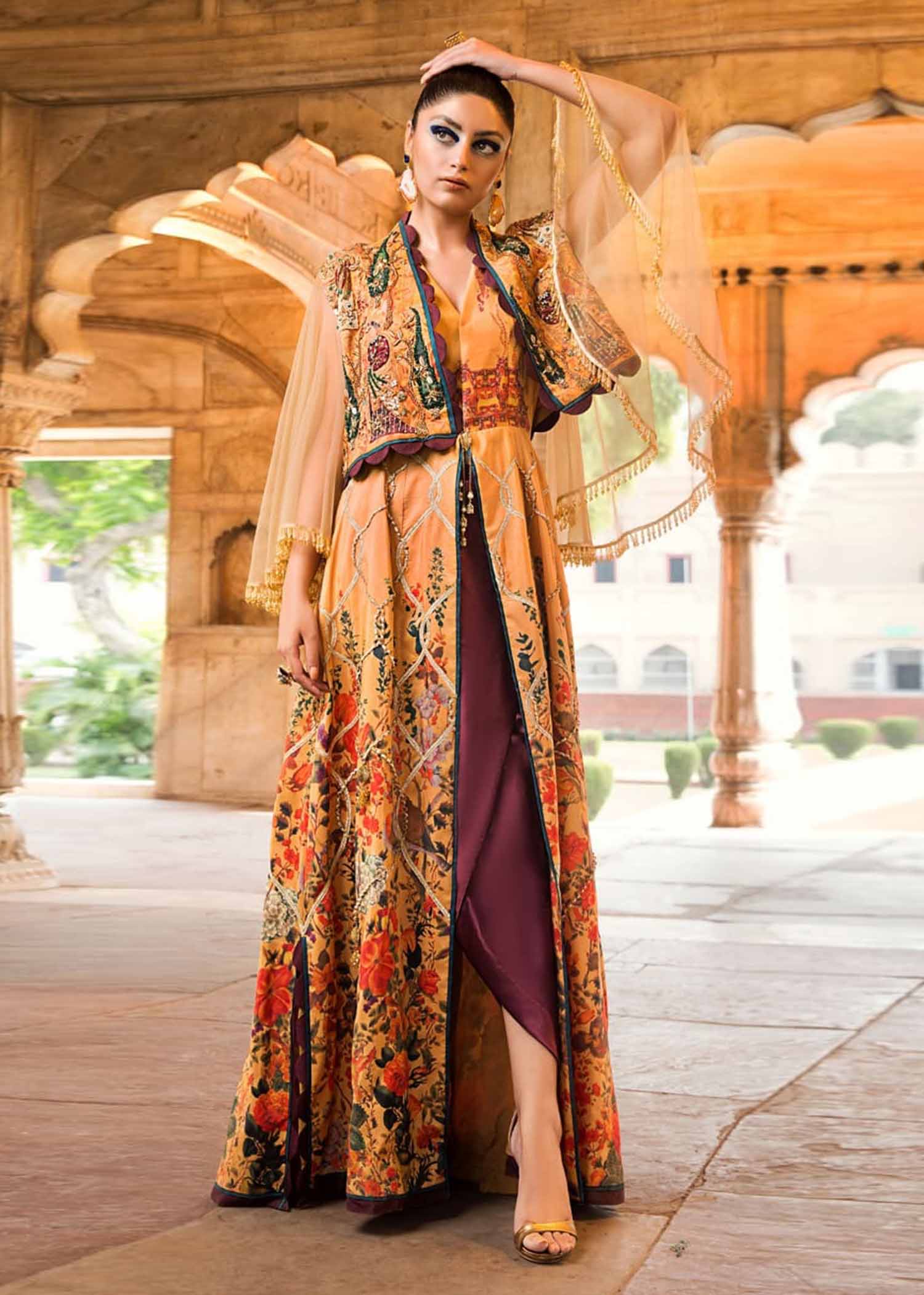Our Signature Persian Shikargah Printed Pishwas ,Heavily Hand Embellishment With Jacket ,Paired With Drapped Pants To Complete This Look.