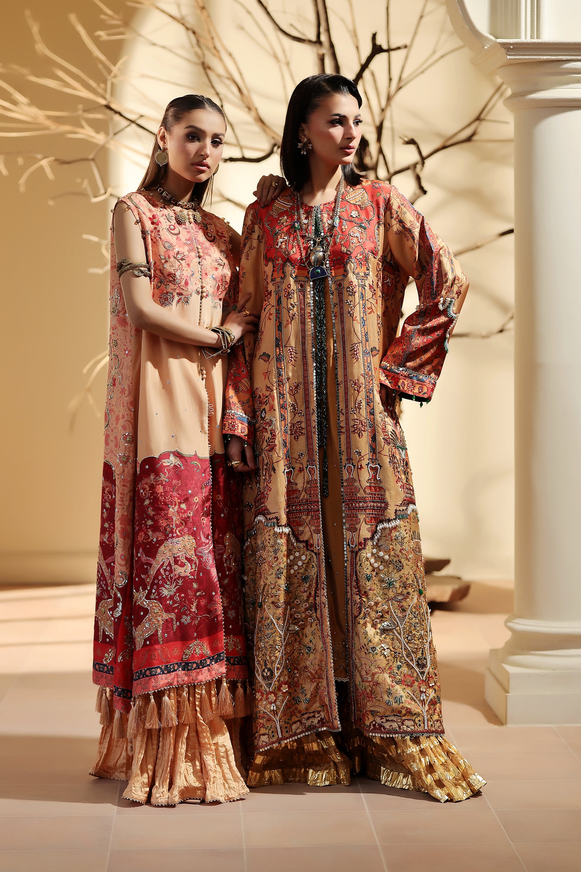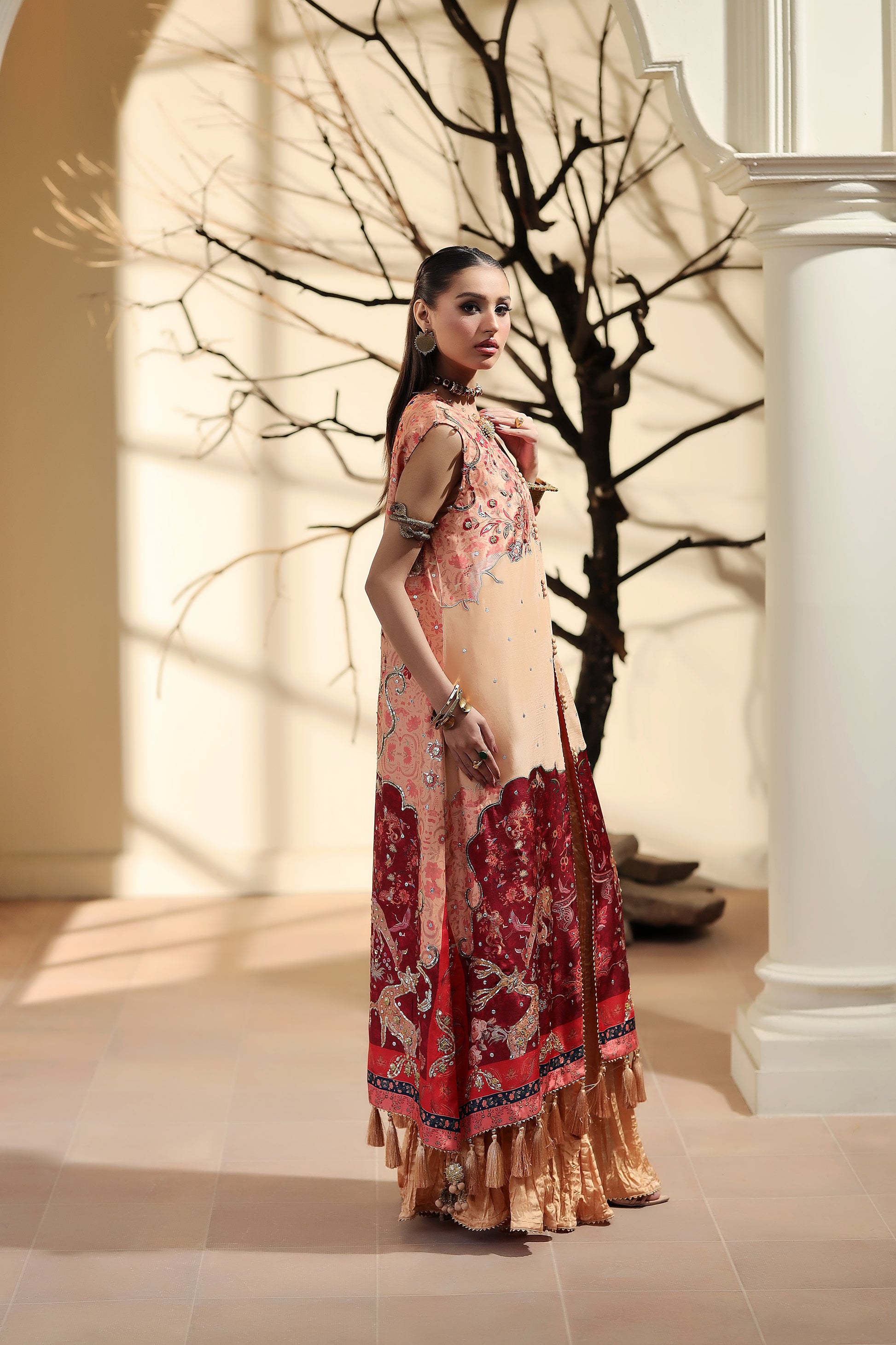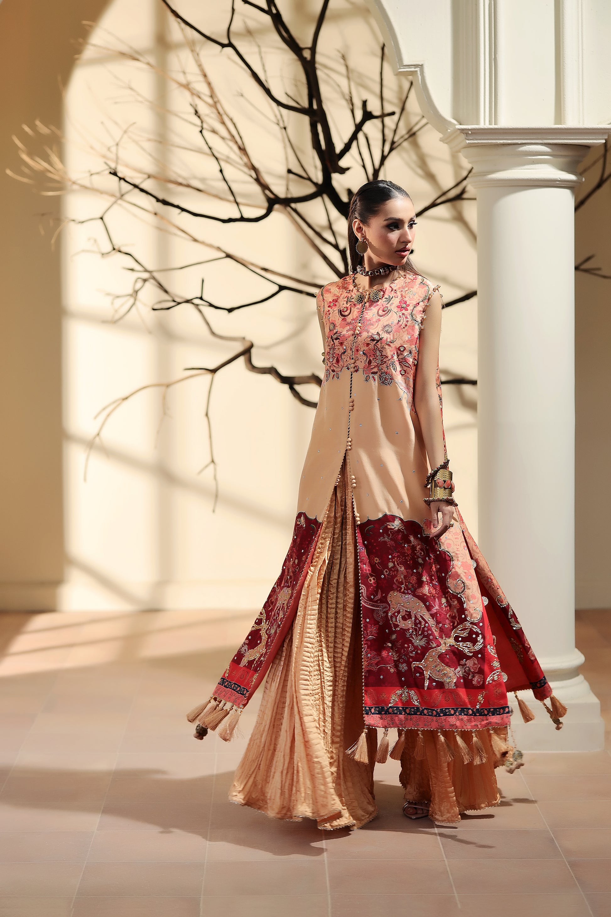A canvas of lovely peach pure silk is artfully illustrated with detailed shikargah print.The relaxed, much loved silhouette has a universally flattering neckline, adorned with delicate pearls.Finish the look with crushed sharara pants and a inner top . (as pictured)(sleeves can be attached )
