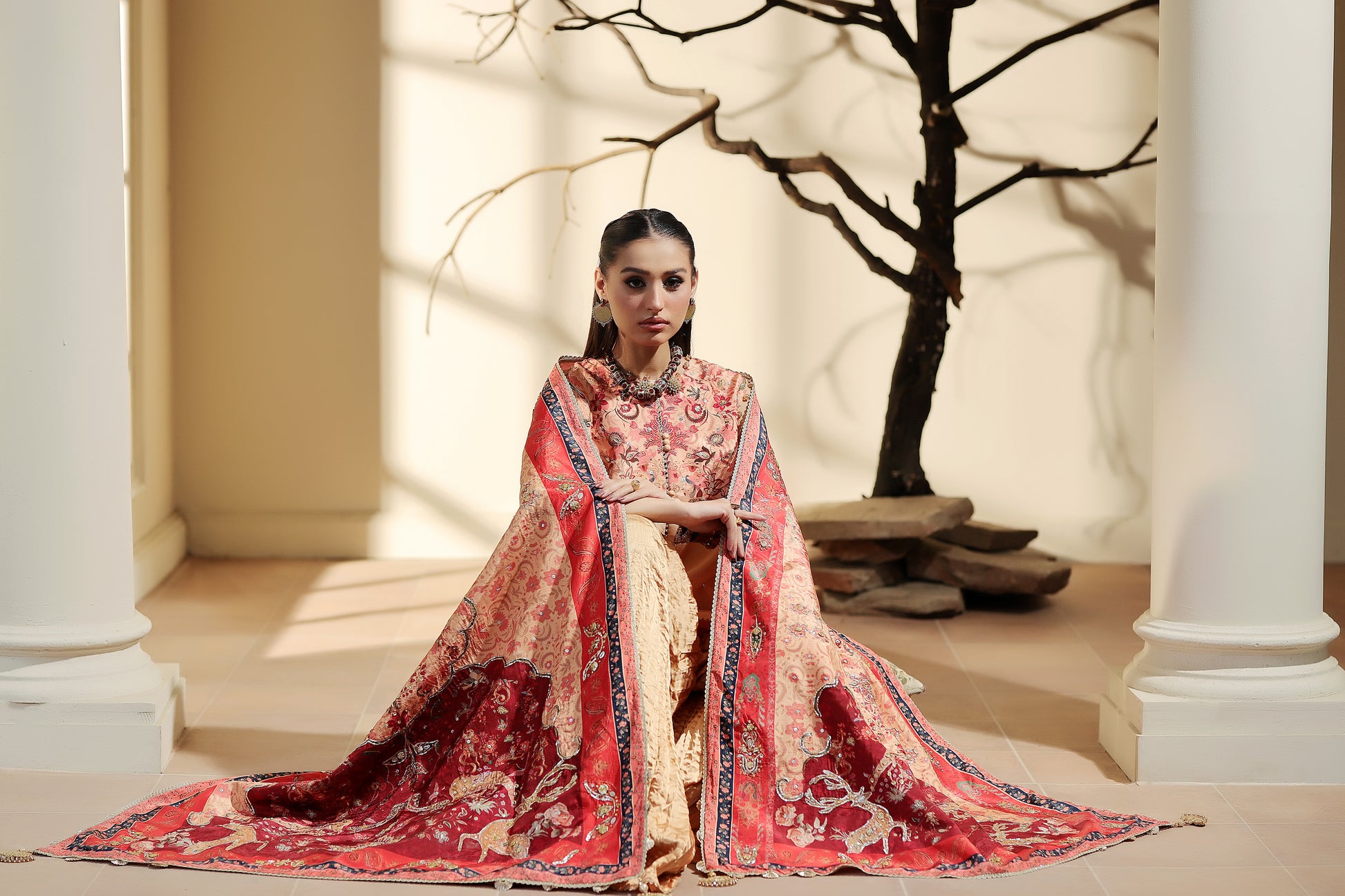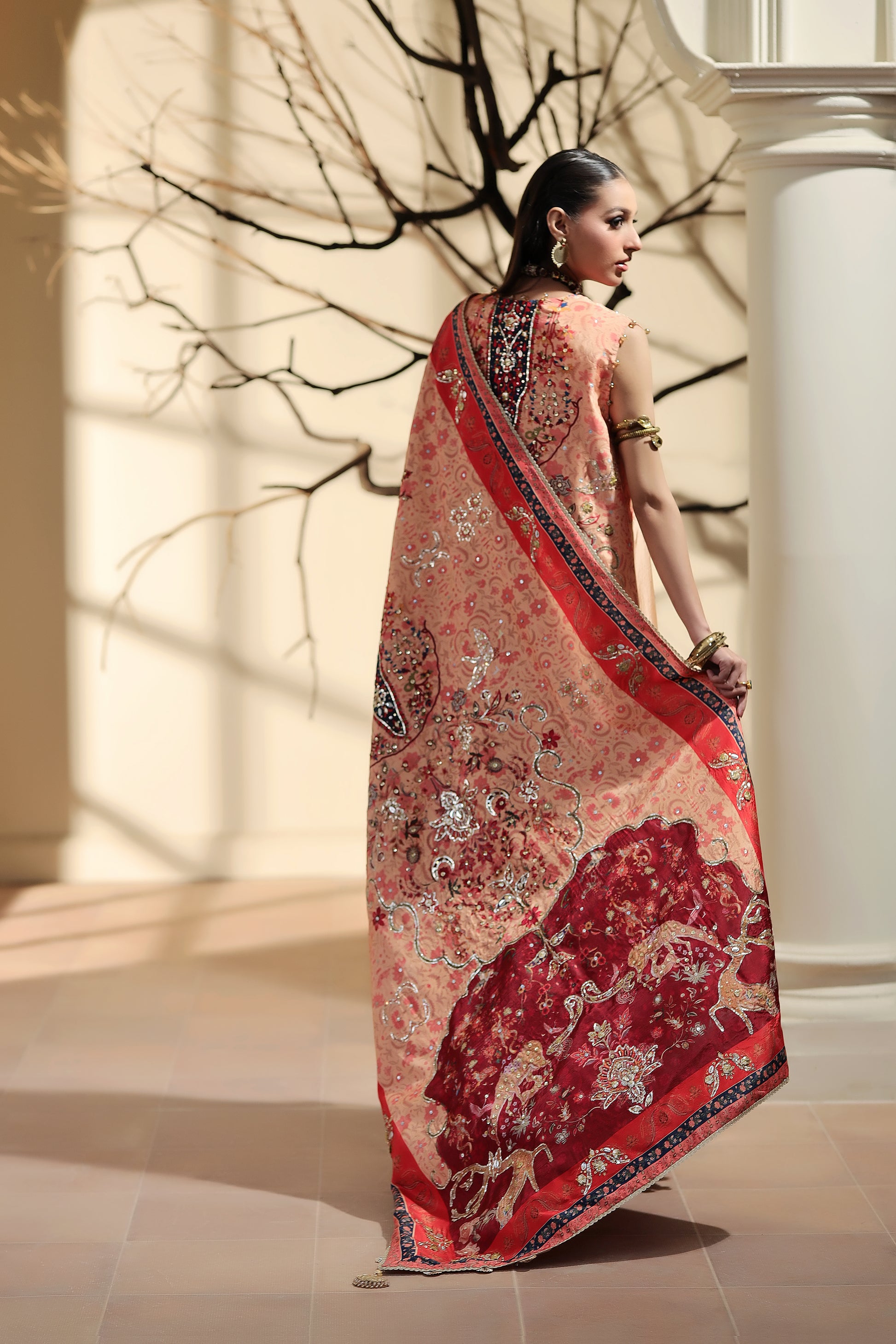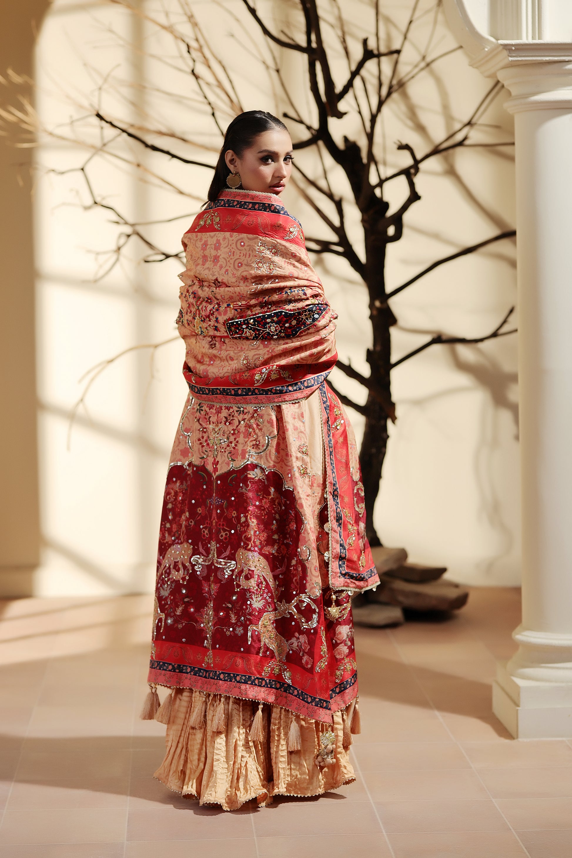 Discover elevated, refined prints created in-house with immaculate tailoring and steal the show this season, this shawl has two side paloo side adorned with shikargah prints and deatiled hand embellishments .