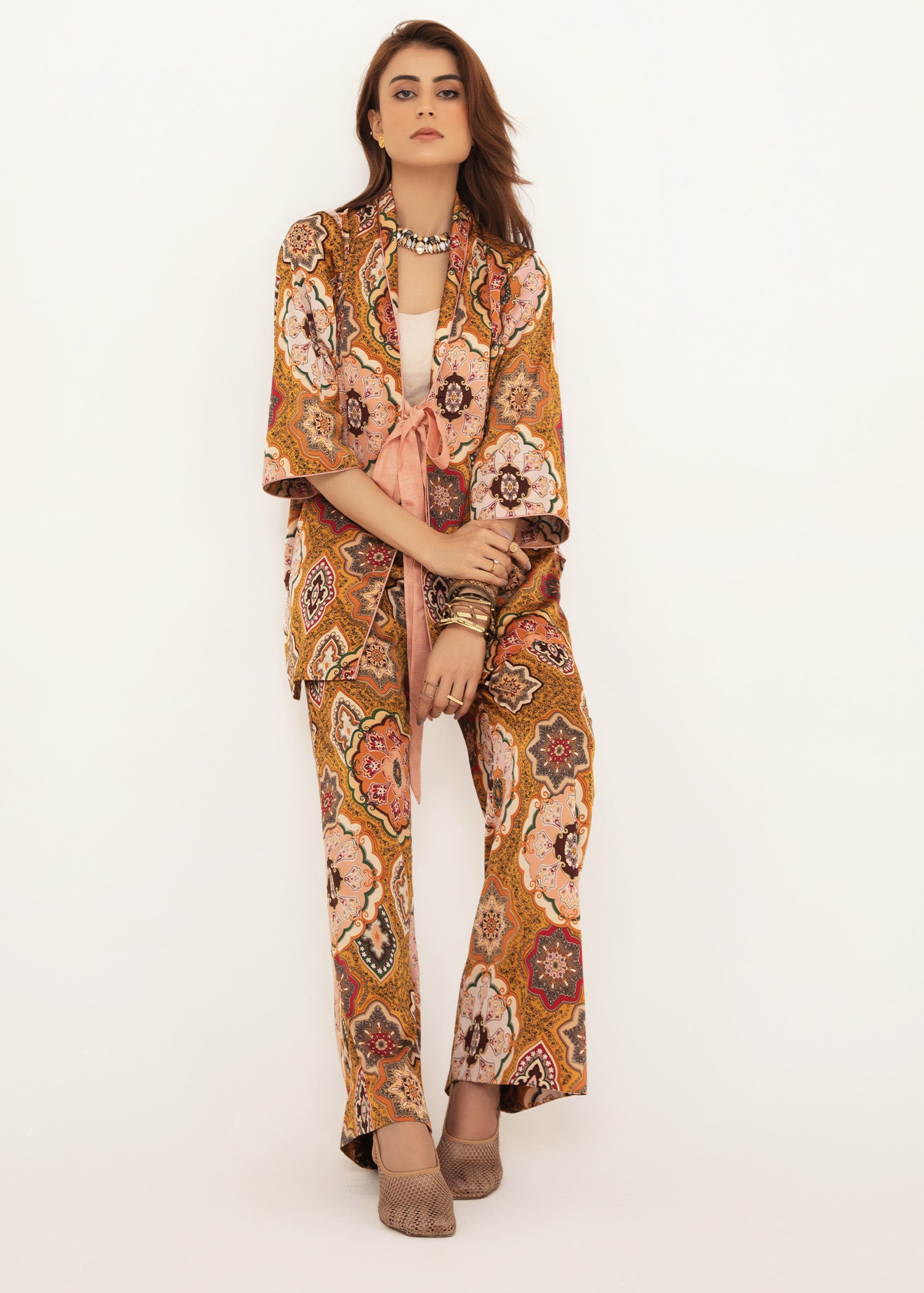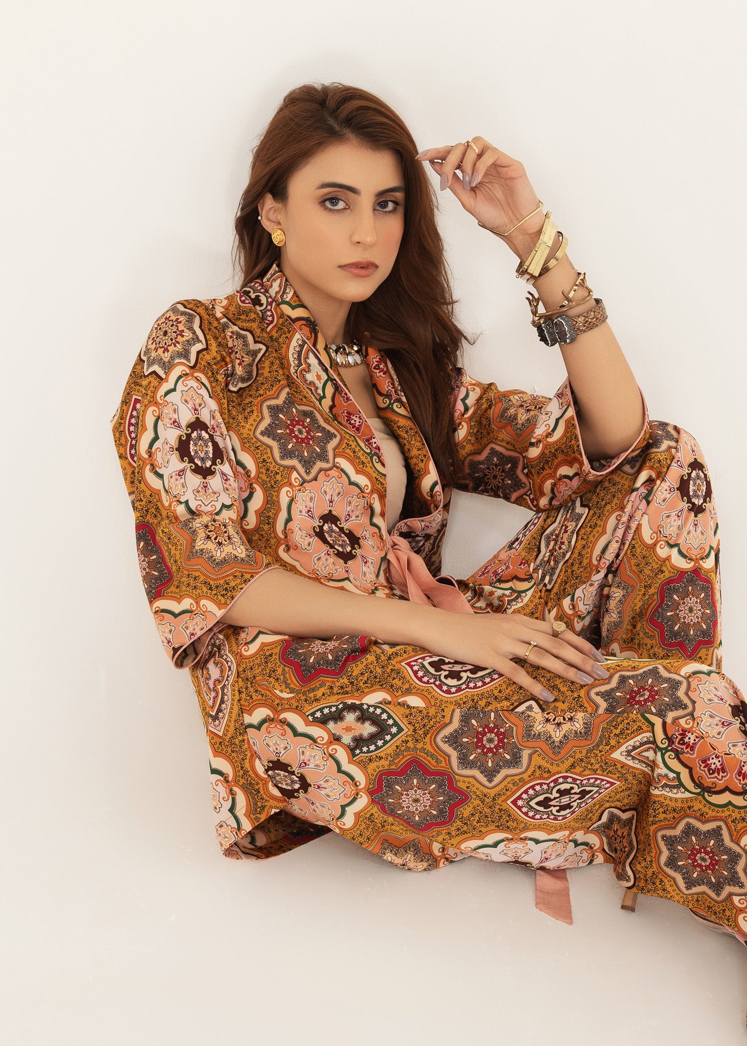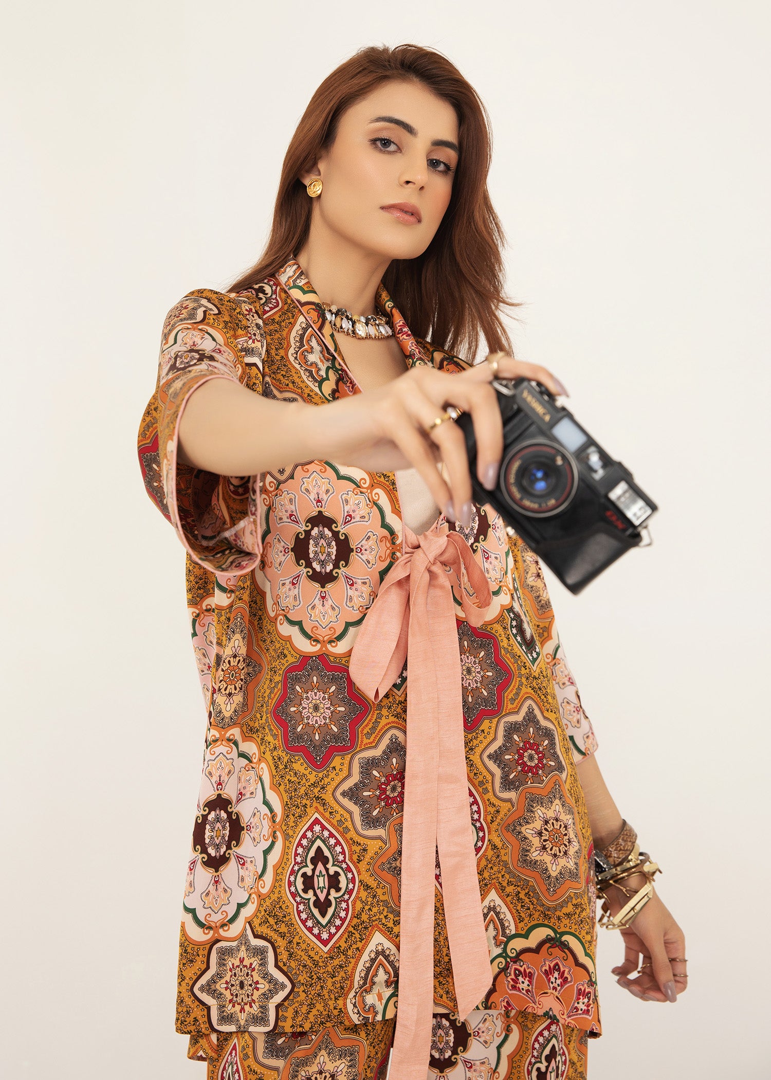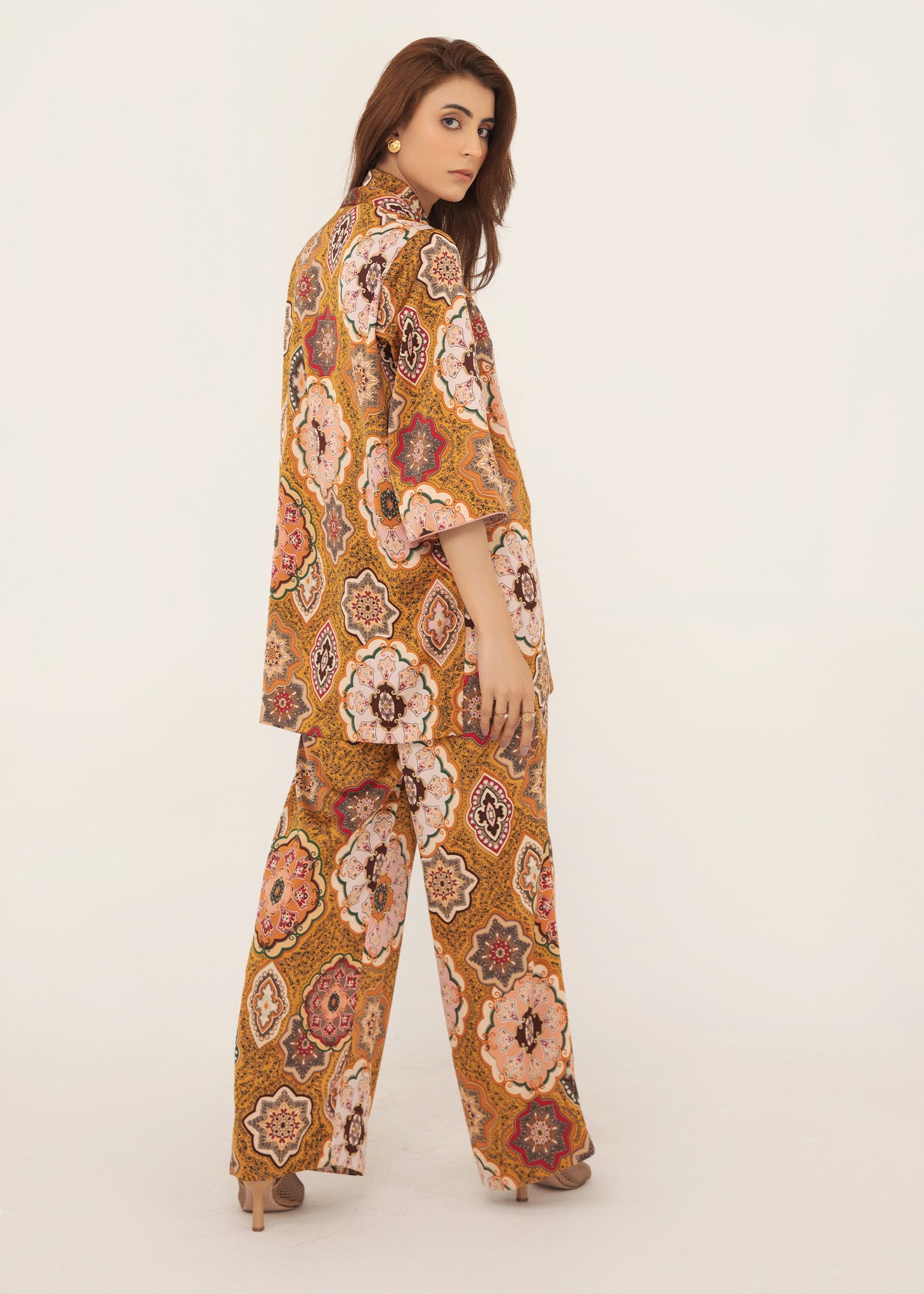 Digital printed mustard cord set with 3 quarter sleeves paired with cuollotes.