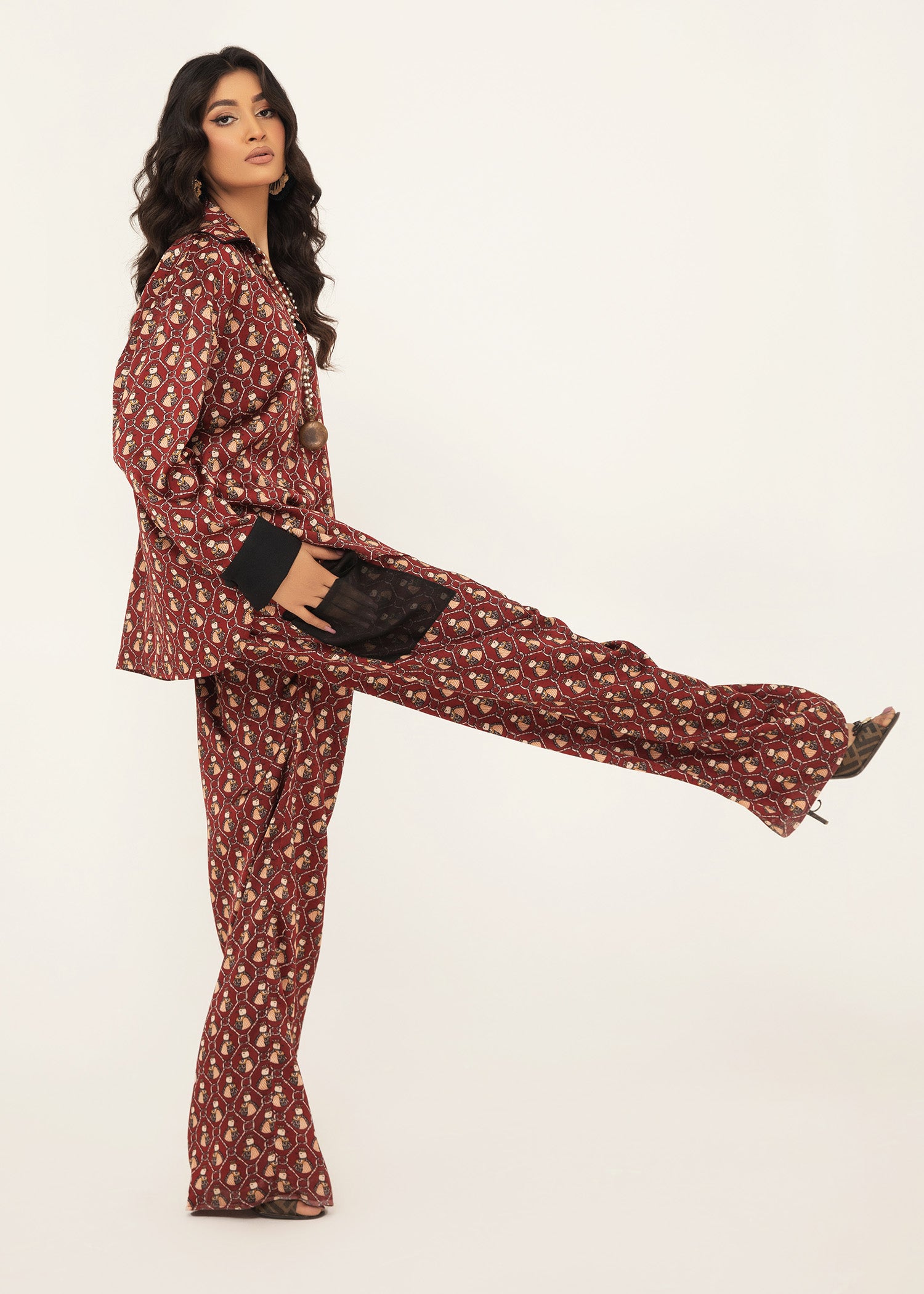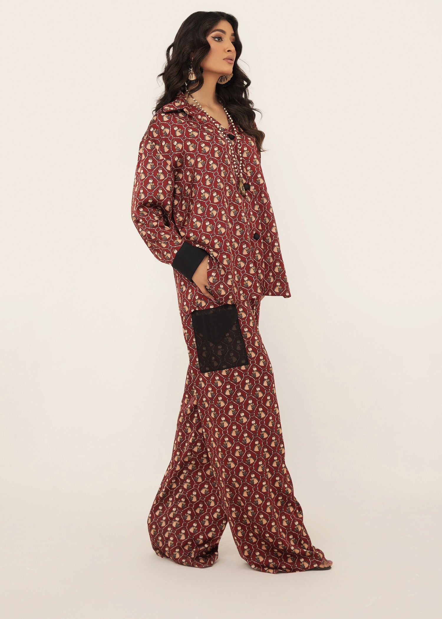 Printed collar shirt with long sleeves ,straight hem with button up front closuer . paired with cuolottes with organza pockets.