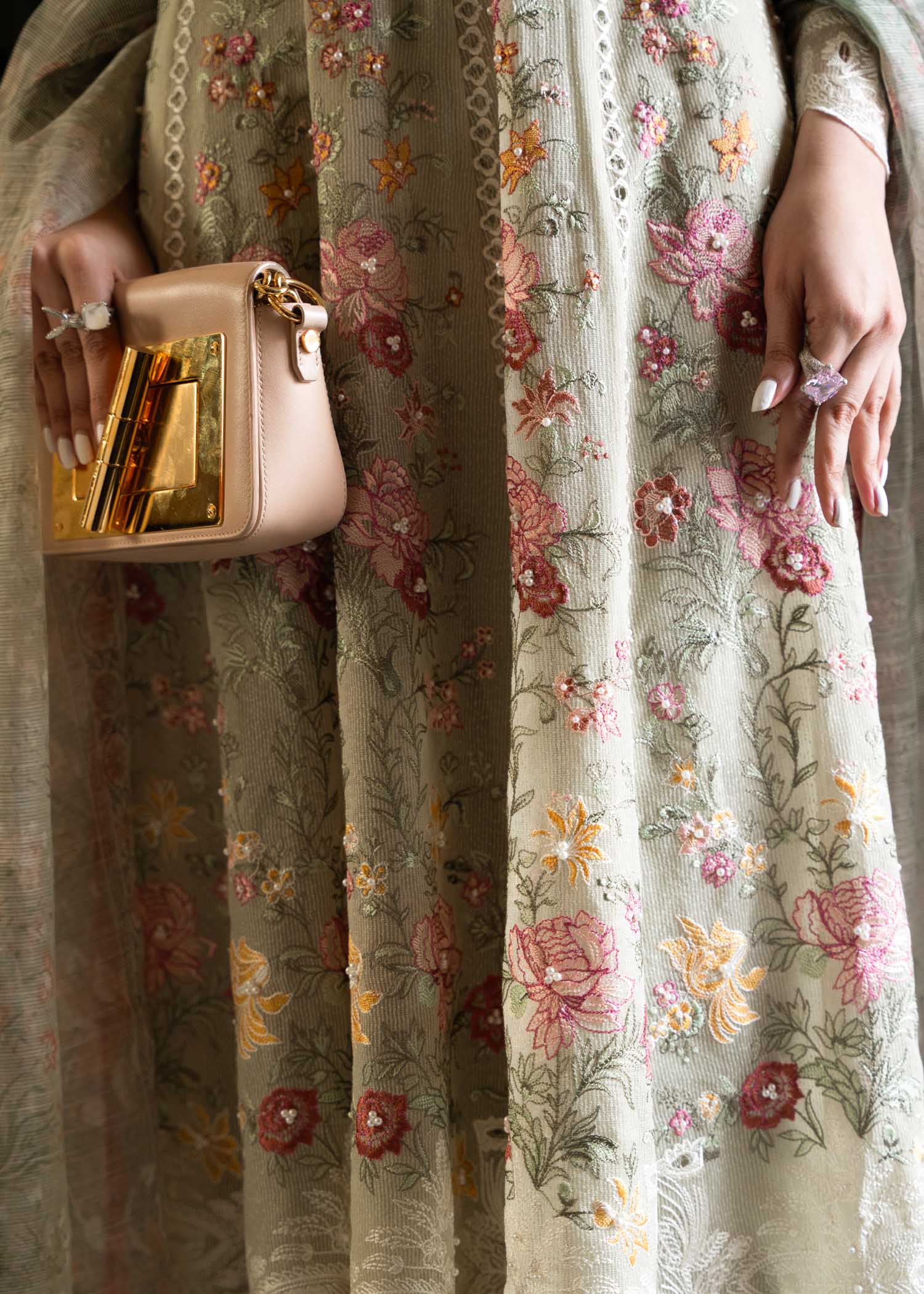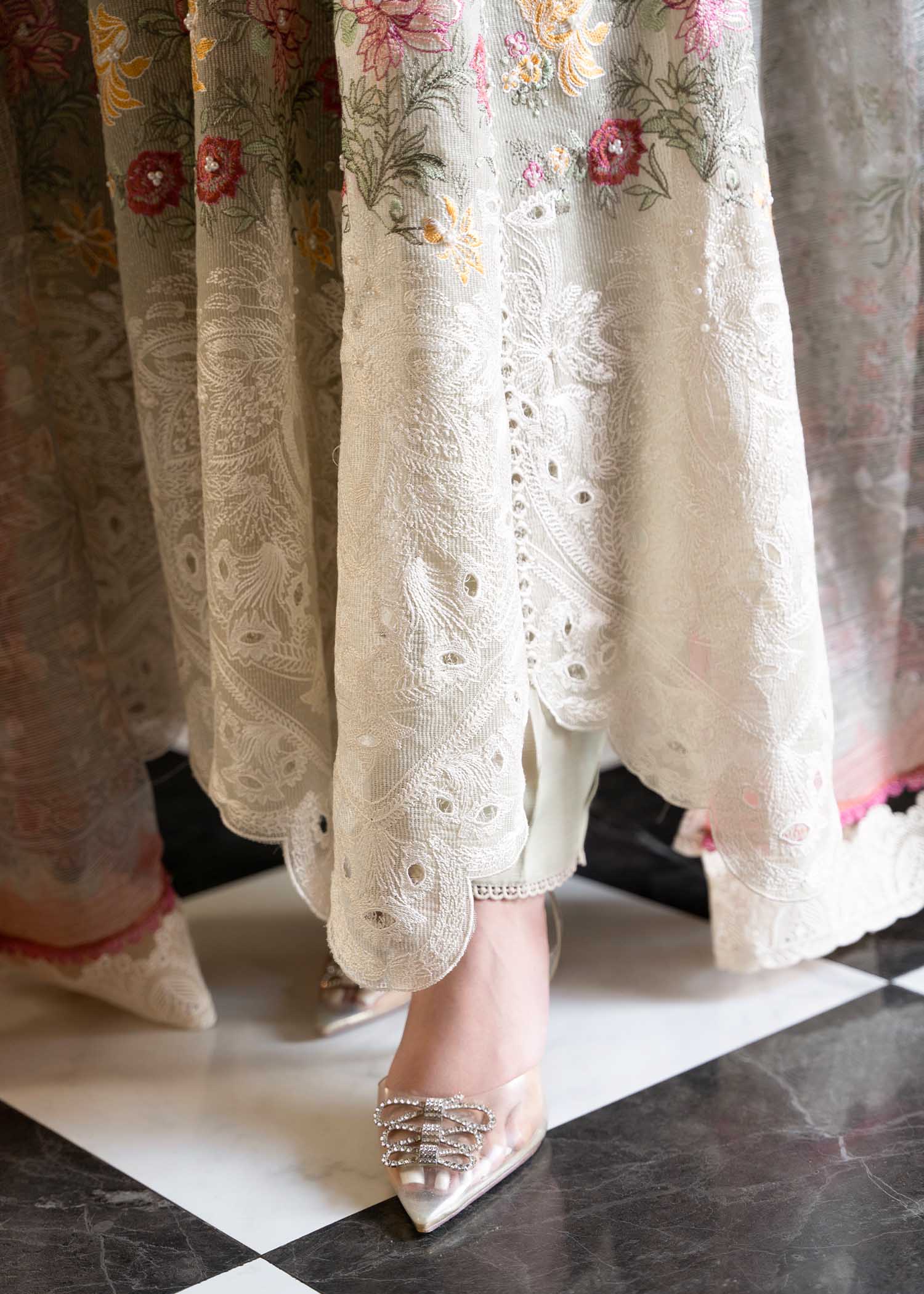 MIHA is a kalidar pishwas having side slits ,crafted with riched cotton net ,adorned with colorfull embroidery around neckline and panels .adding details with cutwork on the hem to make it a flawless running design , paired with a cotton net digital printed dupatta and viscose tappered pants.