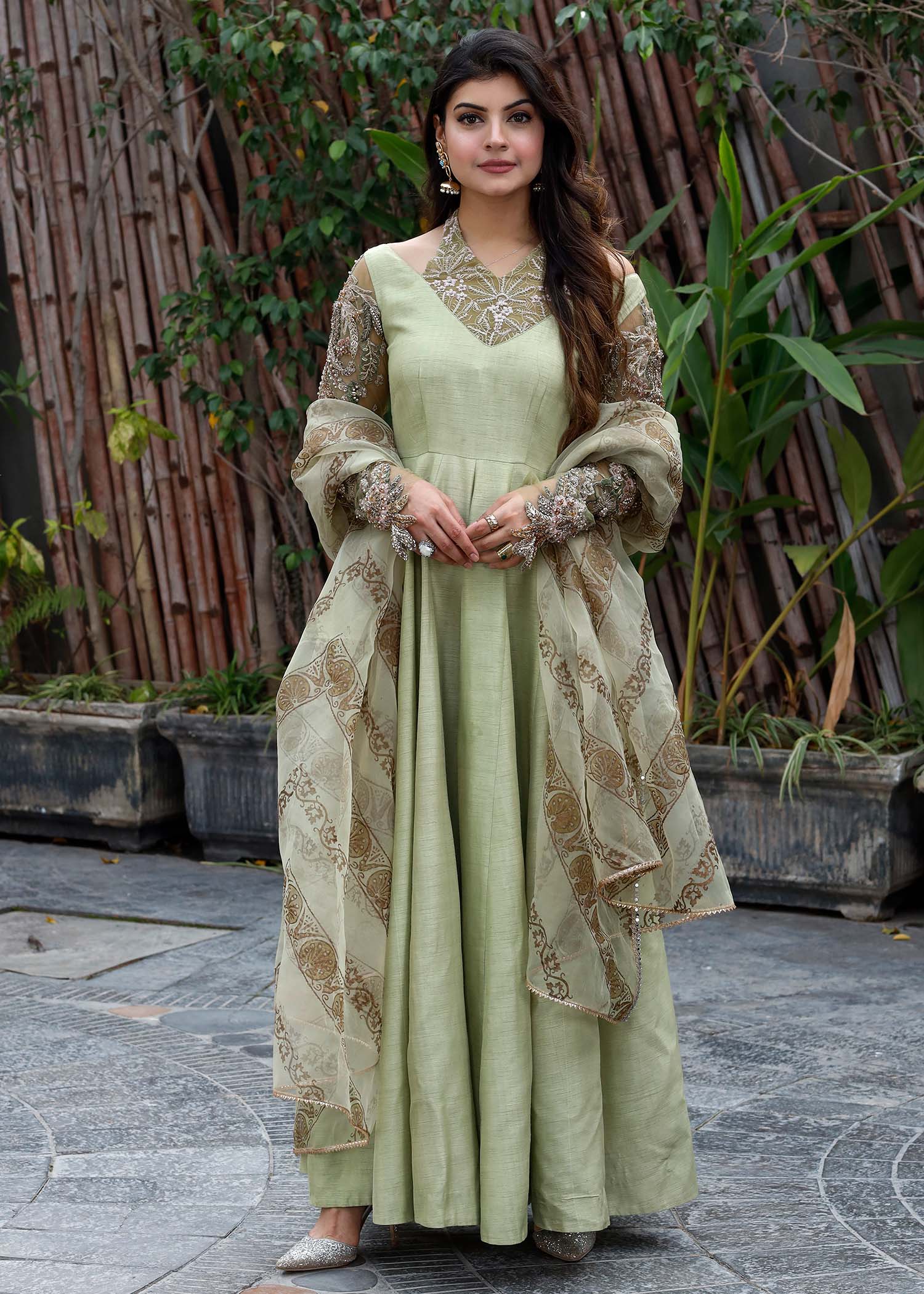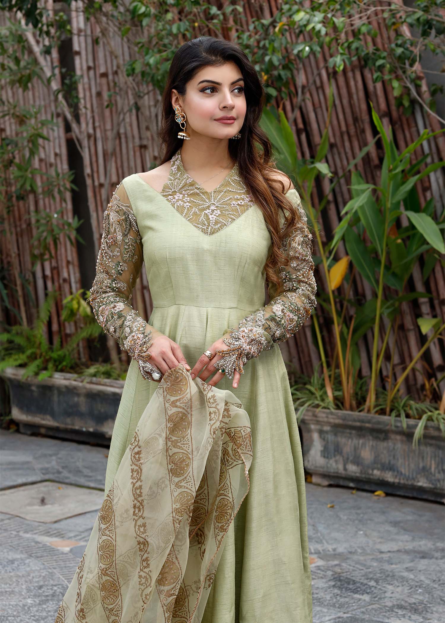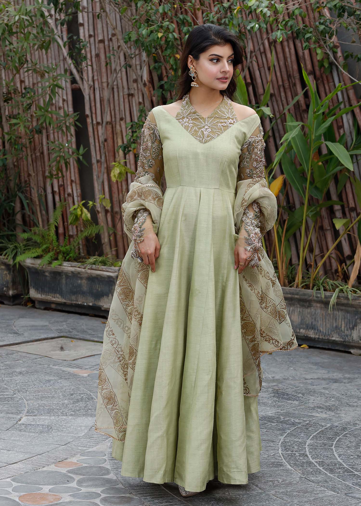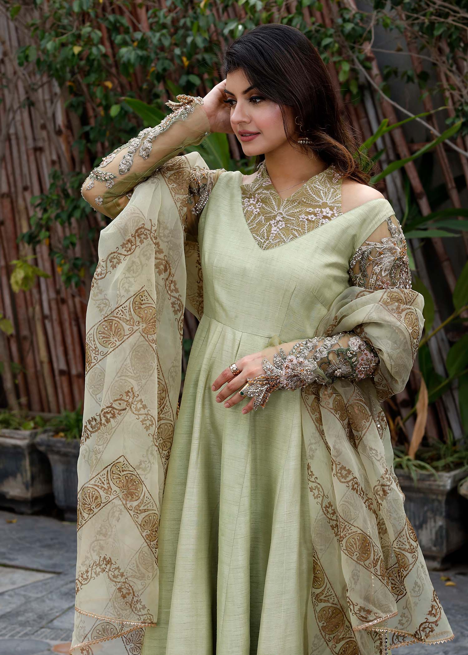 MINT LUMINANCE IS A GORGEOUS PISHWAS ,WITH HEAVILY EMBELLISHED SLEEVES AND A MODISH NECKLINE PORTRAYING THE CLASSIC SH DESIGN PHILOSOPHY.PAIRED WITH ORGANZA BLOCK PRINTTED DUPATTA.