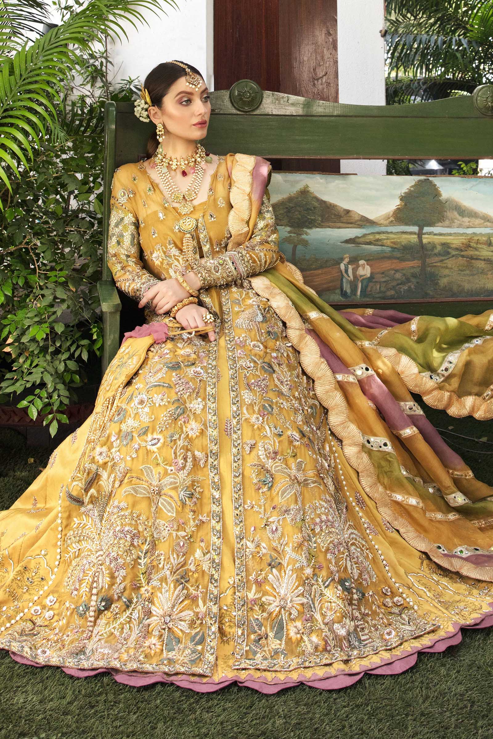 Embroidered and hand worked front open jacket made on pure organza. Paired with block printed lehnga with hand worked details and scalloped finishings. Multi colored dupatta, with mirror worked lace on all seams. Comes with a plain pk raw silk bustier.
