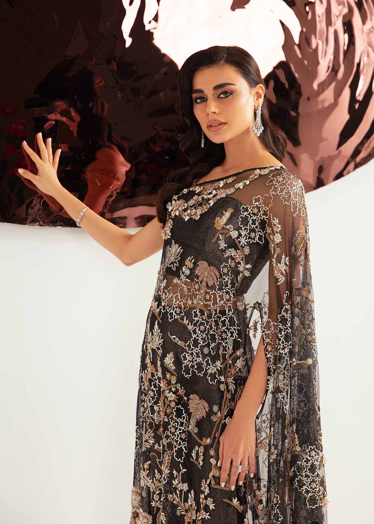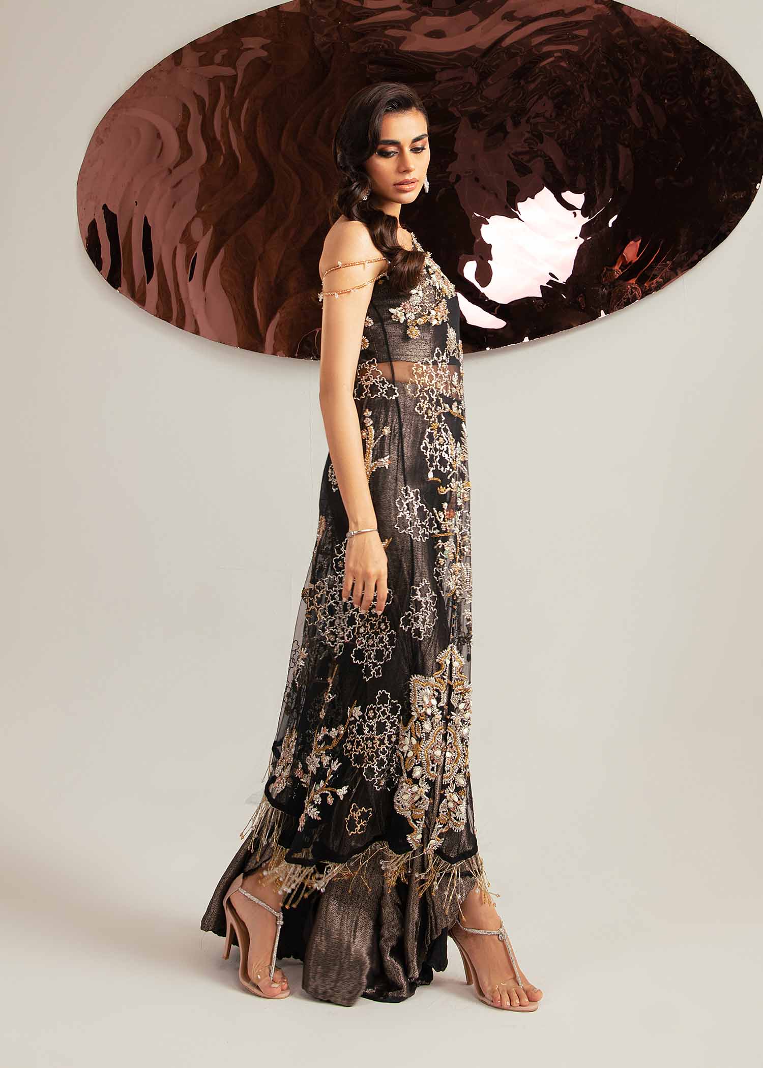 The mystic night visualized one arm outfit is fully hand embroidered in 3D jewel embellishments, pearls, cushion crystals, sequins, zardozi work sewn on flora and fauna embroidery. It is paired with a sleek modern layered pants.