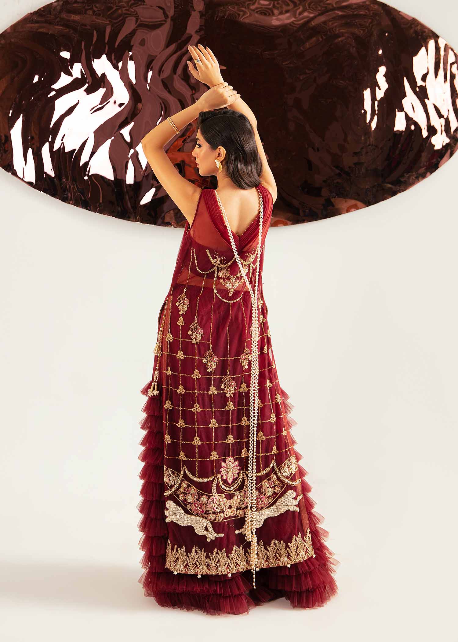 Our “Platinum Red” ensemble, enriched with an amalgamation of deep red with encrusted work of Zardozi, enhanced with delicate gold sequins work and 3D layering techniques, making it a majestic formal pick for any festivity.