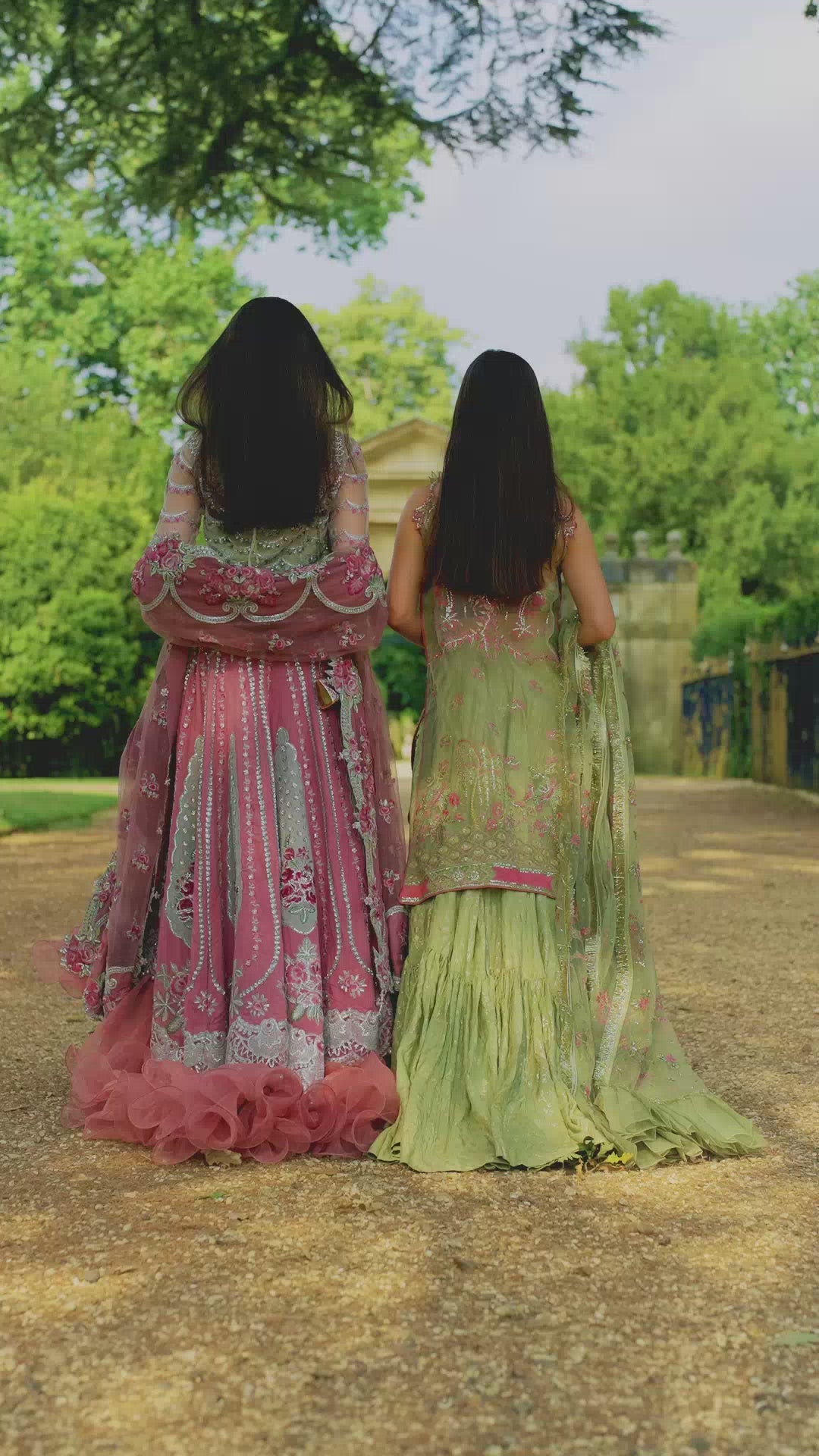 Introducing “SAHAR,” a refined ensemble that redefines elegance.shirt is crafted in organza , in a lighter shade of mint, is adorned with exquisite gold and silver handwork , presenting a masterpiece of artistry tailored for the modern generation with a penchant for tradition. The ethereal net dupatta features intricate embroidery motifs and ruffels on the palo, adding an enchanting touch to the ensemble. Complementing this is a printed sharrara enhanced with delicate gota embroidered borders, completing the look with a fusion of sophistication and heritage.