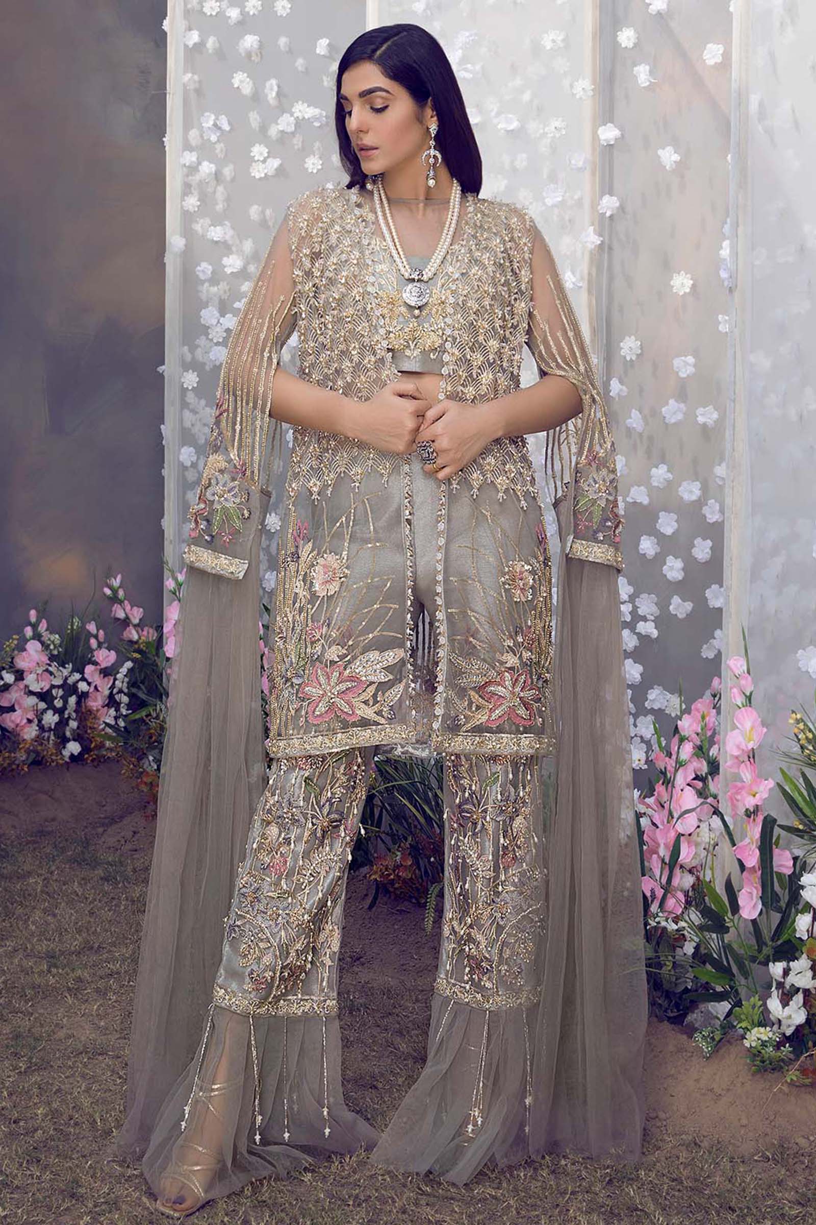 A spectacle of subtle sophistication & elegance,with regal modern cut Sang-E-Marmar is a frosty grey beauty adorned with intricate handcrafted floral thread work & motifs.