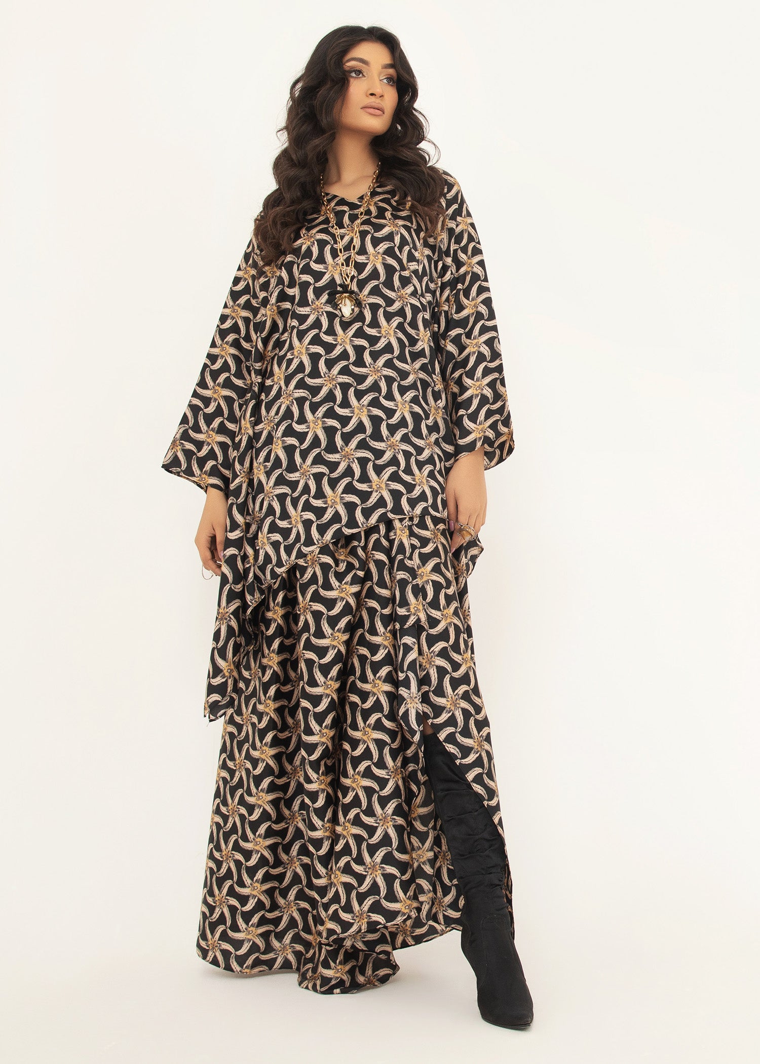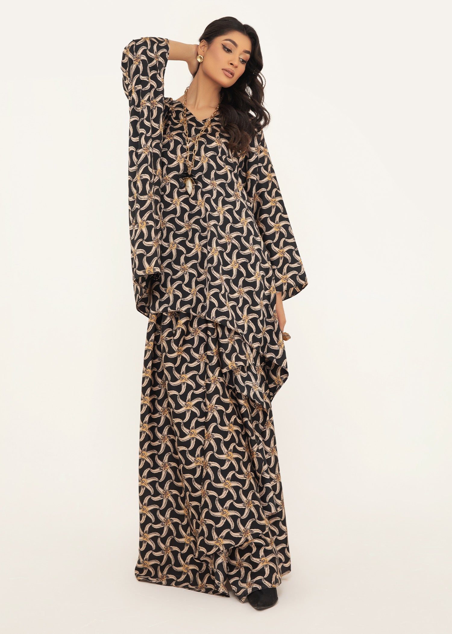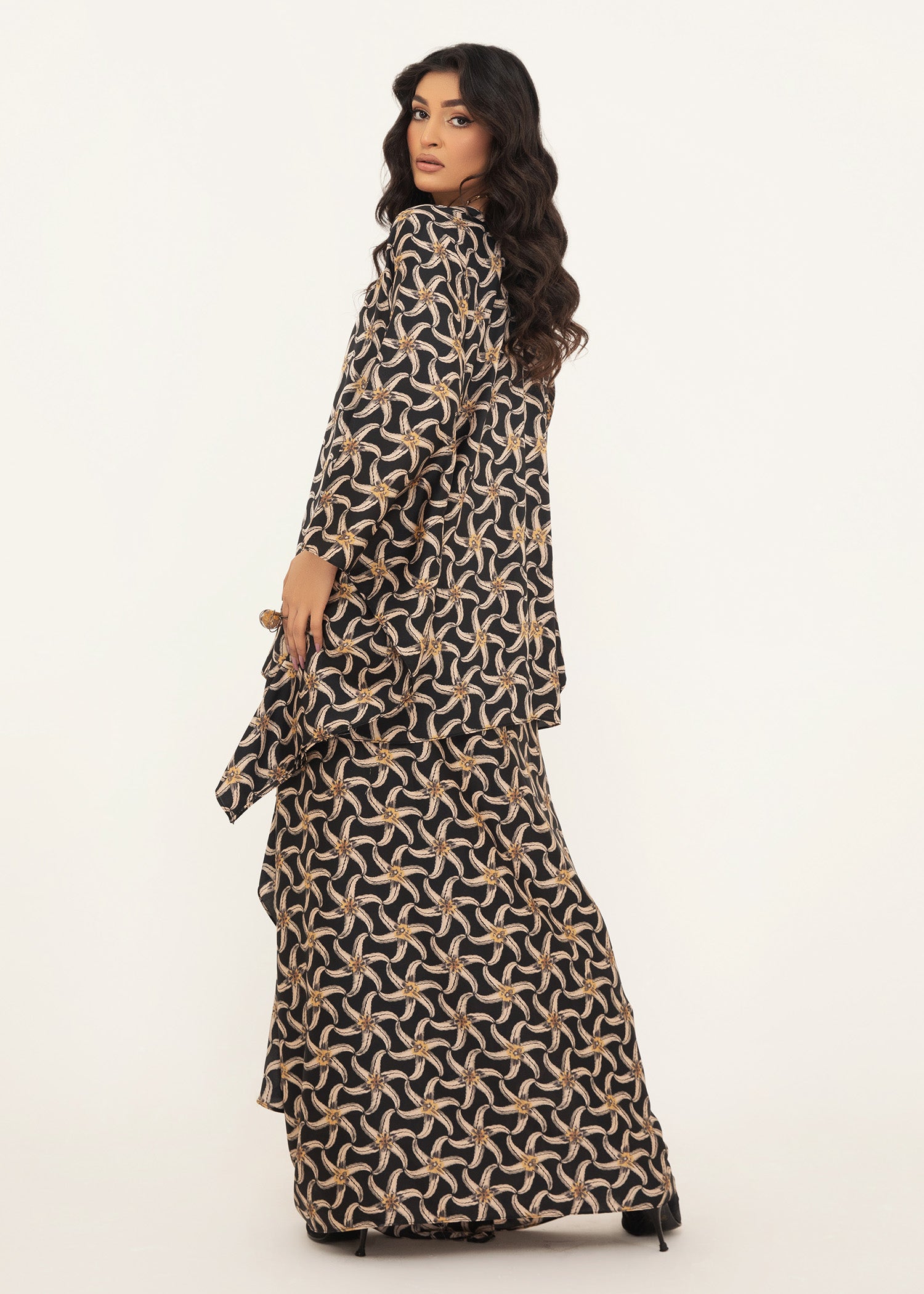Printed drapped skirt paired with a short kaftan crafted in premium rod silk.