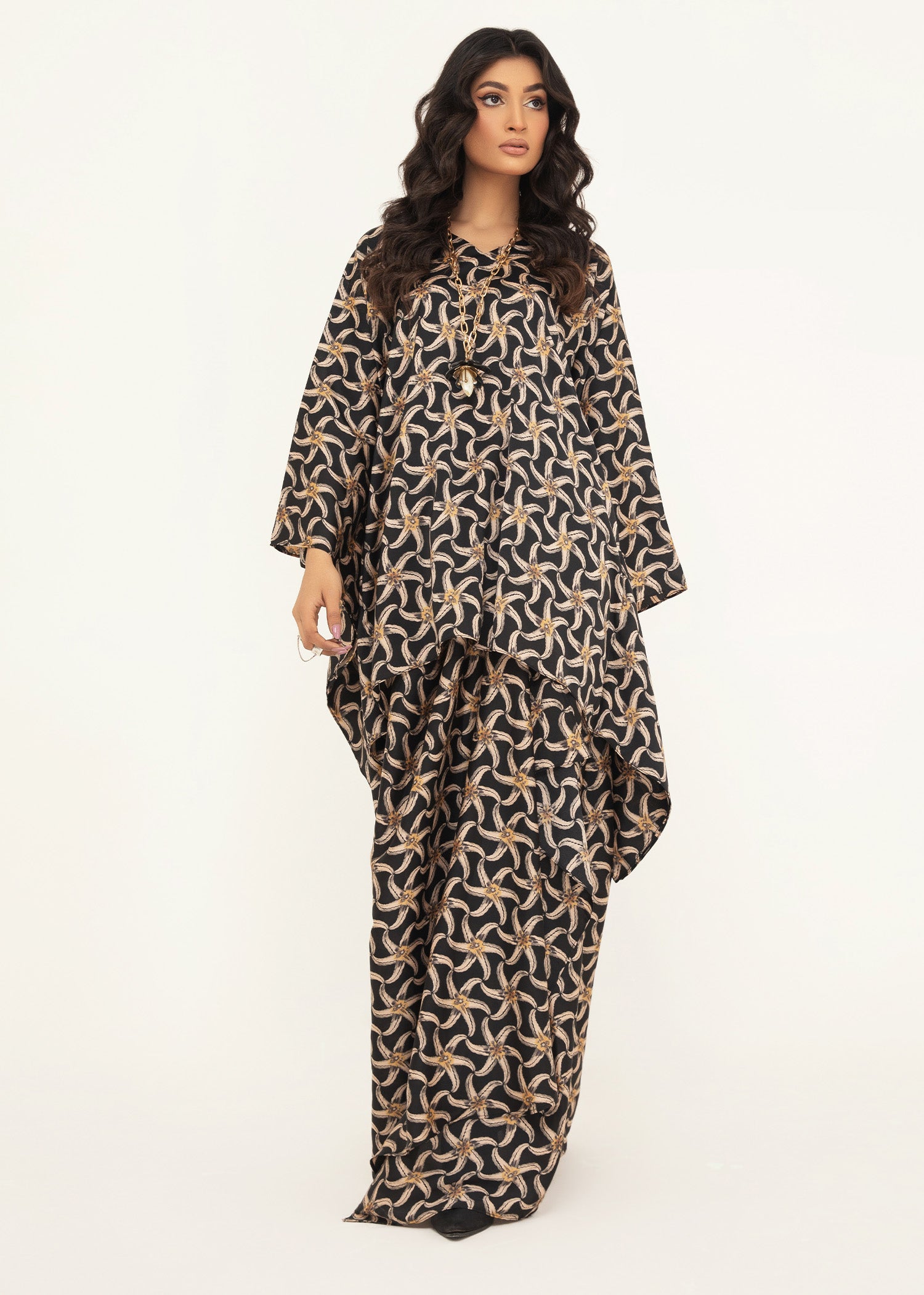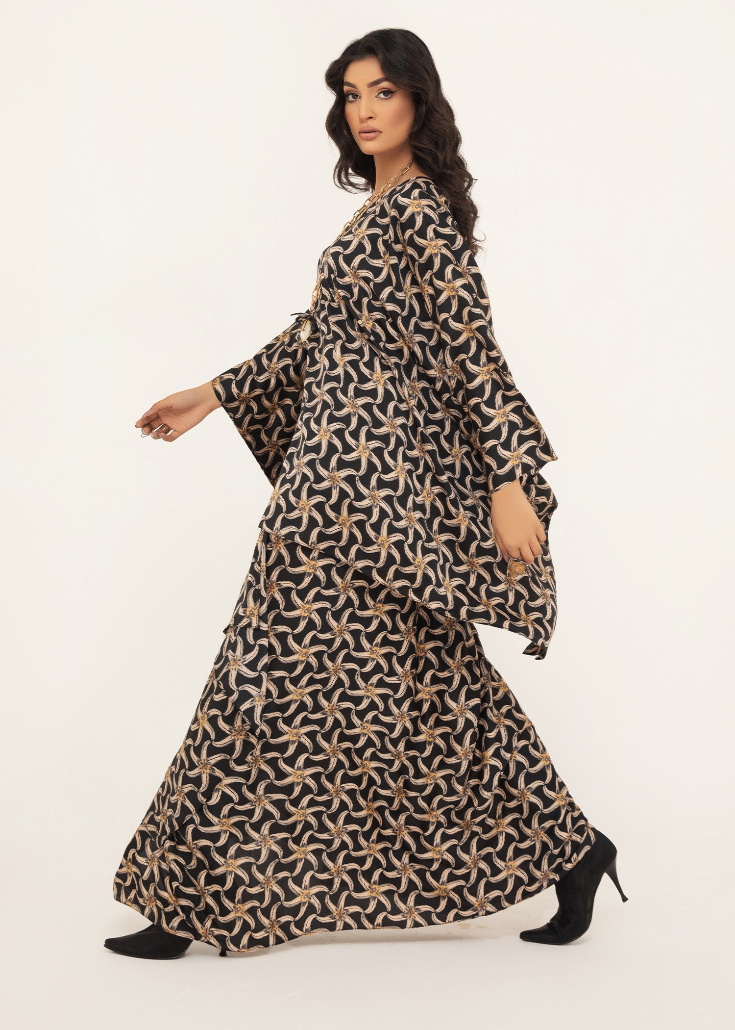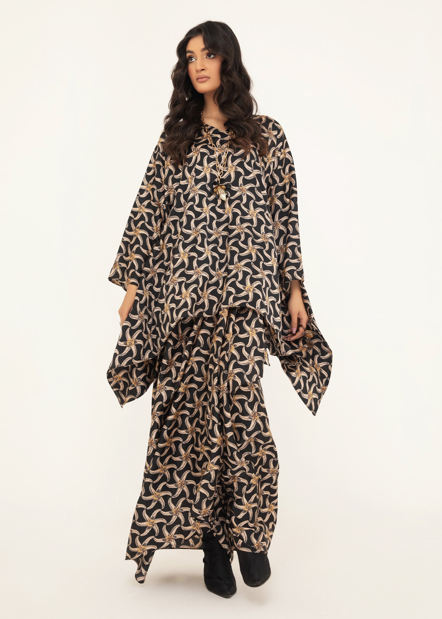 Printed drapped skirt paired with a short kaftan crafted in premium rod silk.