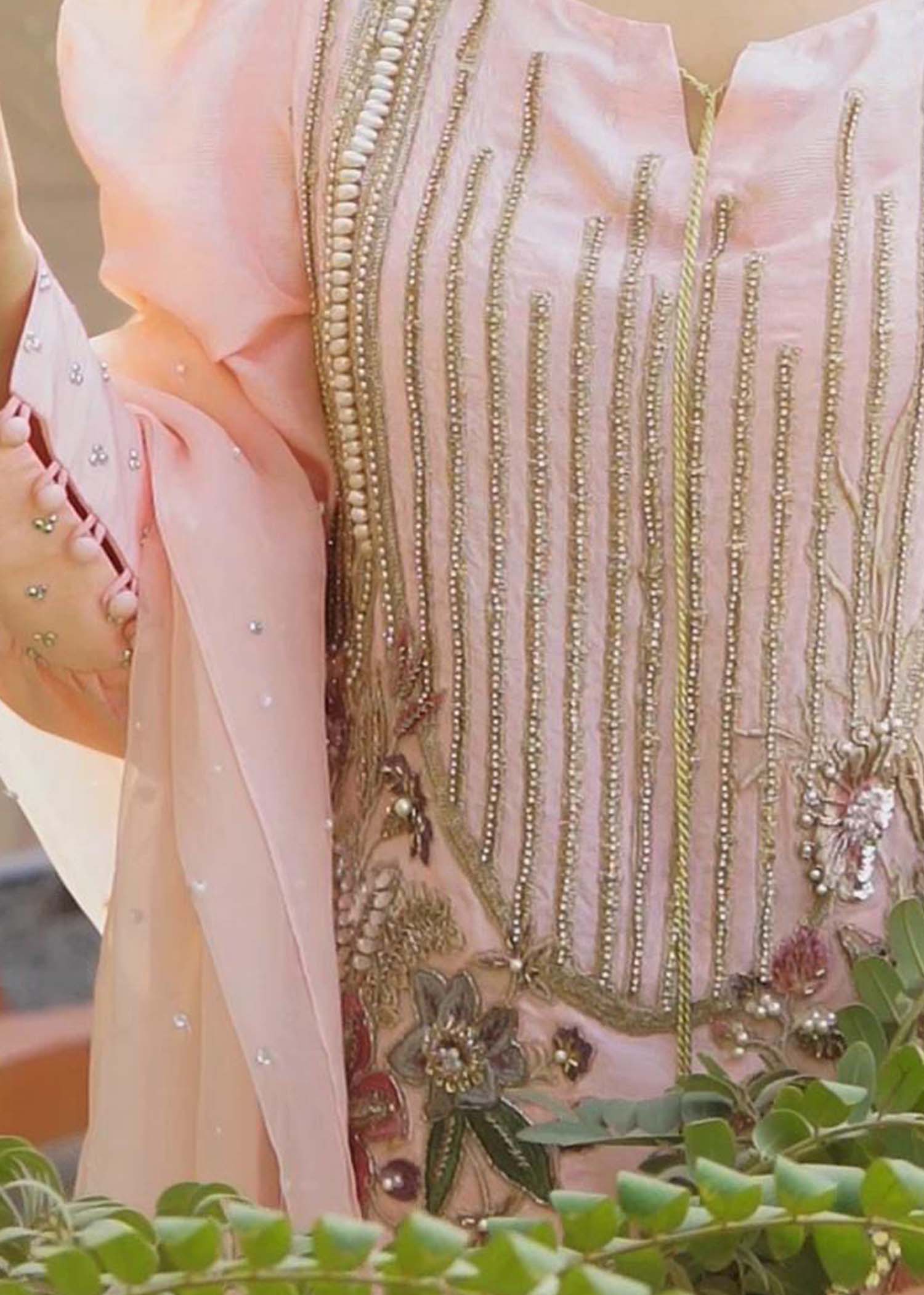 SERENE IS THE EPITOME OF REFINEMENT AND PURE CLASS ,CRAFTED WITH DIVNE DELICACY.SHIRT IS DESIGNED WITH KOREAN RAW SILK ,ORNAMENTED WITH FLORAL EMBROIDERY ,SOPHISTICATED HAND-WORK ENHANCES THE ALLURE OF THIS OUTFIT.PAIRED WITH A RAVISHING ORGANZA DUPATTA AND KOREAN RAW SILK PANTS.