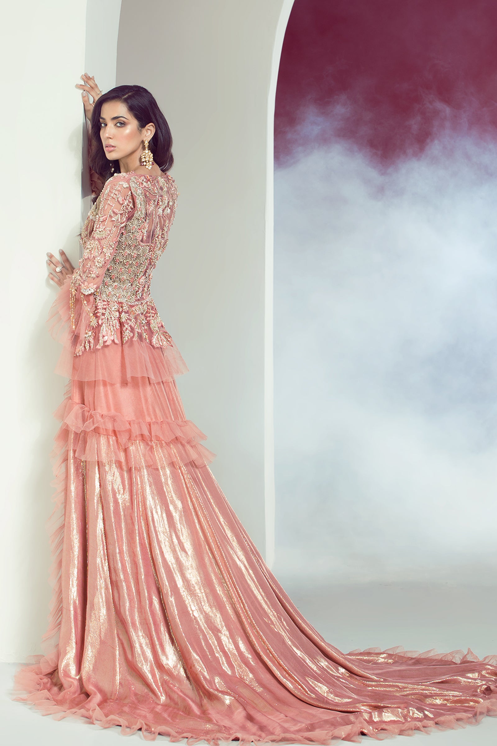 A heavy embroidered and hand embellished peplum enhanced with sequins, dabka, pearls & nakshi. Paired with a shimmer asymmetrical skirt with net frills on it.