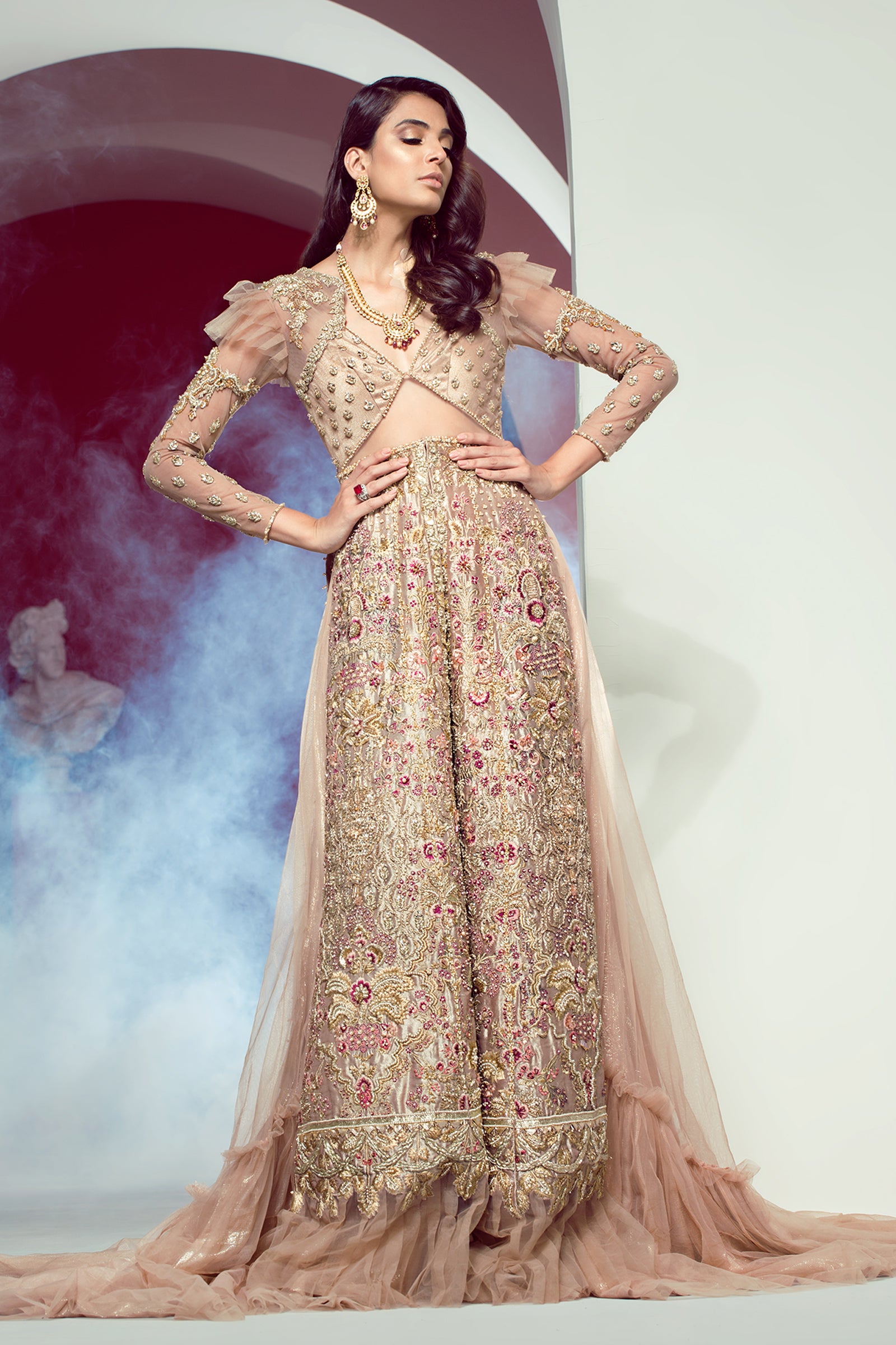 Beautiful powder pink tissue panneled shirt, enhanced with embroidery, crystals, nakshi and dabka work. Paired with a net skirt that is lined with pure shimmer to give more elaborate look.