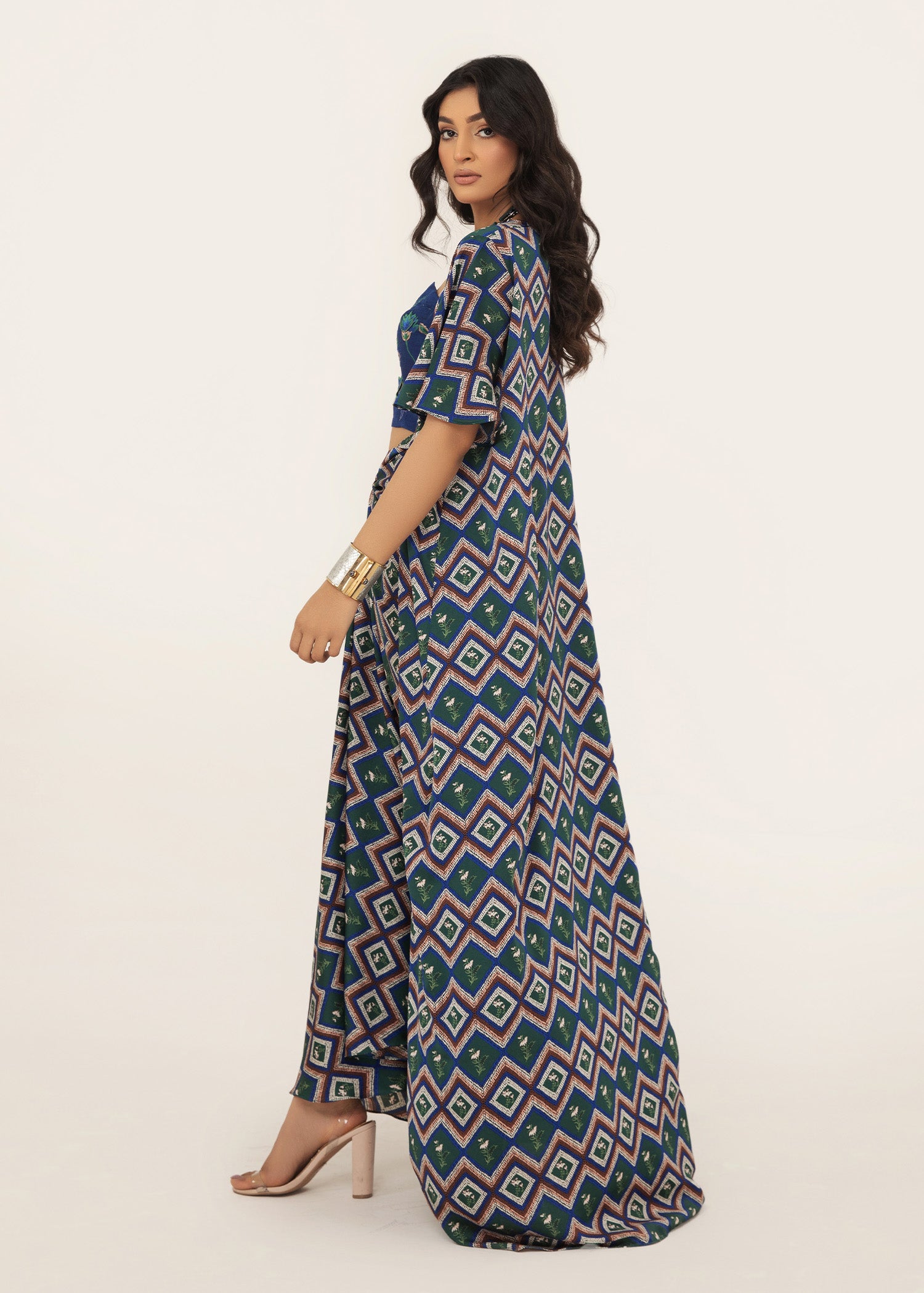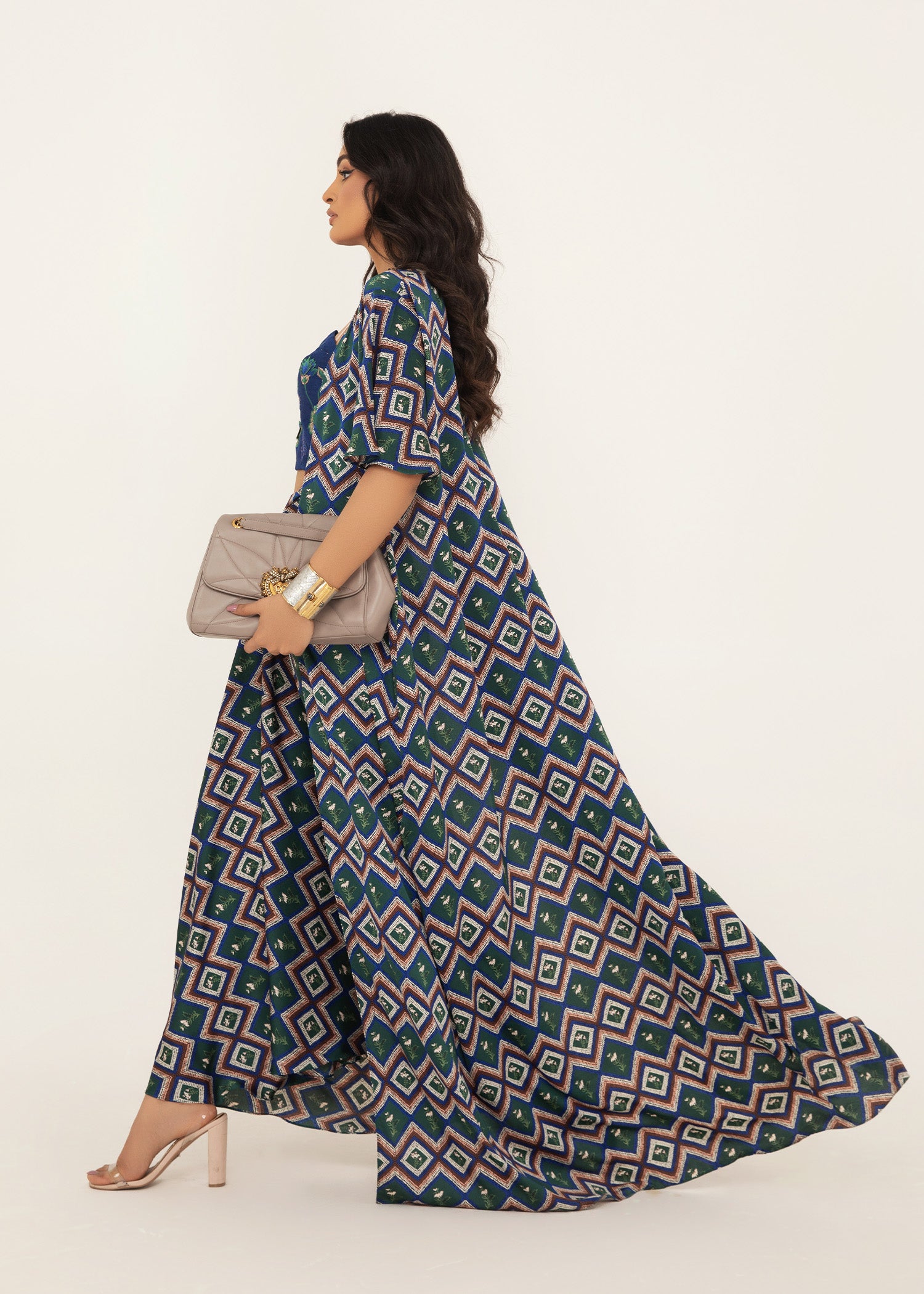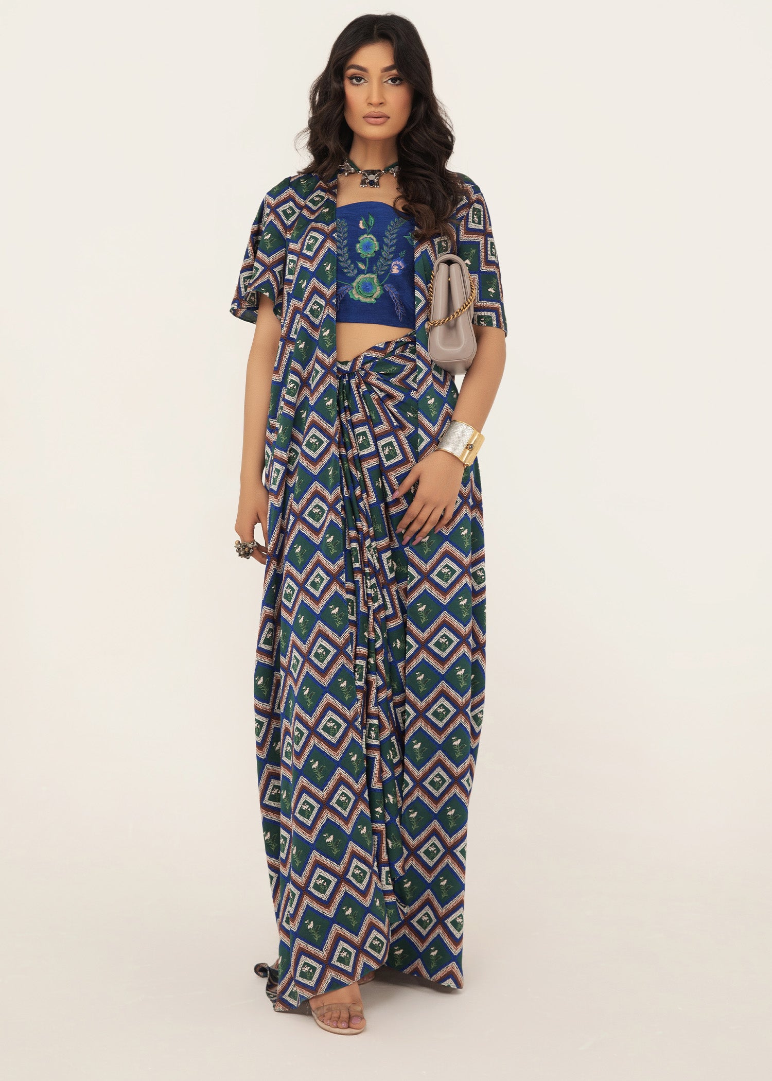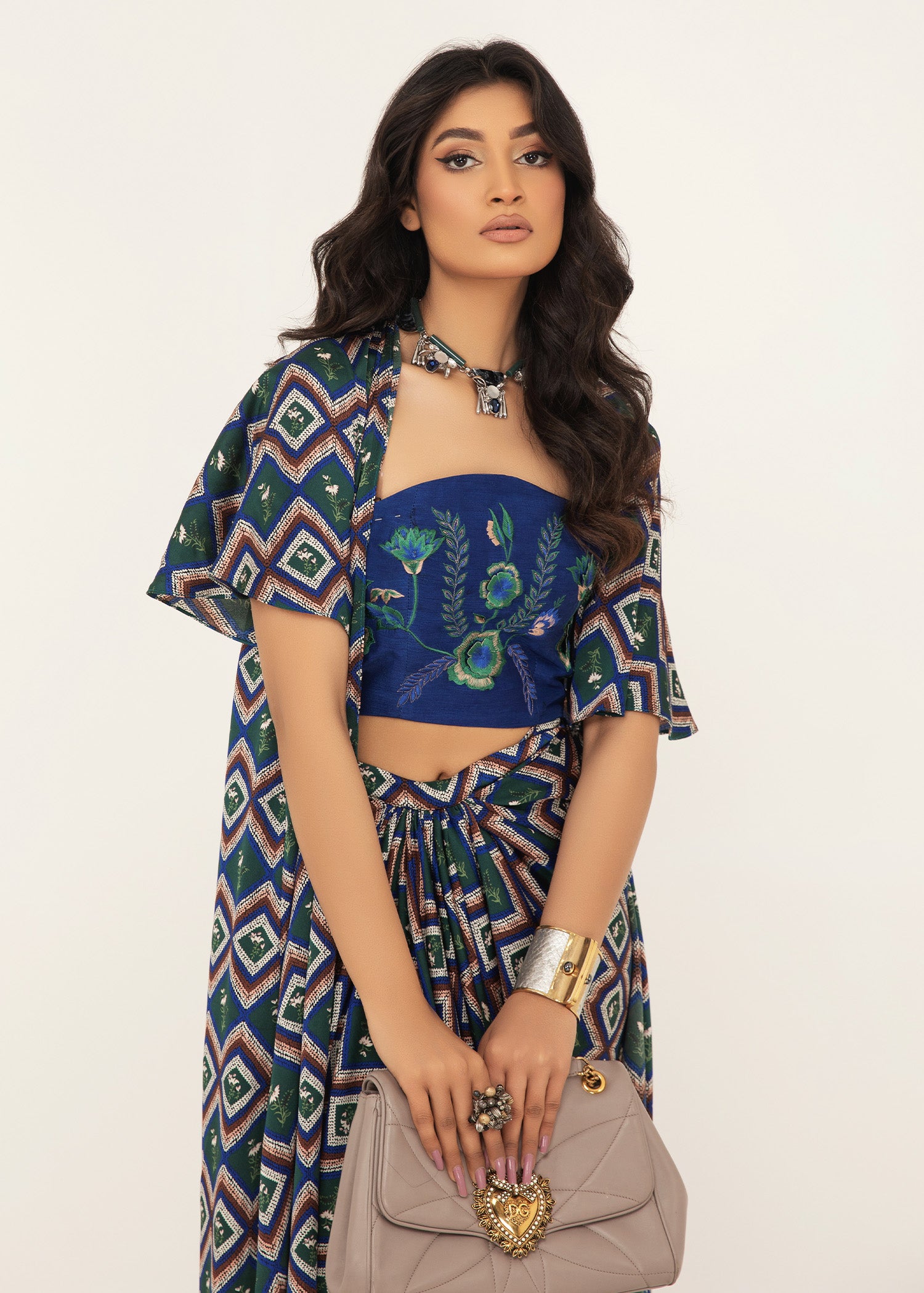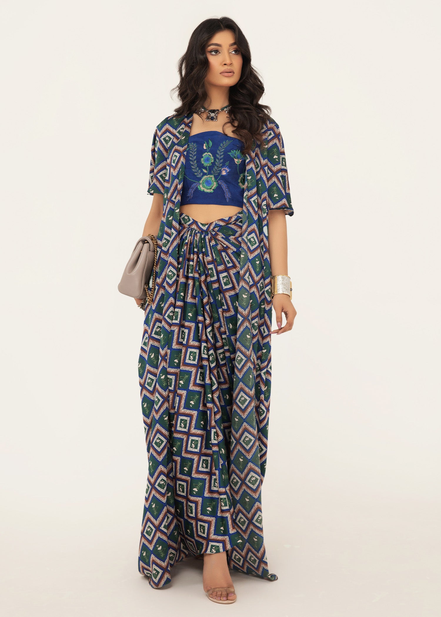 Digital printed draped skirt paired with an embroiderd bustier and a digital printed open gown with cape sleeves .