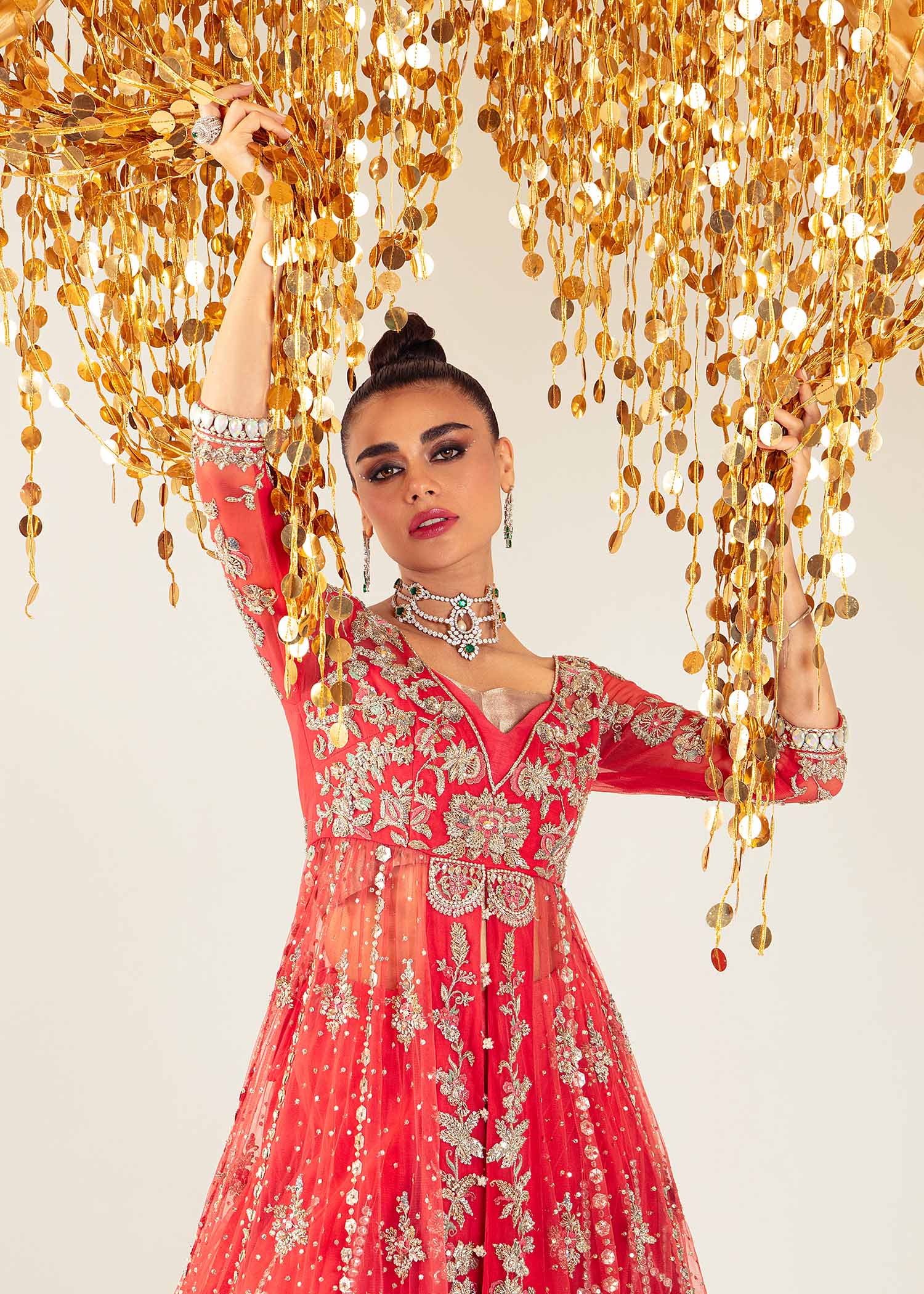 "A gorgeous pishwas in carrot red is enhanced with pink thread and silver resham. It is paired up with a net lehnga with floral motifs of tilla, sitara, and pani, along with a 3-yard-long net dupatta adorned with dabka, cora, and resham that is paired with an aqua chantelle lace shawl with a minimal Chan booti and Jamawar finish to give a complete look. For your big day, be quintessentially Shiza Hassan, opulent, and with a dash of magic."