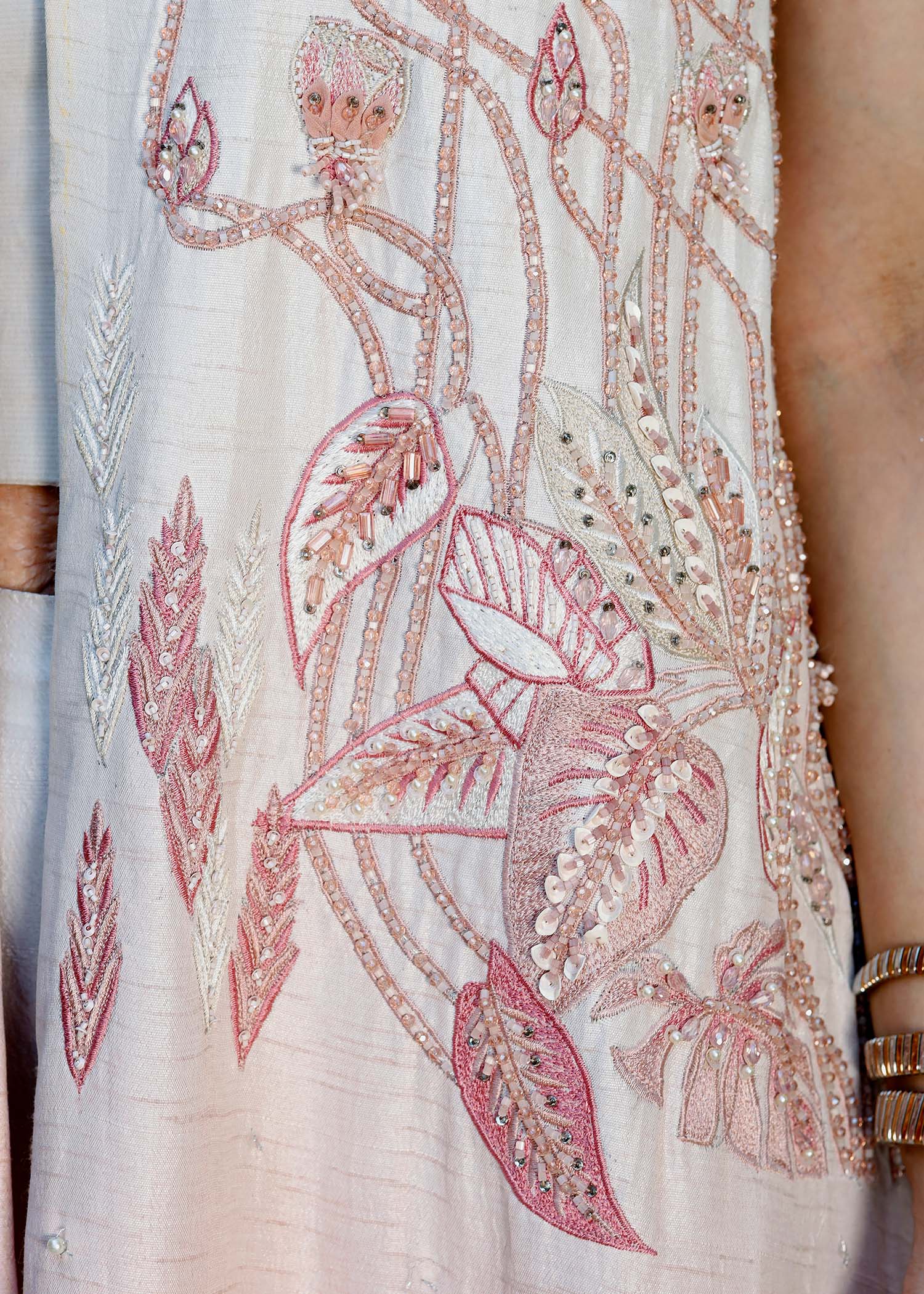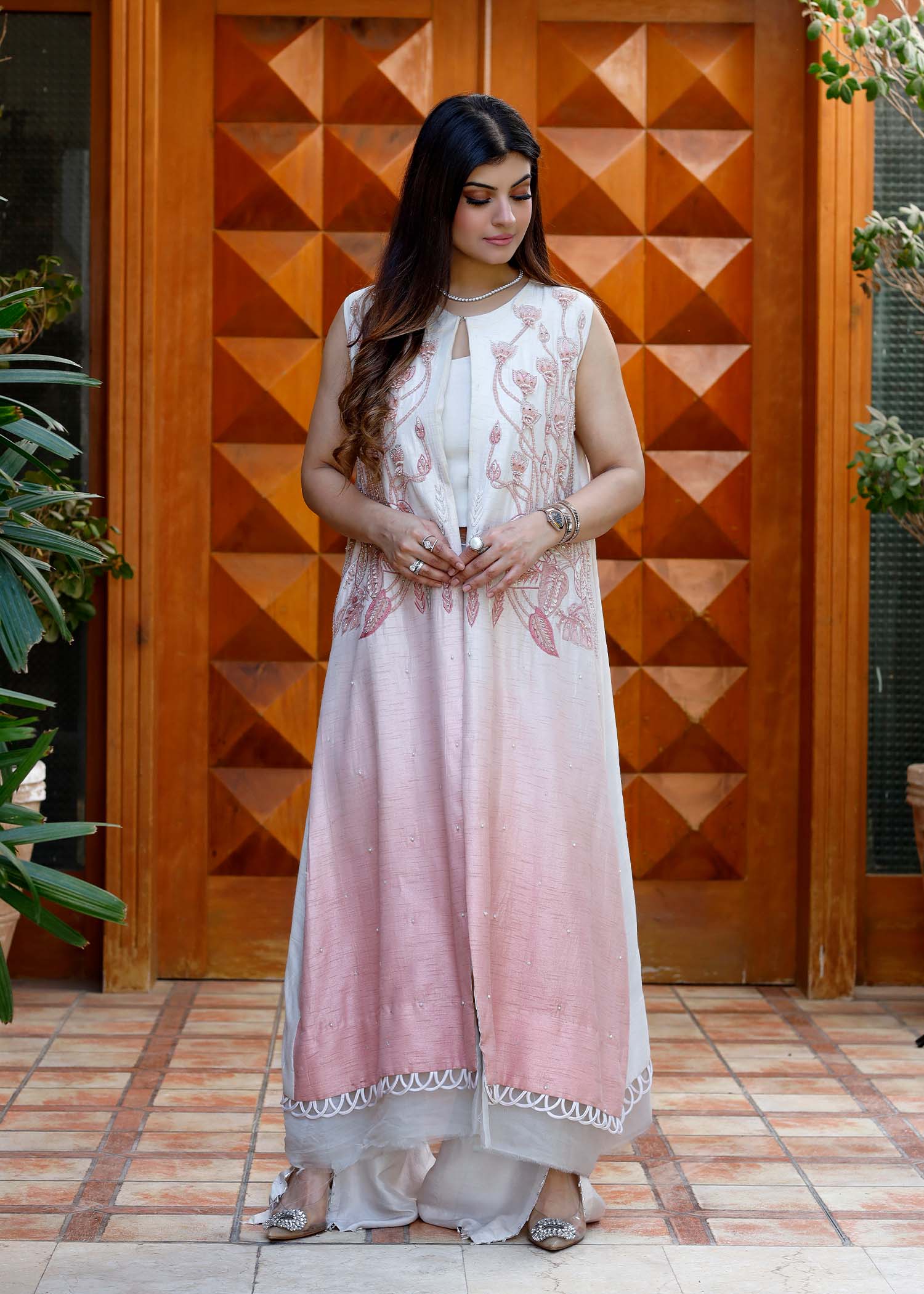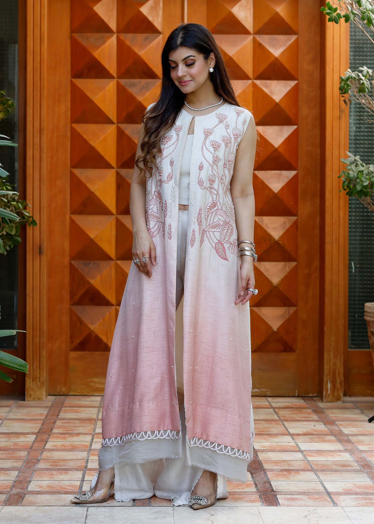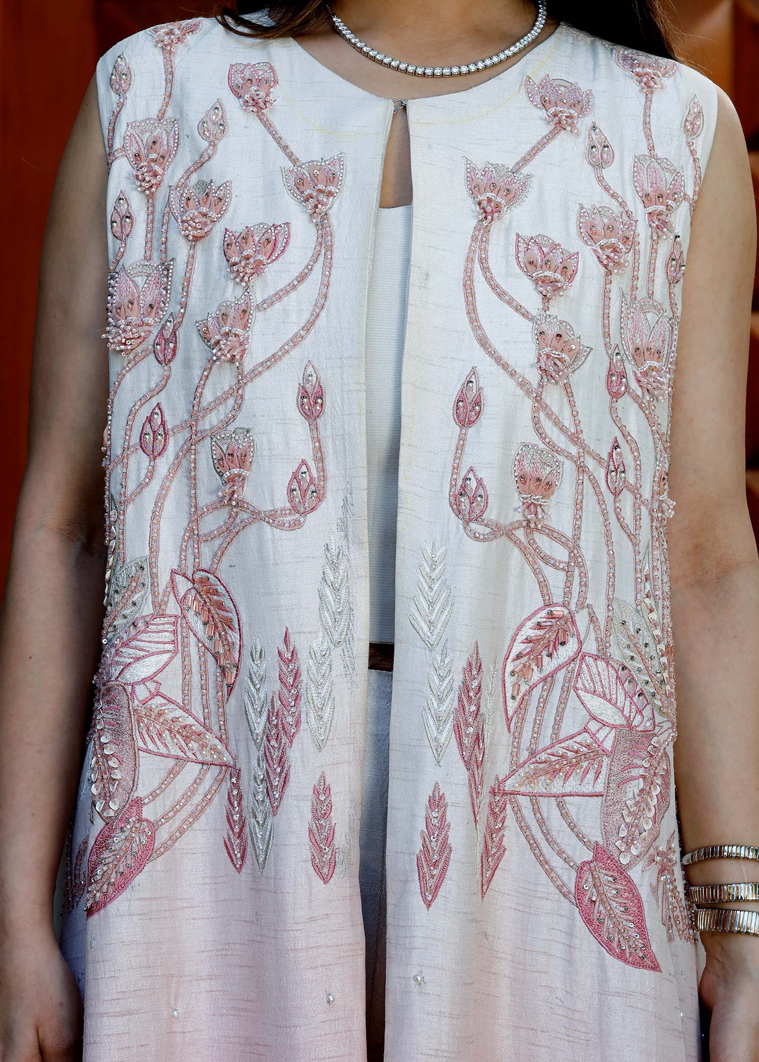 VERVE JACKET IS DETAILED WITH EMBROIDERIES , ADORNED WITH CRYSTALS AND PEARLS .STYLED WITH DELICATE ORGANZA FINSHING AND STITCHING DETAILS .BOOTCUT PANTS AND A HALTER NECK TOP IS ATTACHED TO COMPLETE THIS LOOK.