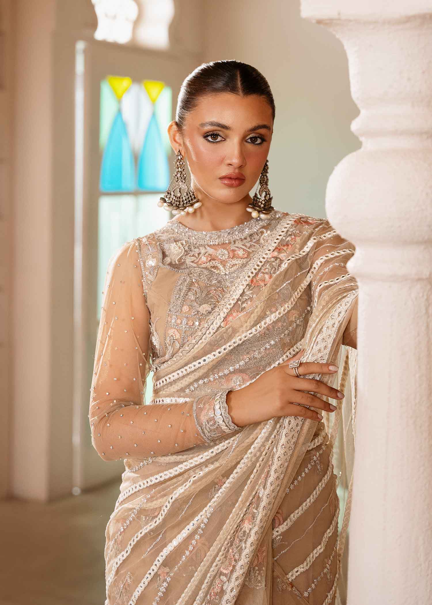 This truly exquisite Saree is a sure head turner this festive season. A rhapsody of ivory , intricately embellished with delicate classic SH embroidery just aposed with gleaming pearls sequence and panni work, enriched with exquisite crystals. Enhanced with alluring intricate embroideries and hand embellishments.